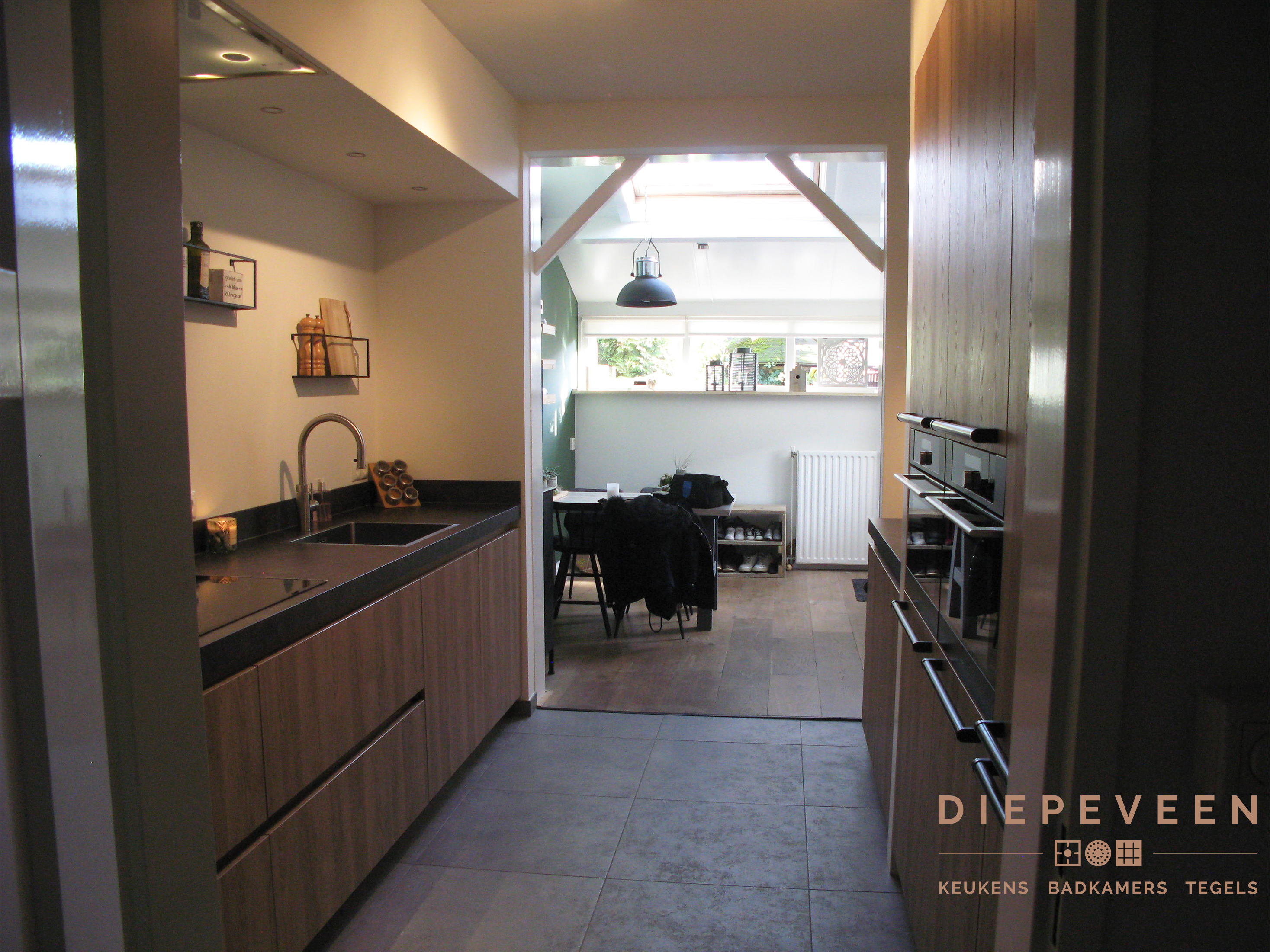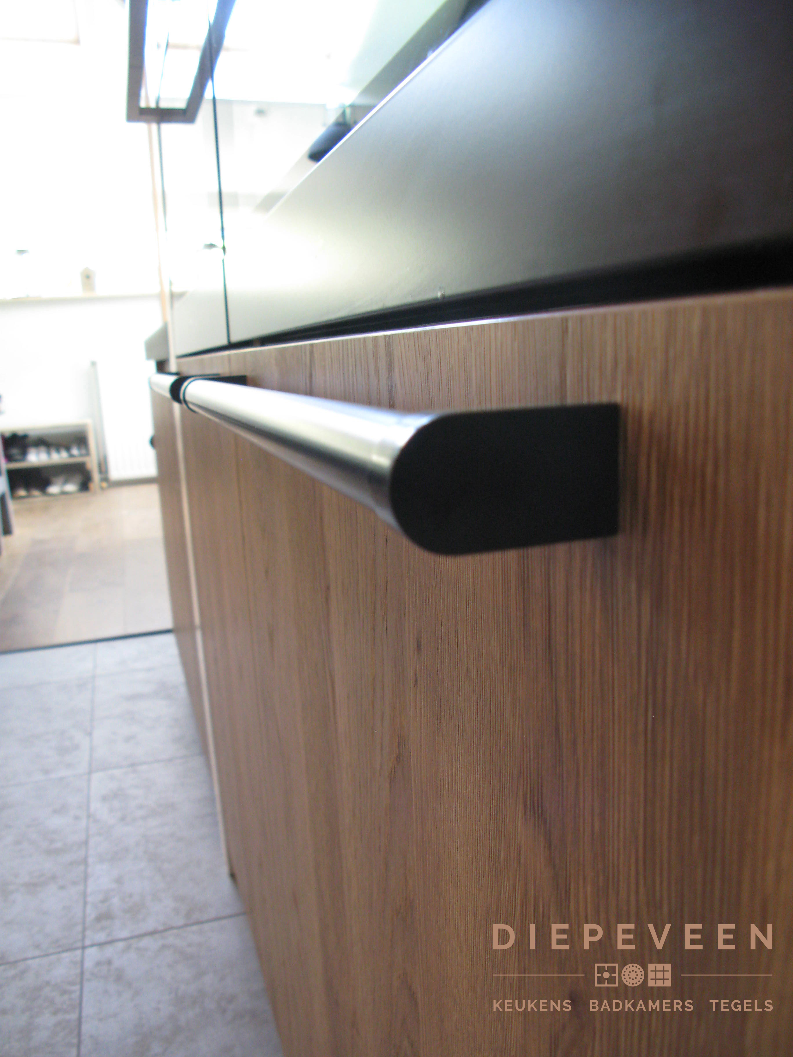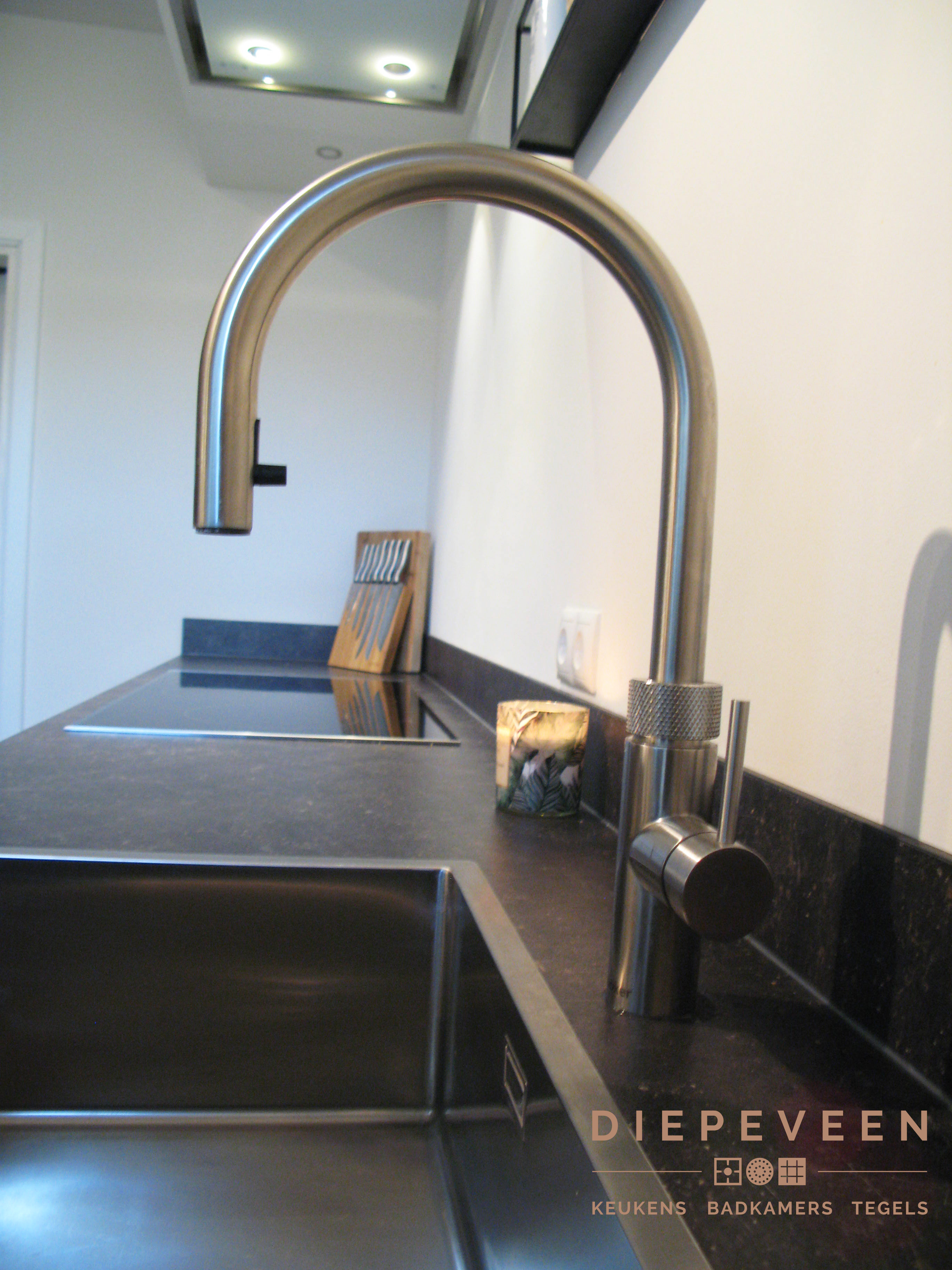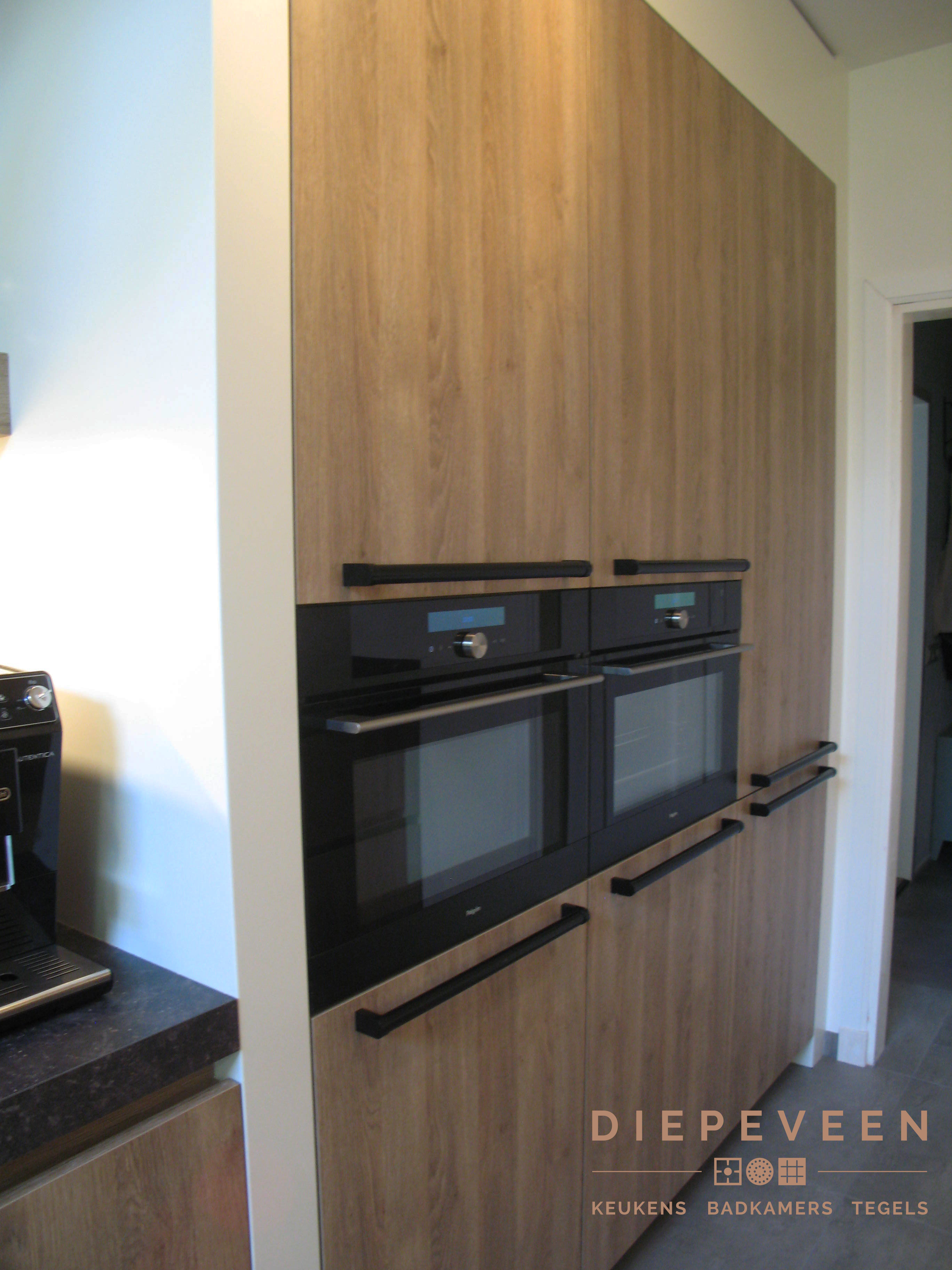 Een prachtige moderne leefkeuken. Prachtig gecombineerd met de zwarte hoge kasten.