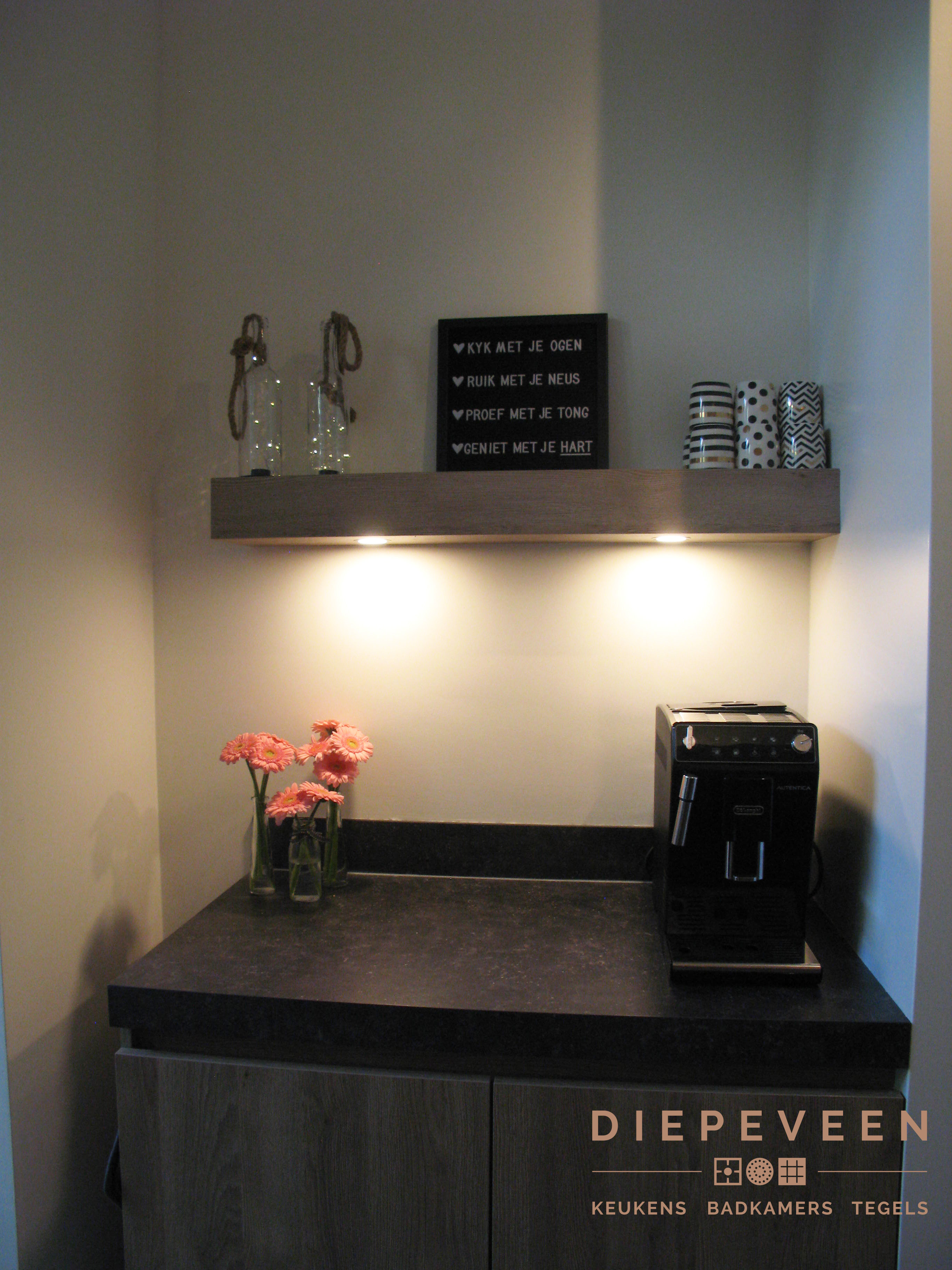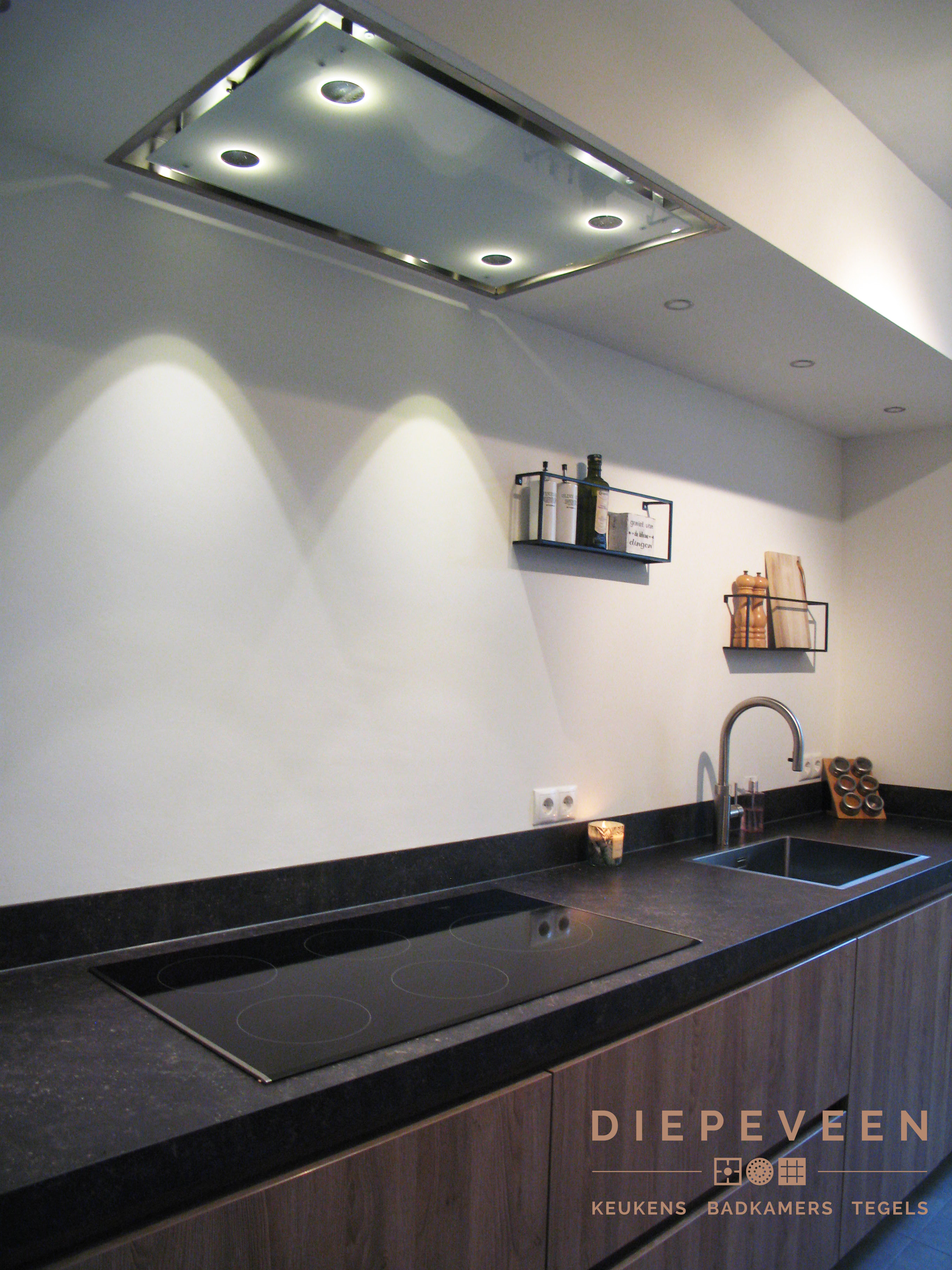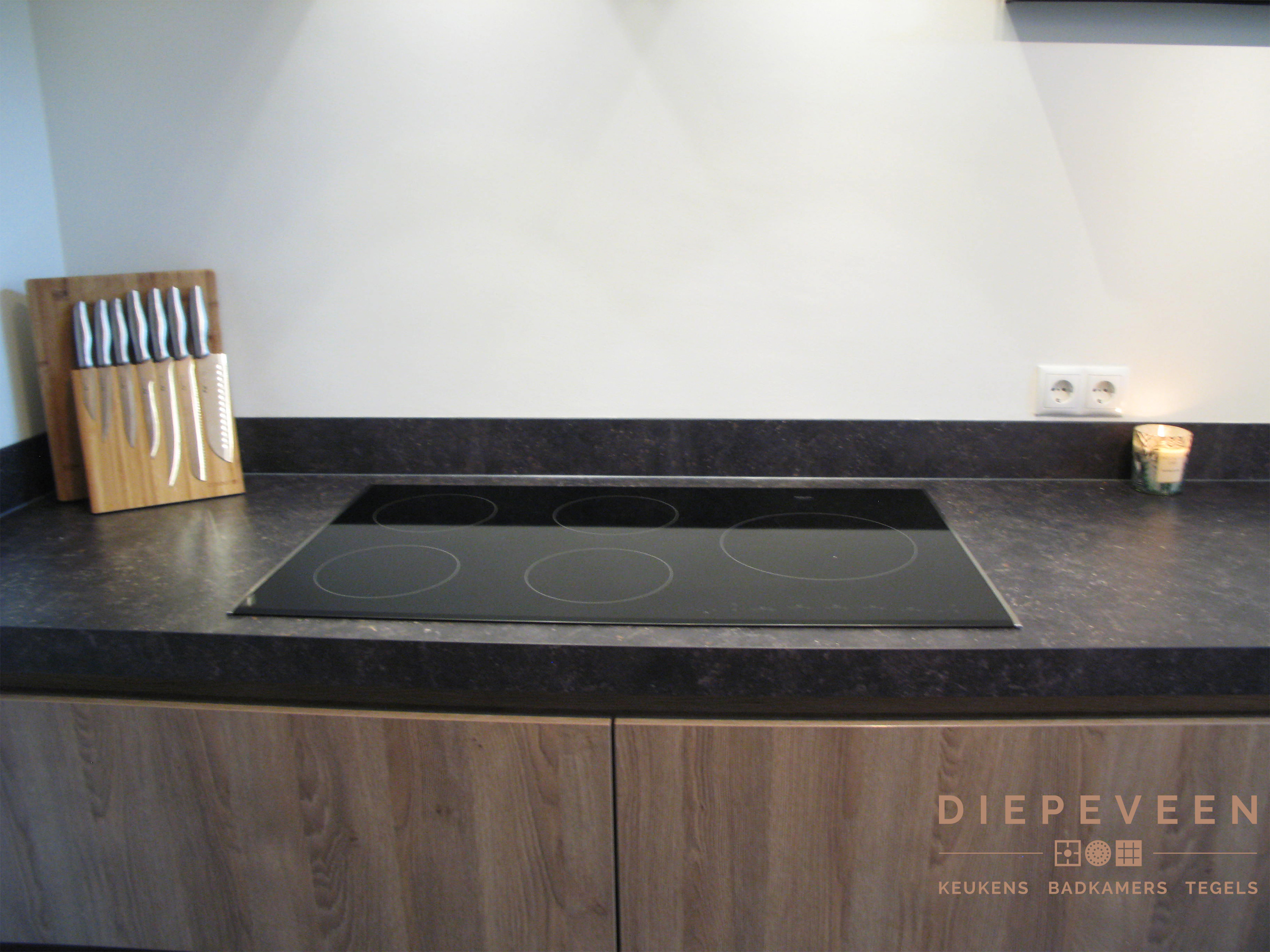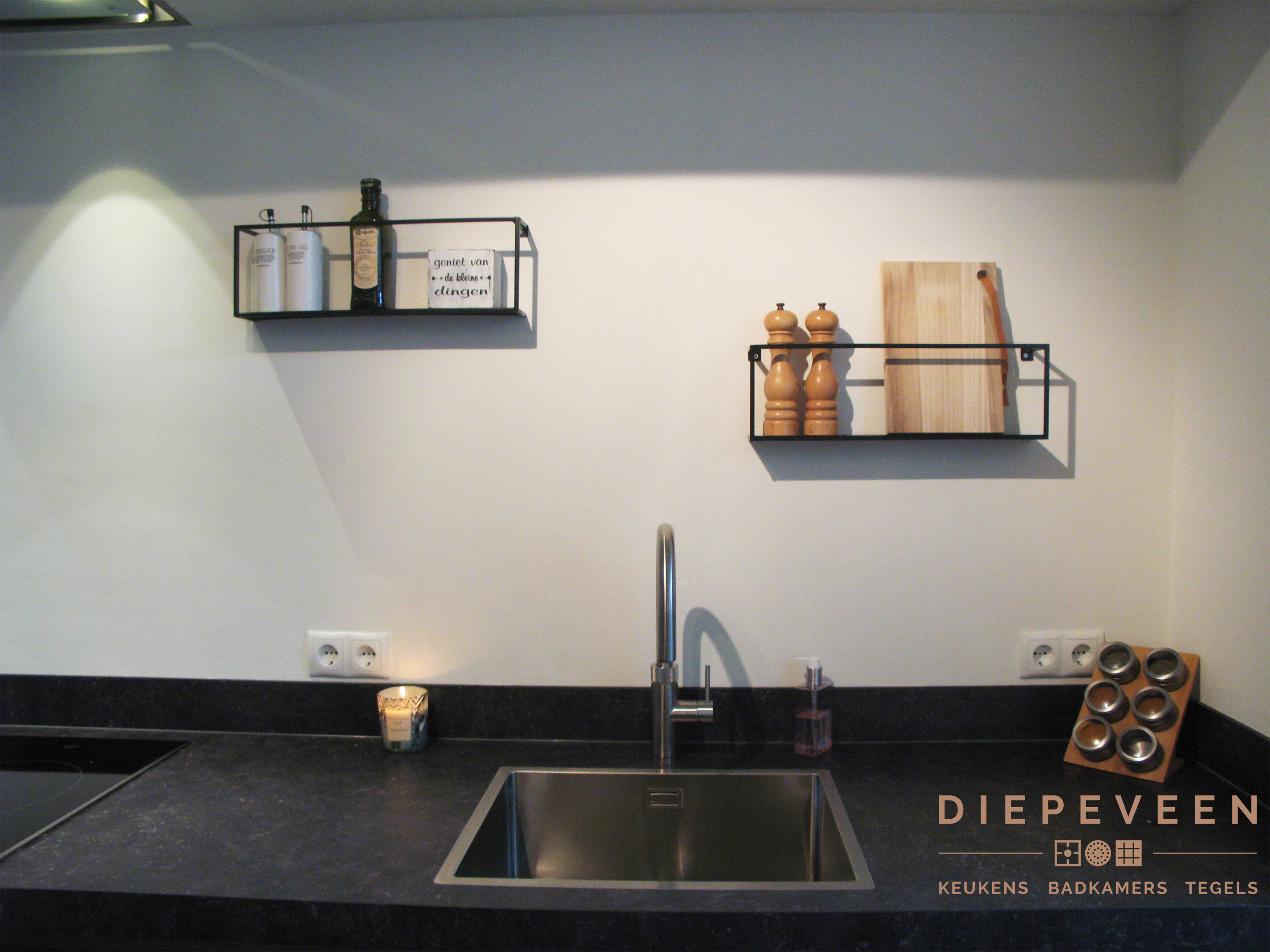 Een prachtige moderne leefkeuken. Prachtig gecombineerd met de zwarte hoge kasten.