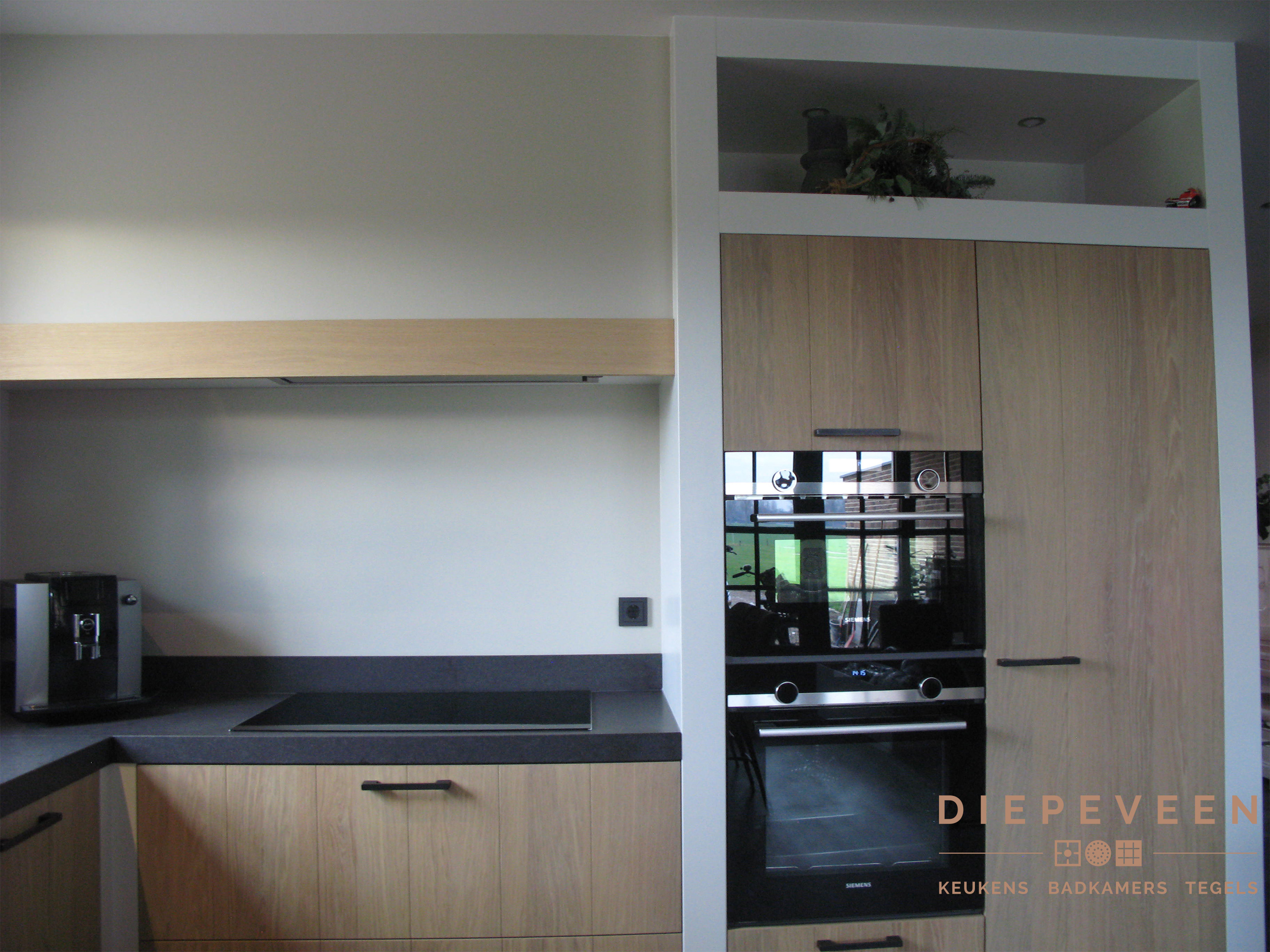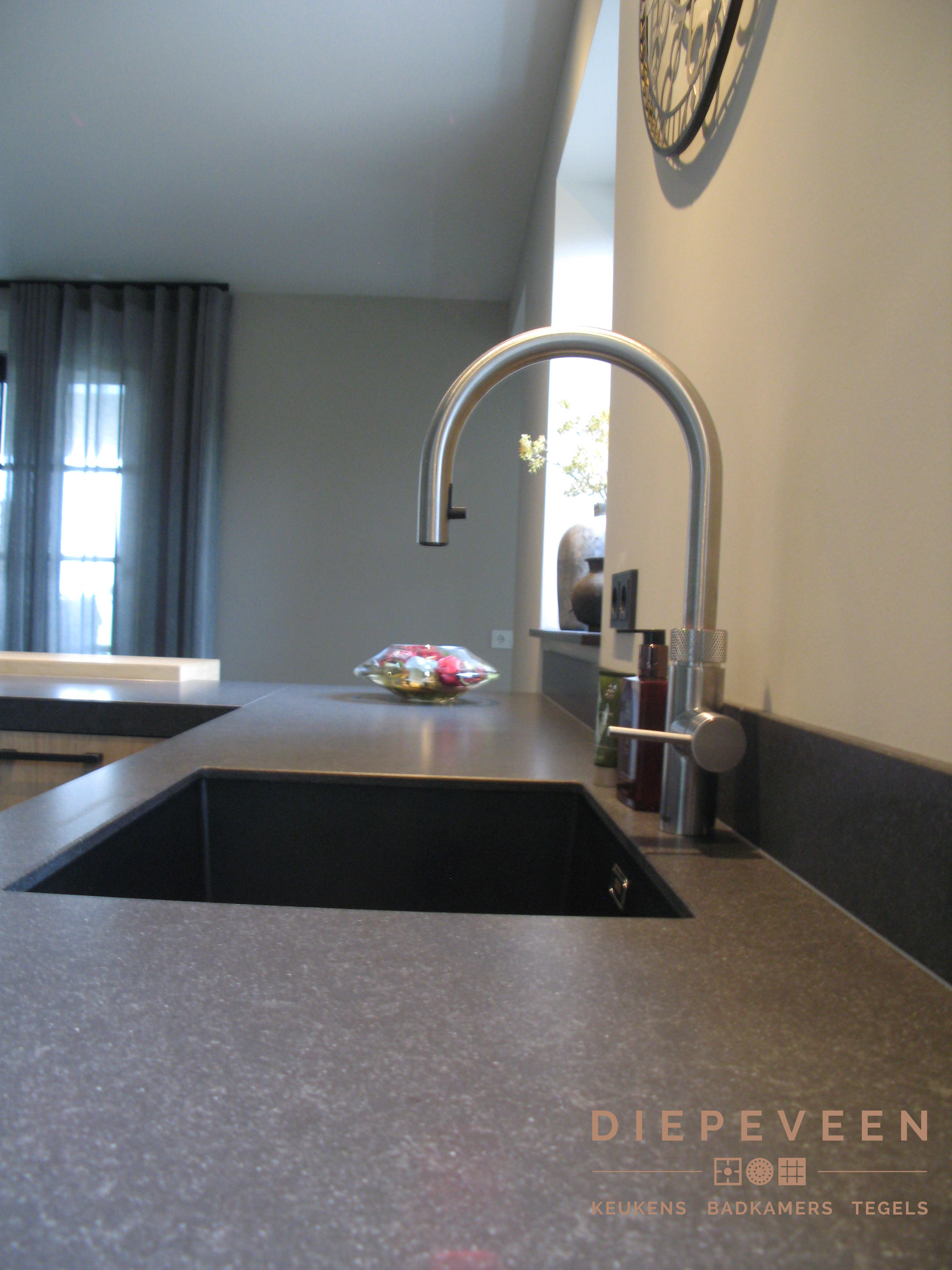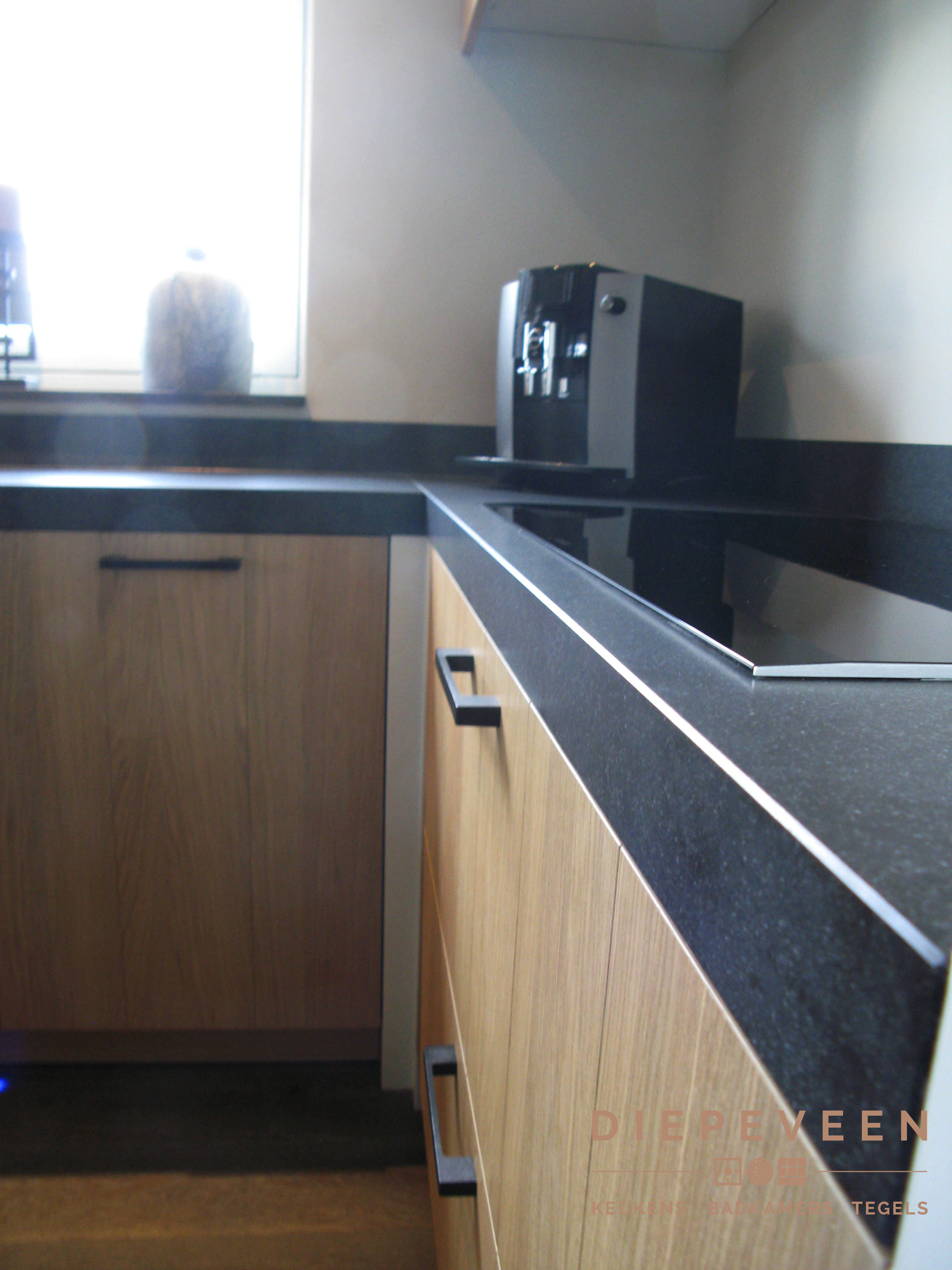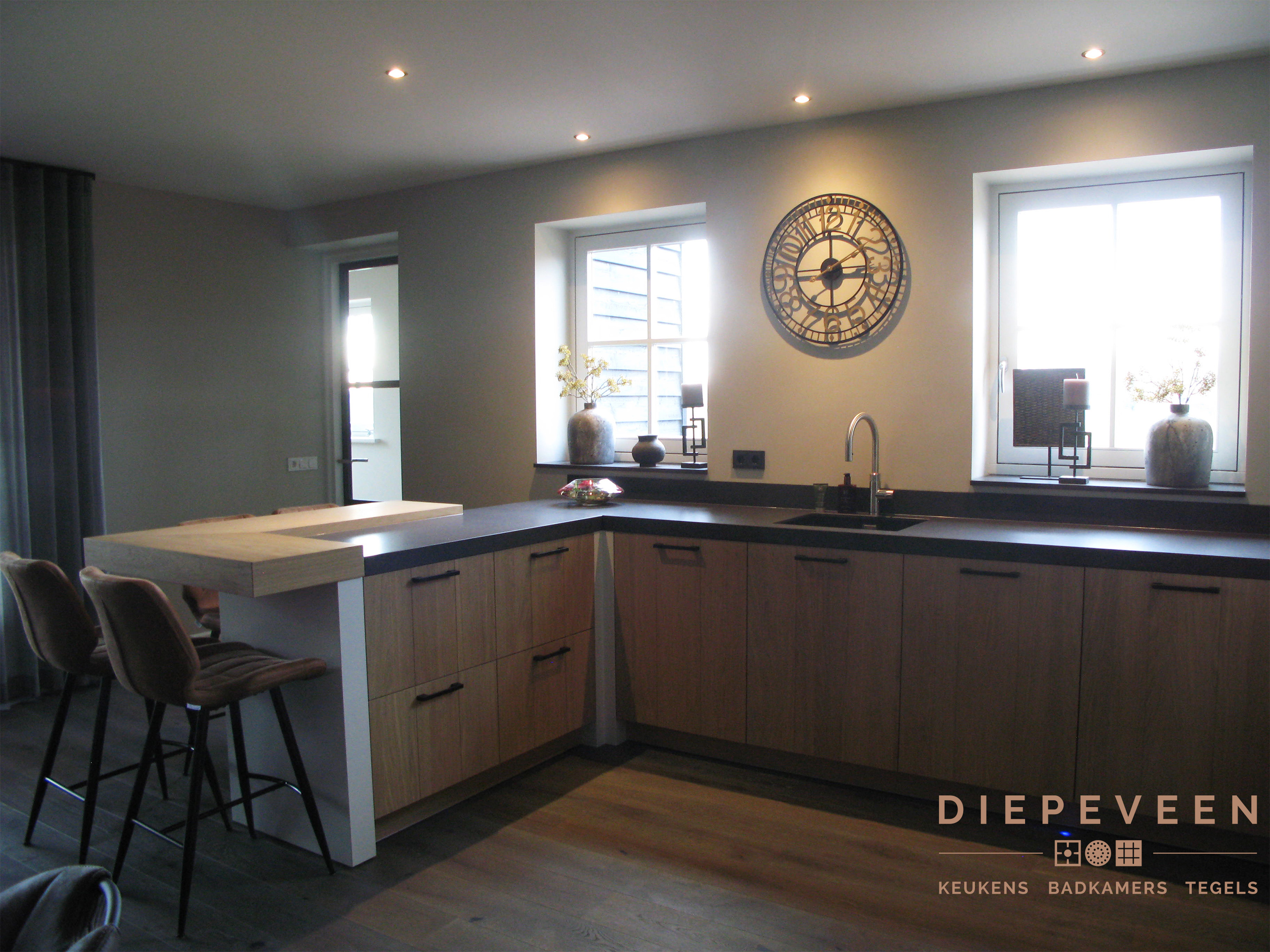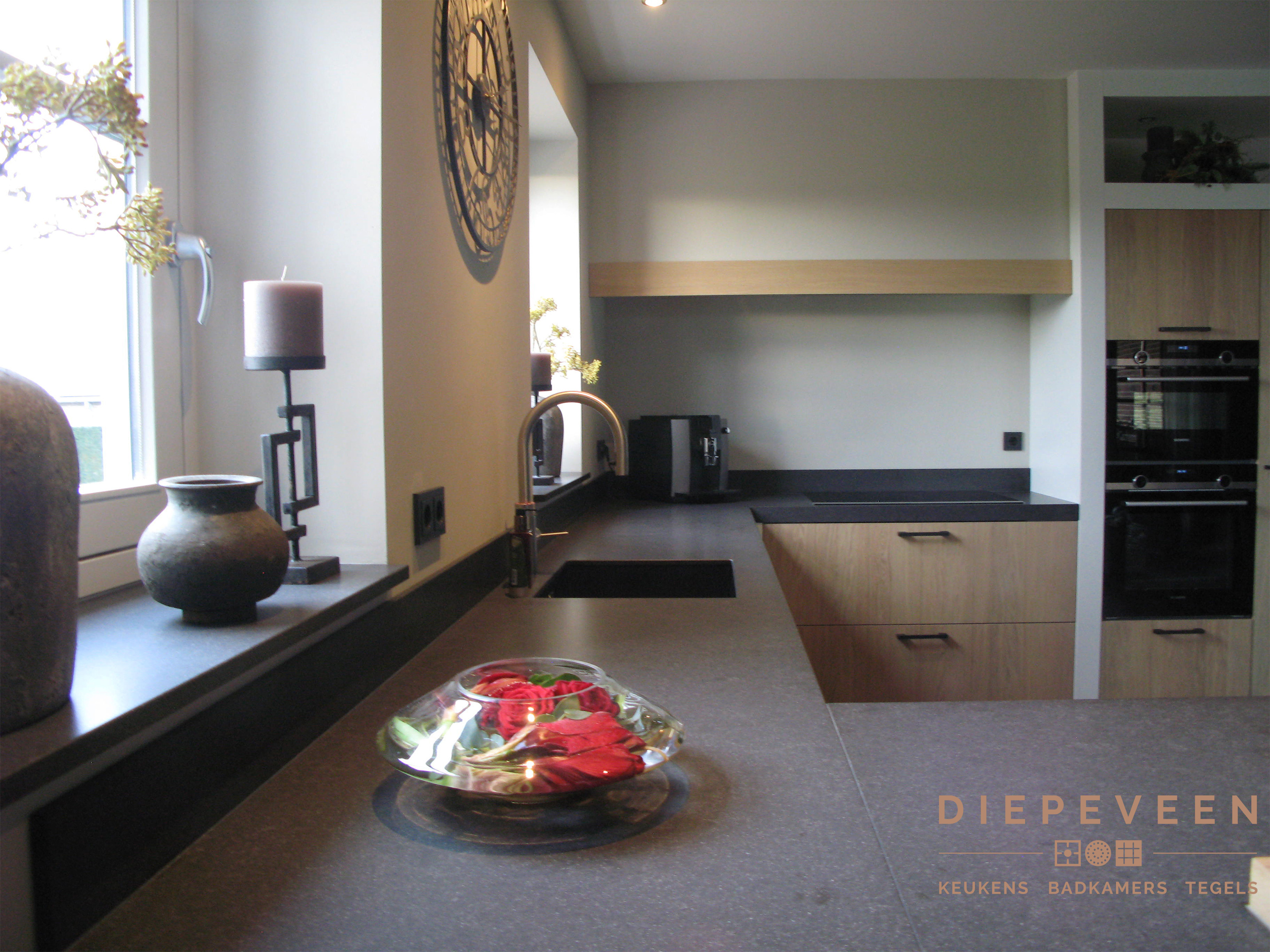 Een prachtige warme landelijke keuken voorzien van een massief eiken schouw en een keramiek werkblad.