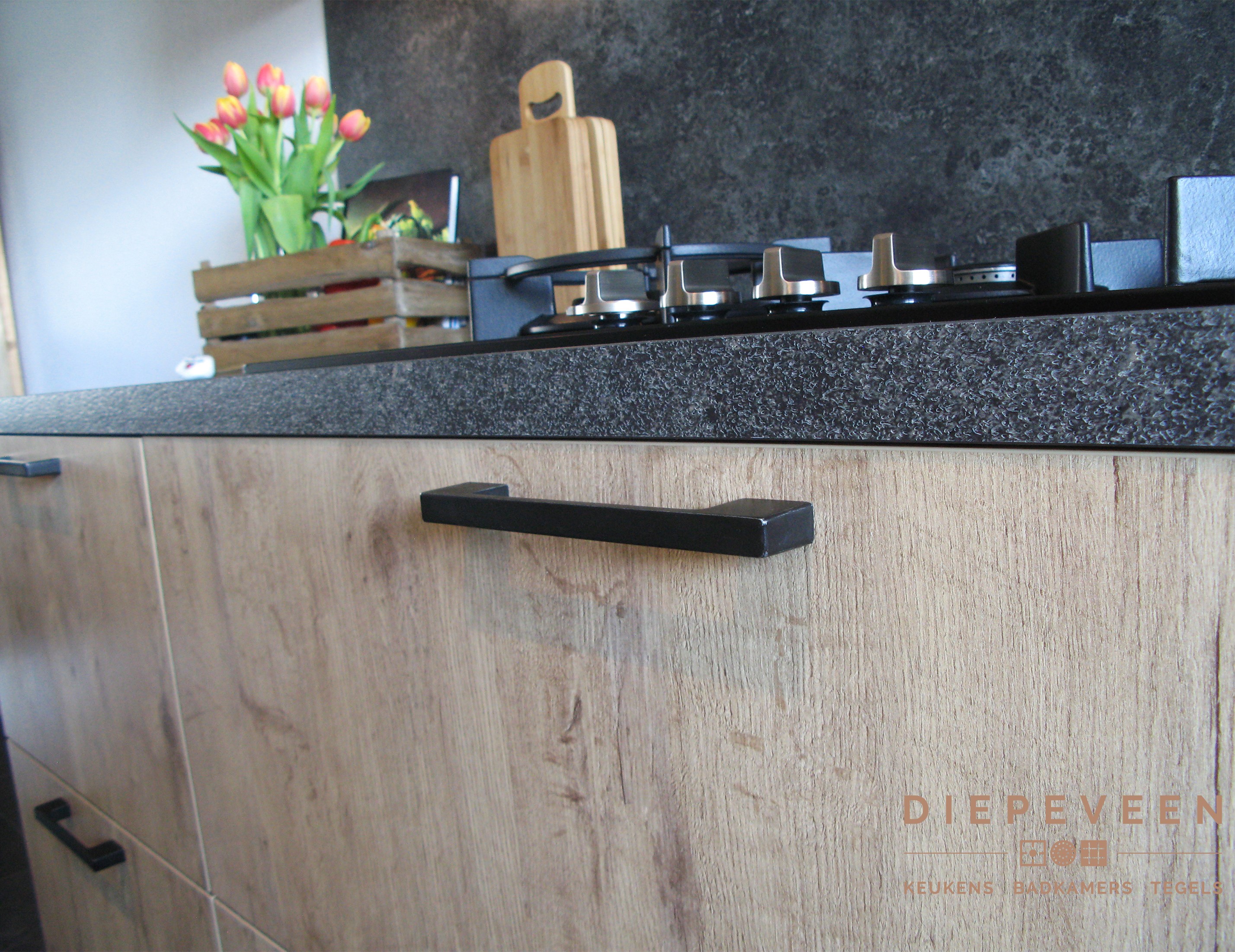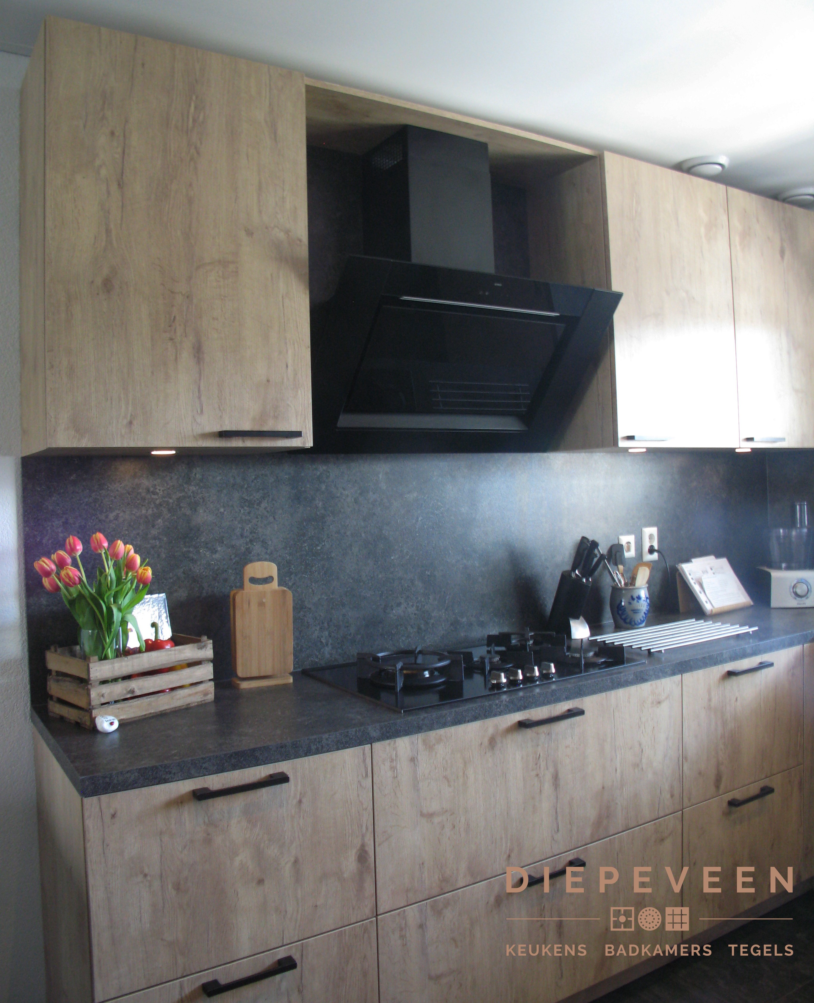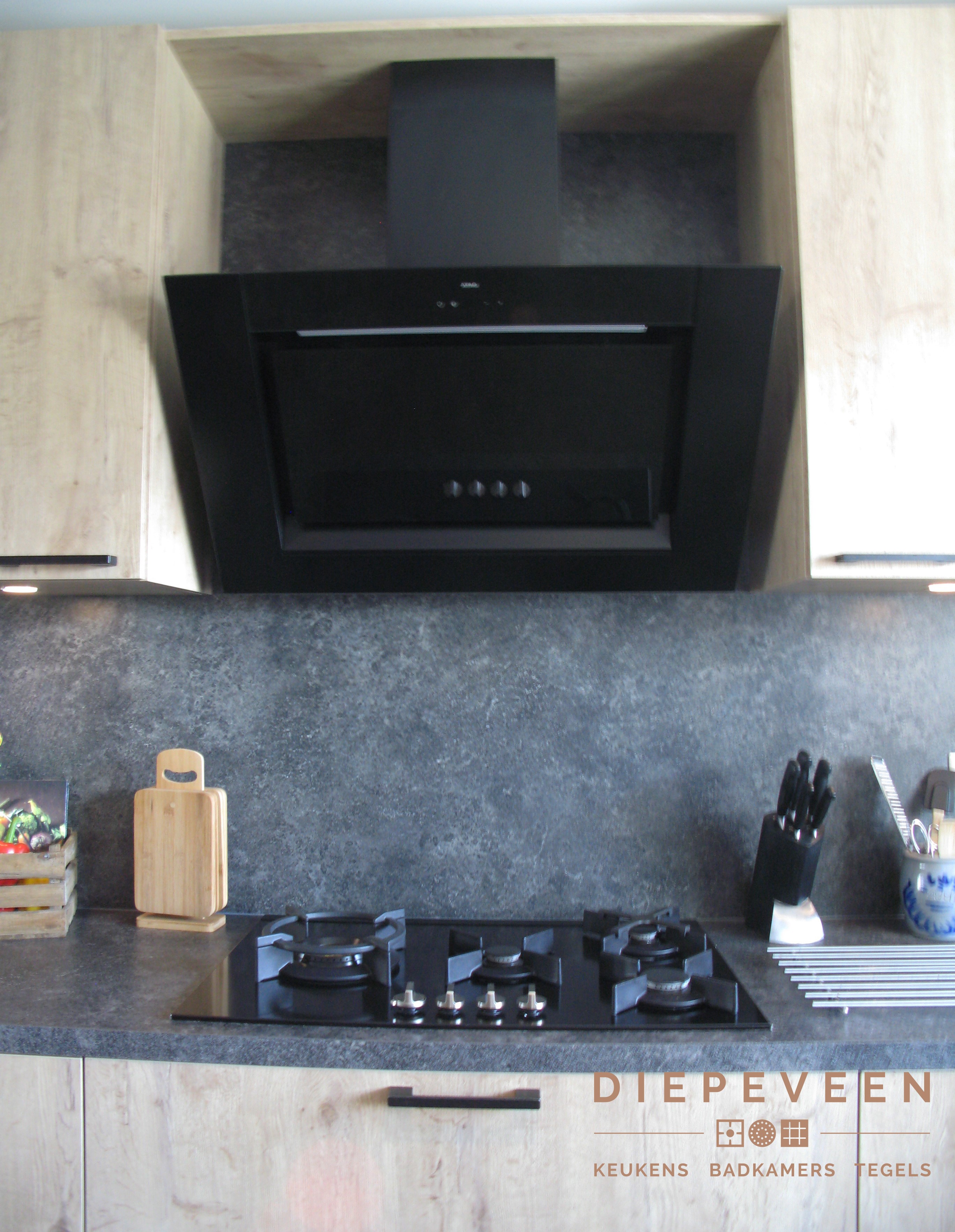 Een prachtige landelijke keuken. De zwarte grepen en het zwarte afzuigkap maken de keuken helemaal af.