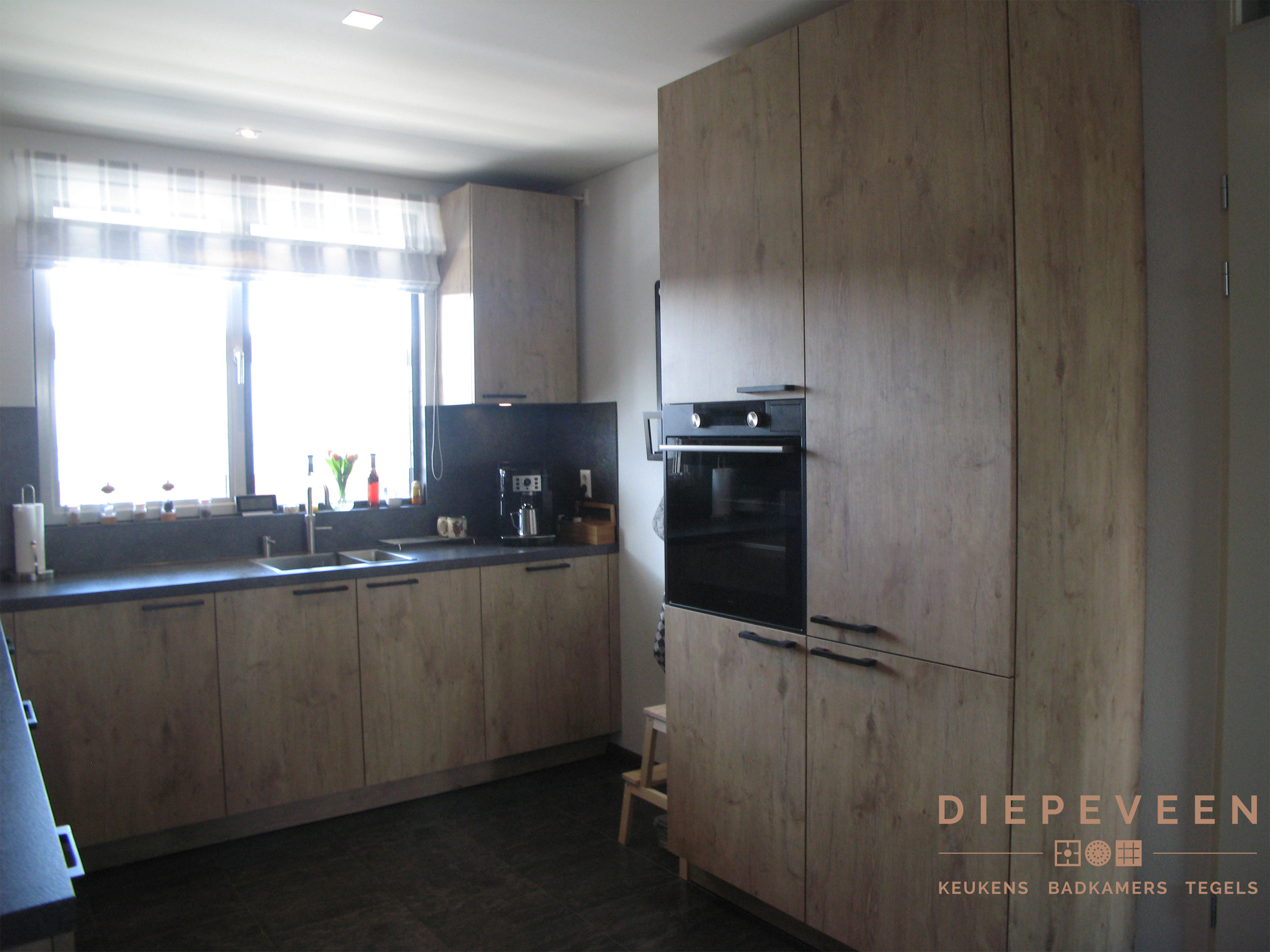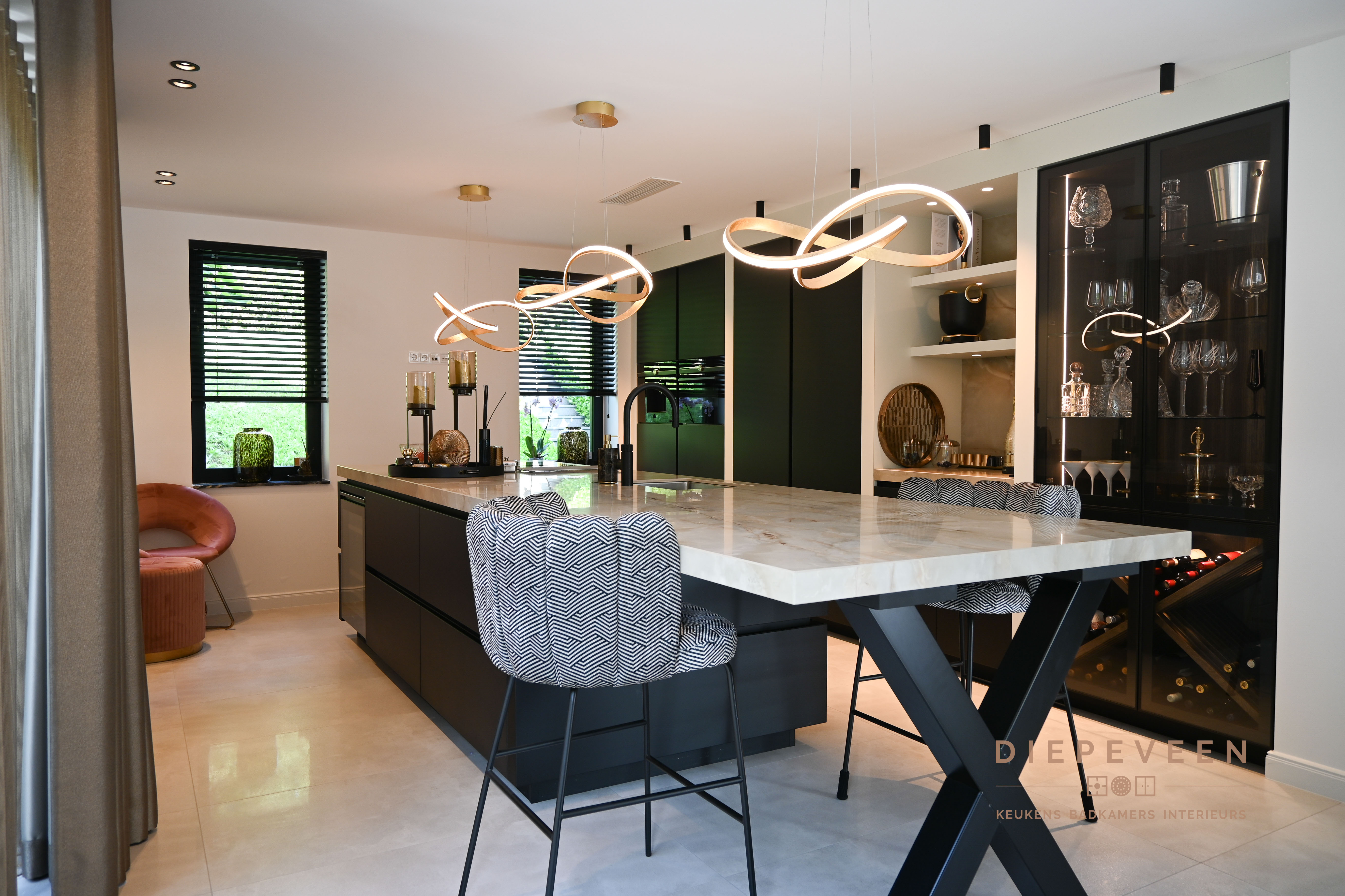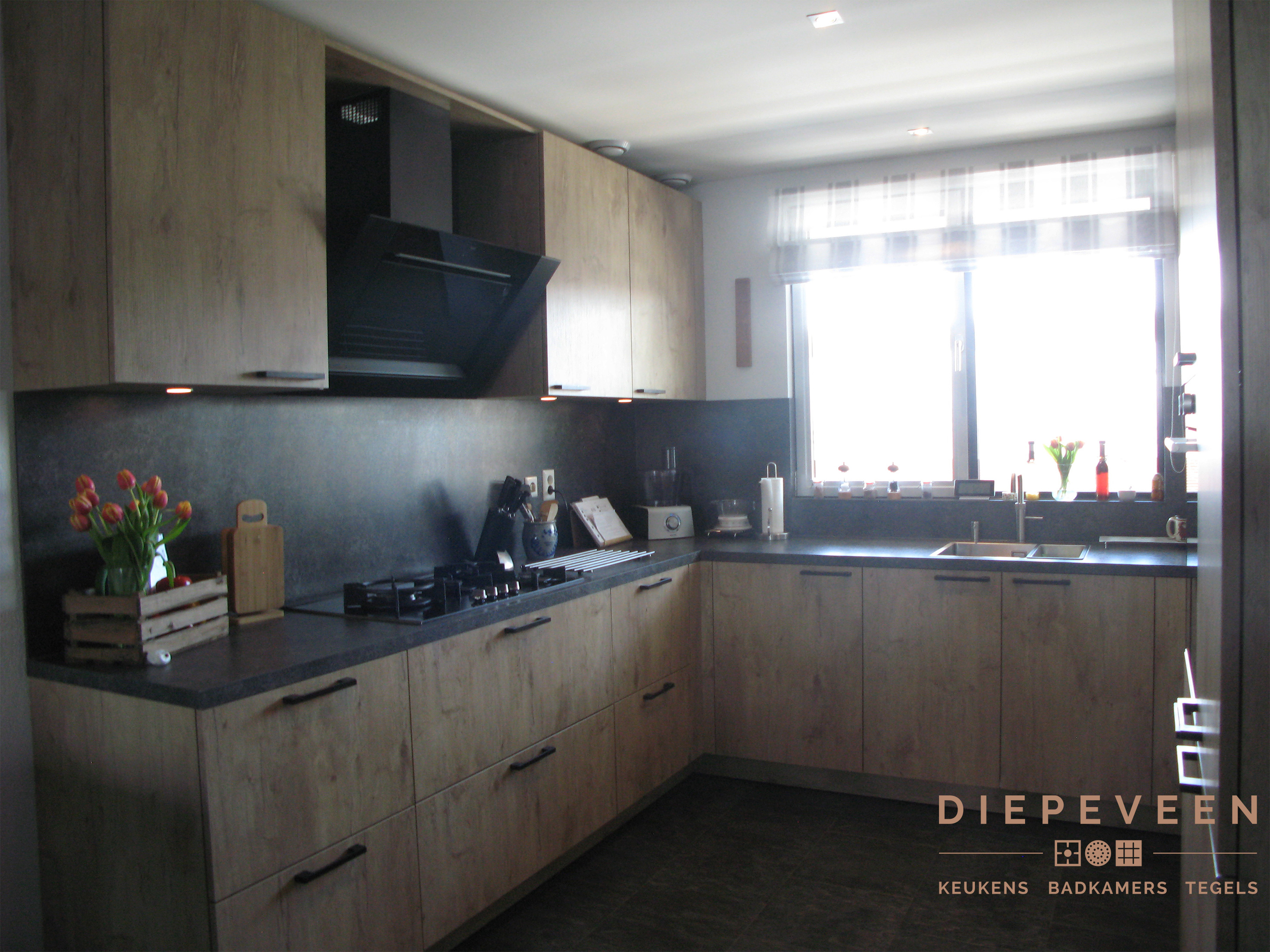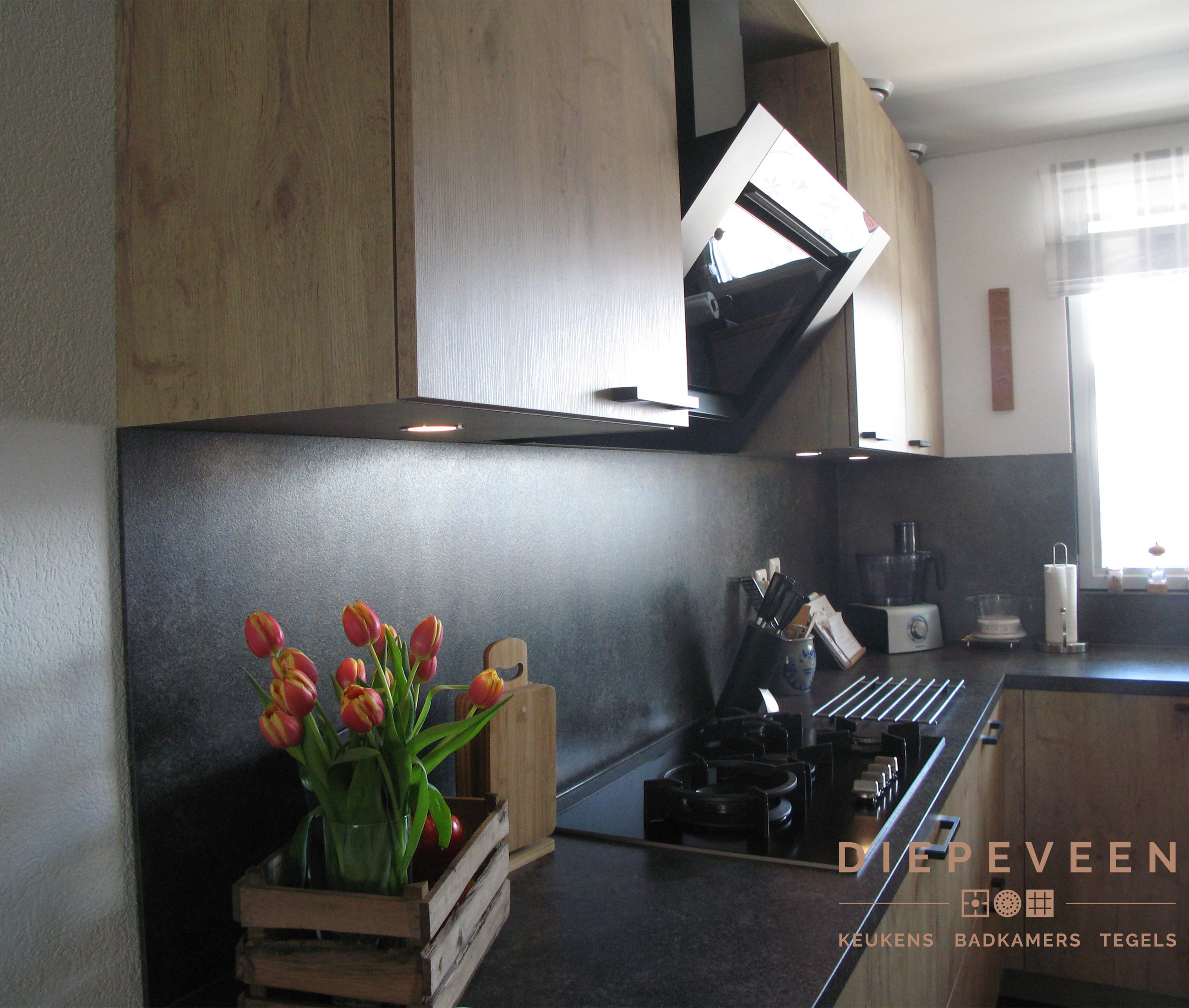 Een prachtige landelijke keuken. De zwarte grepen en het zwarte afzuigkap maken de keuken helemaal af.
