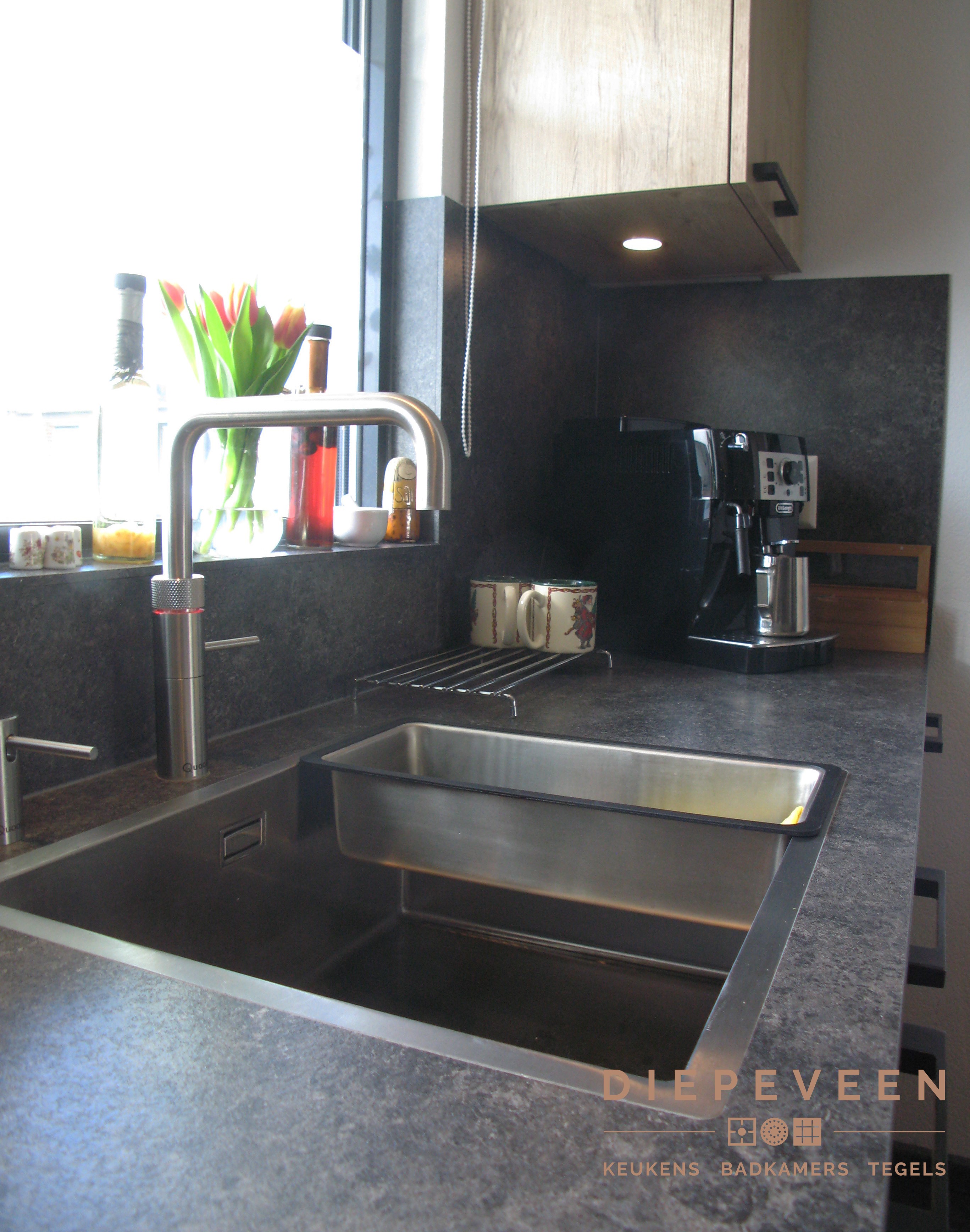 Een landelijke hoekkeuken uitgevoerd in hout. Leuk afgemaakt met de tegelstjes achter de schouw.