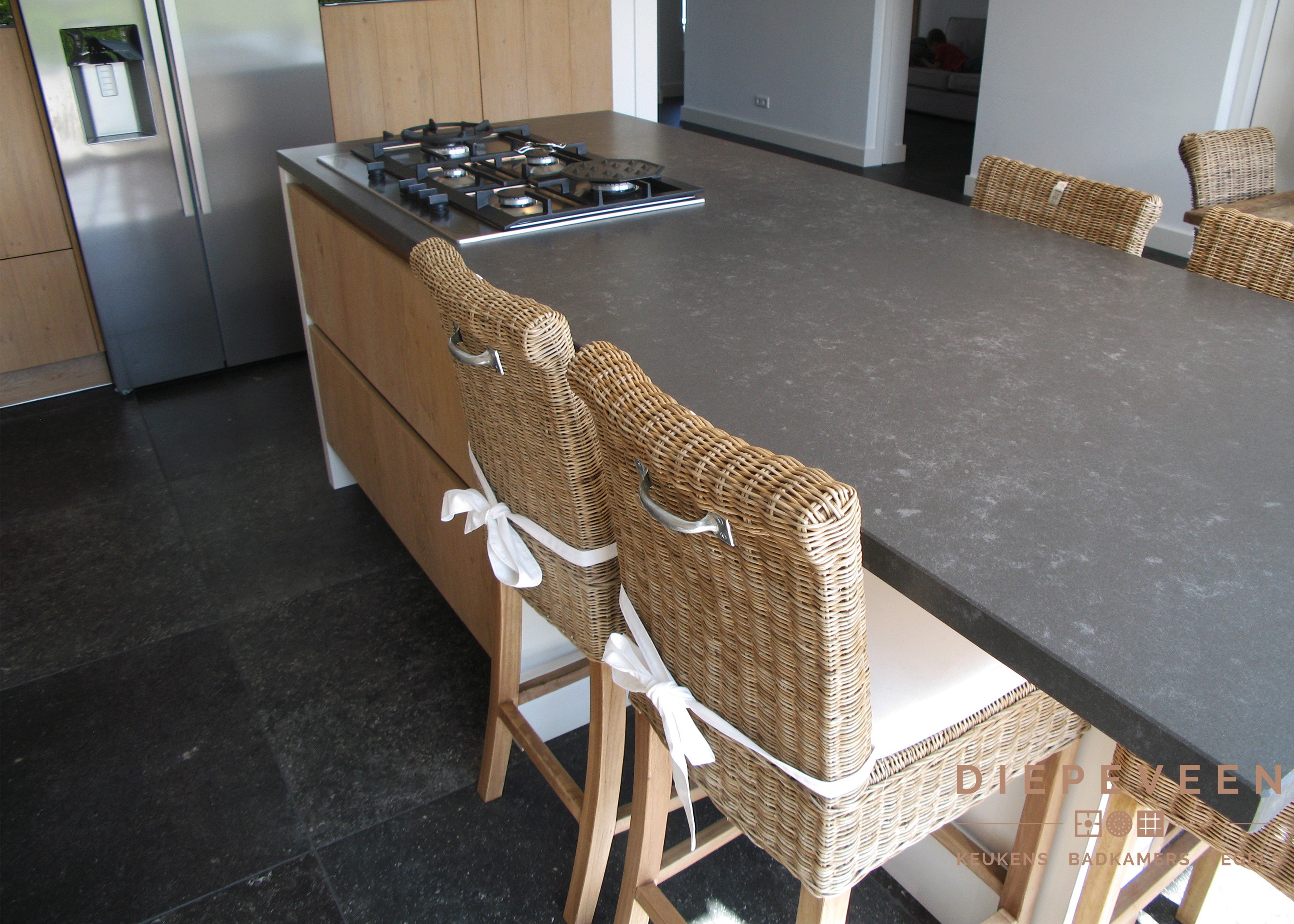 Een hele mooie keuken in de kleur Kiezel grijs. Deze keuken heeft een granieten werkblad en is voorzien van Pelgrim apparatuur en een prachtige schouw!
