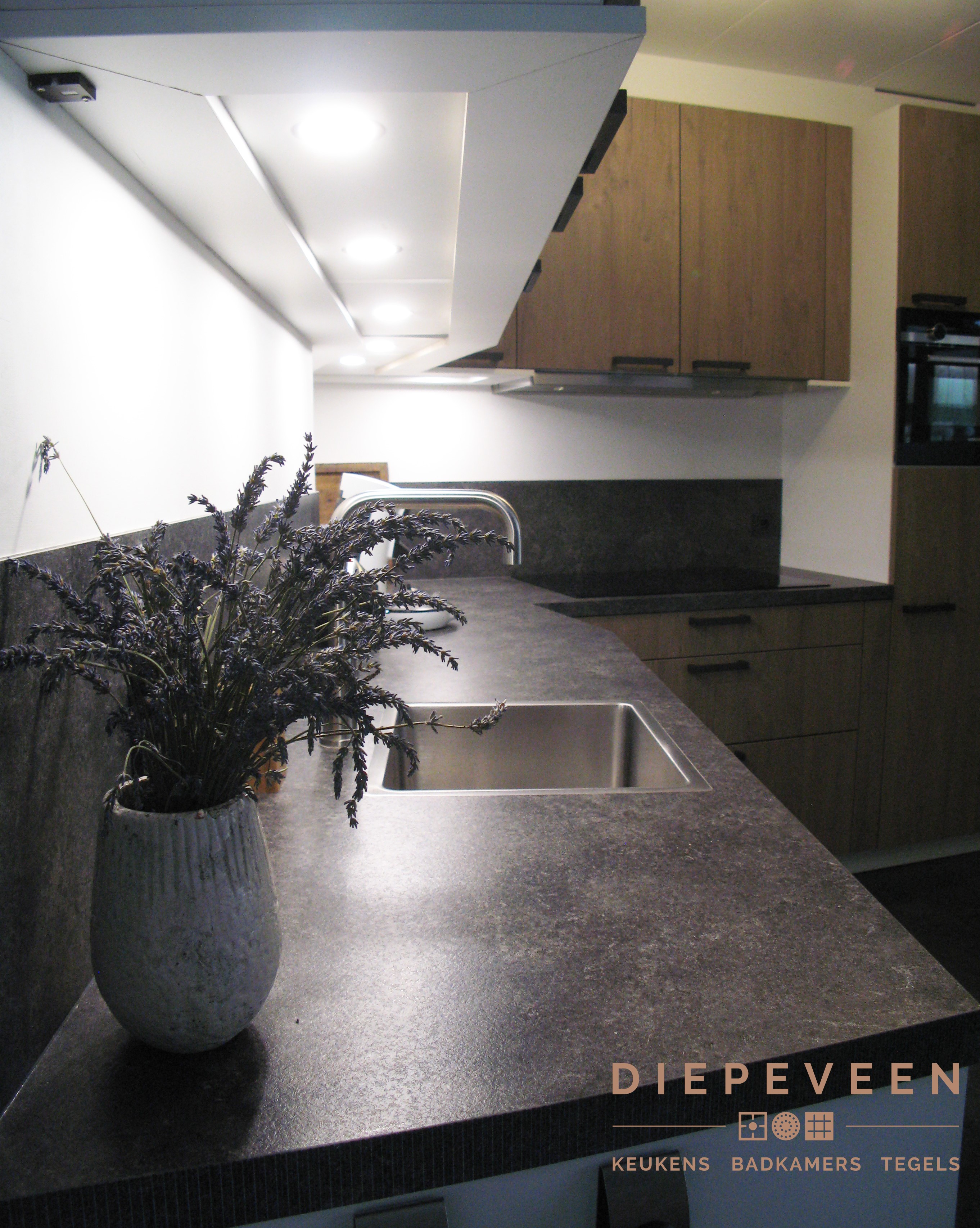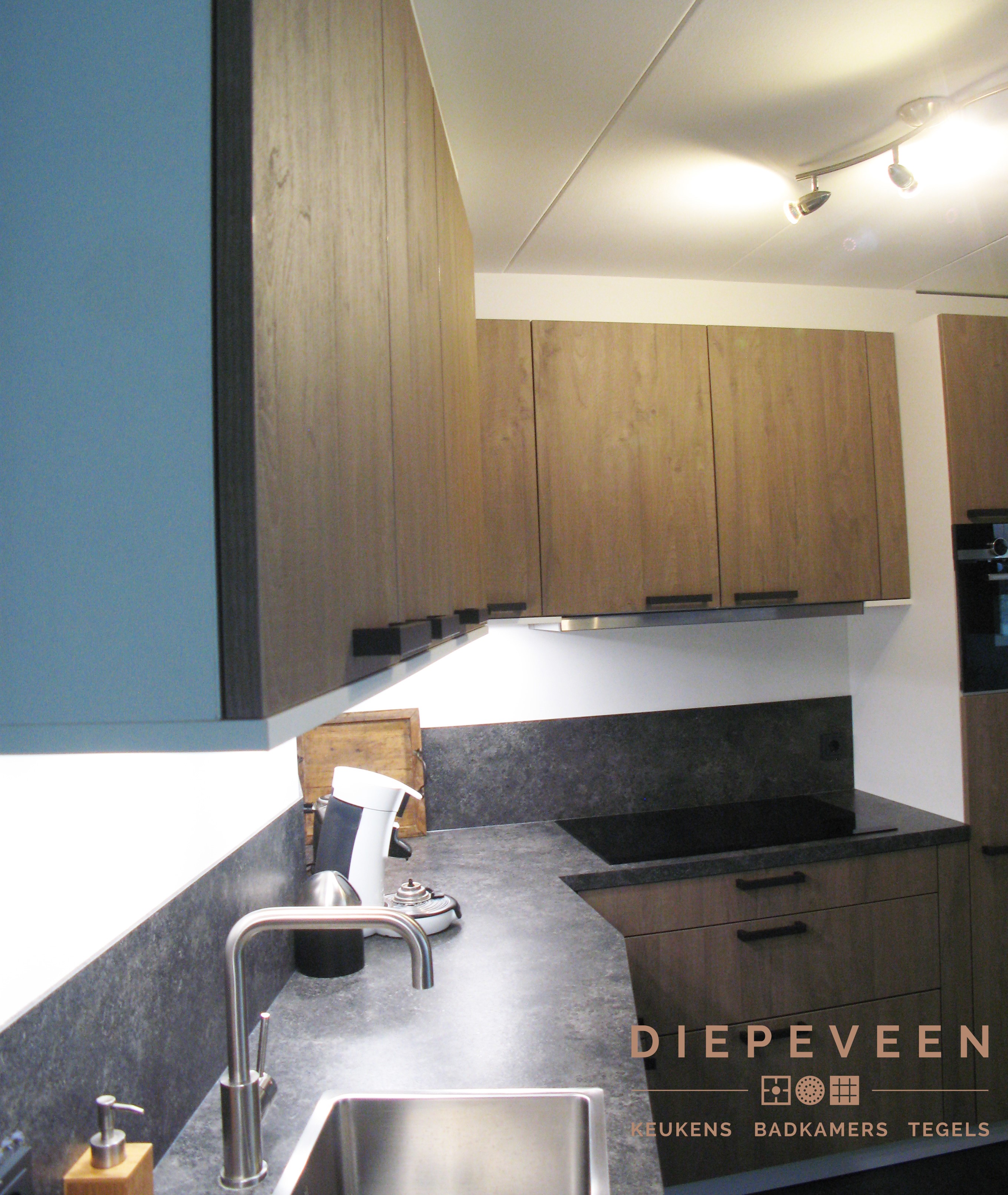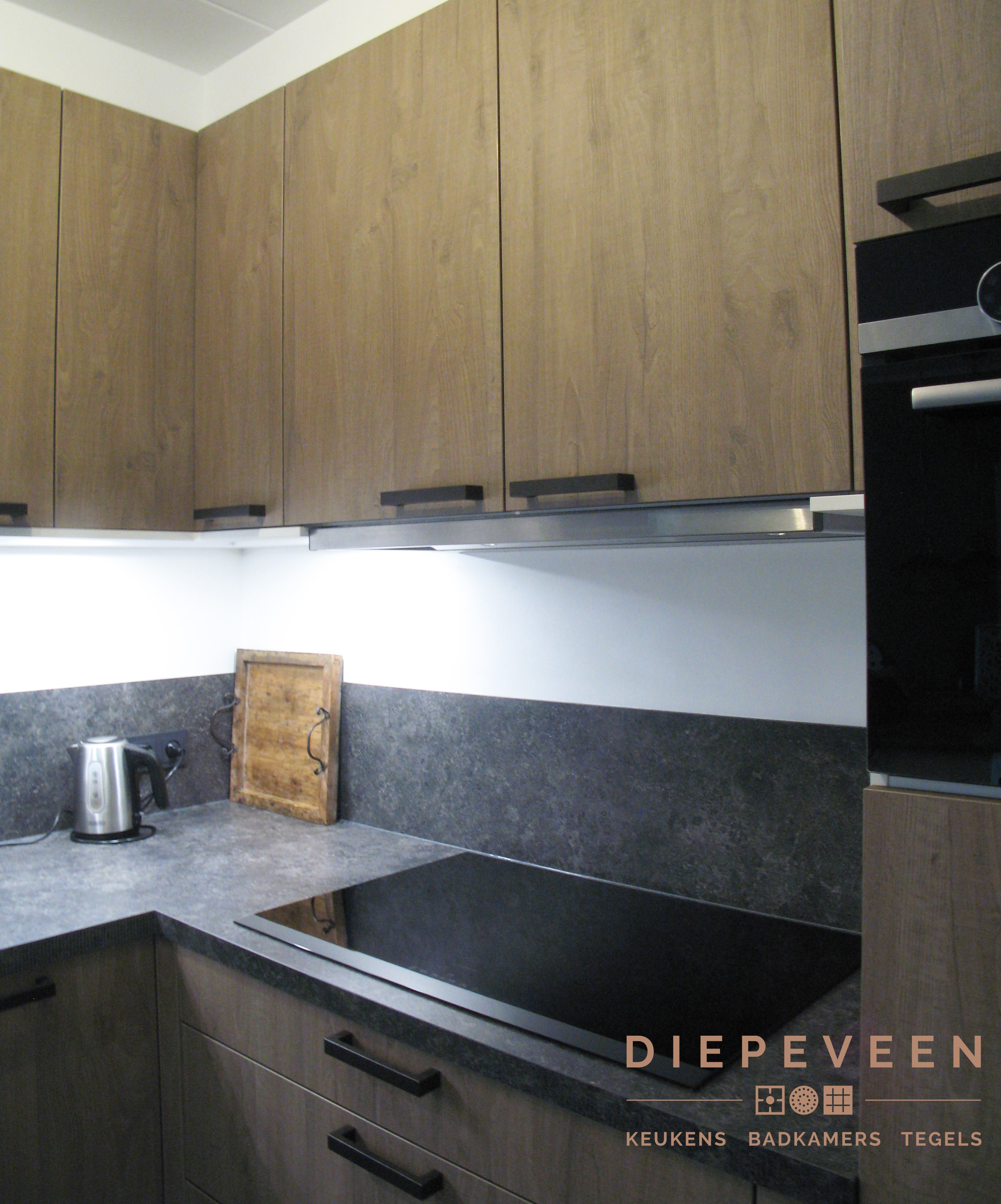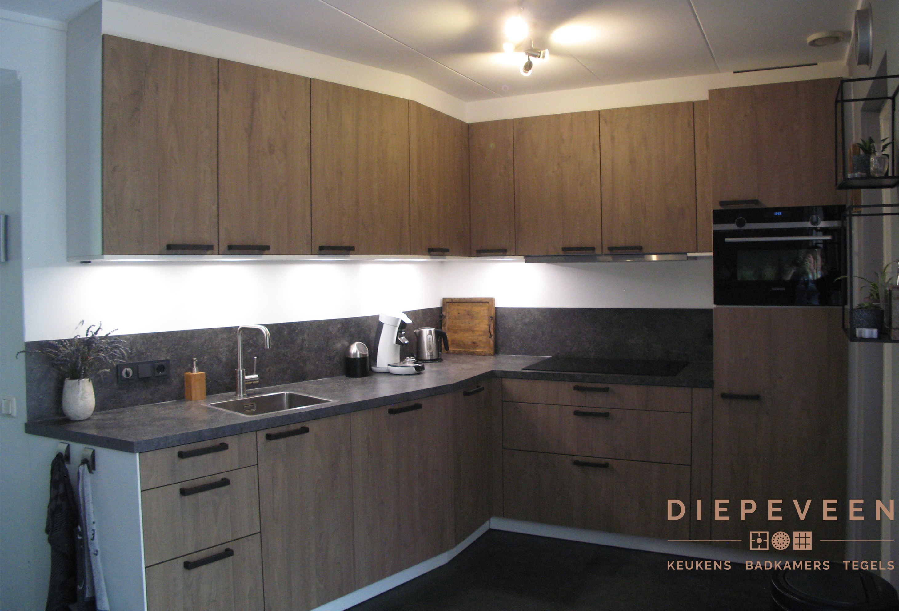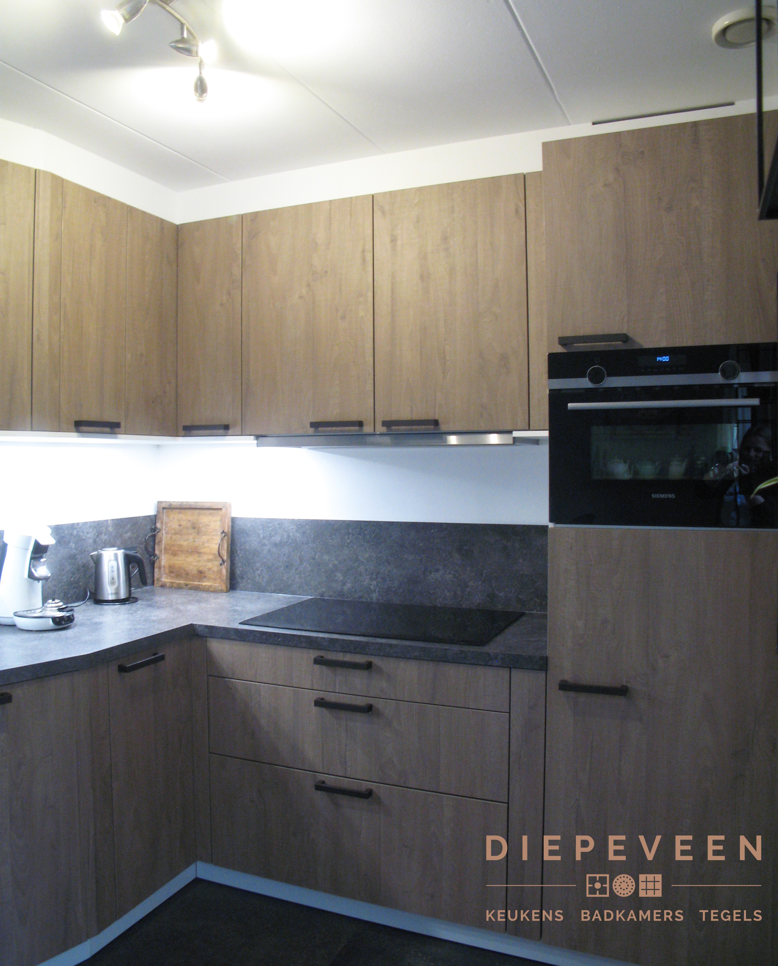Een prachige houten keuken met zwarte accenten. Echt een keuken van deze tijd.