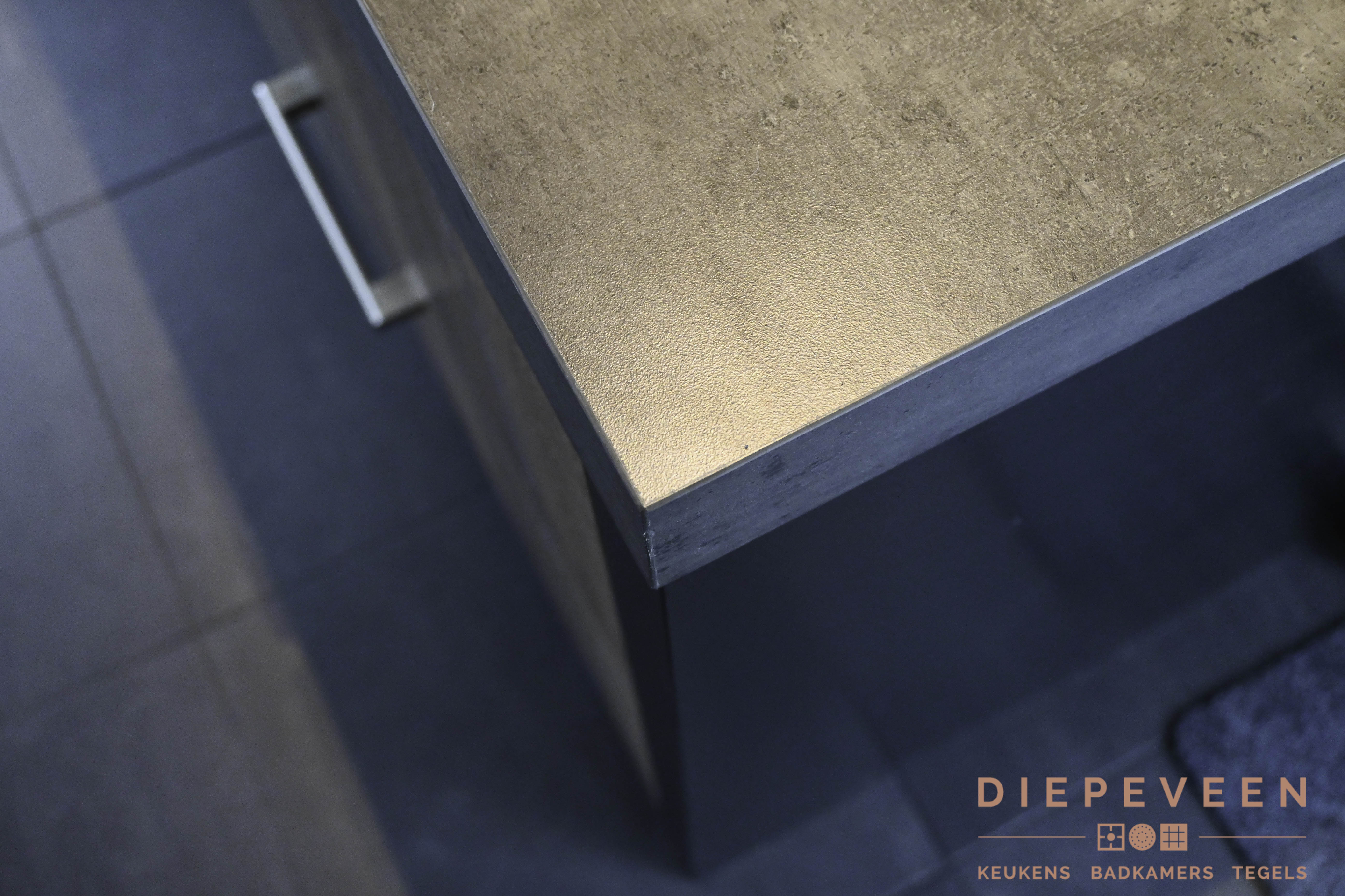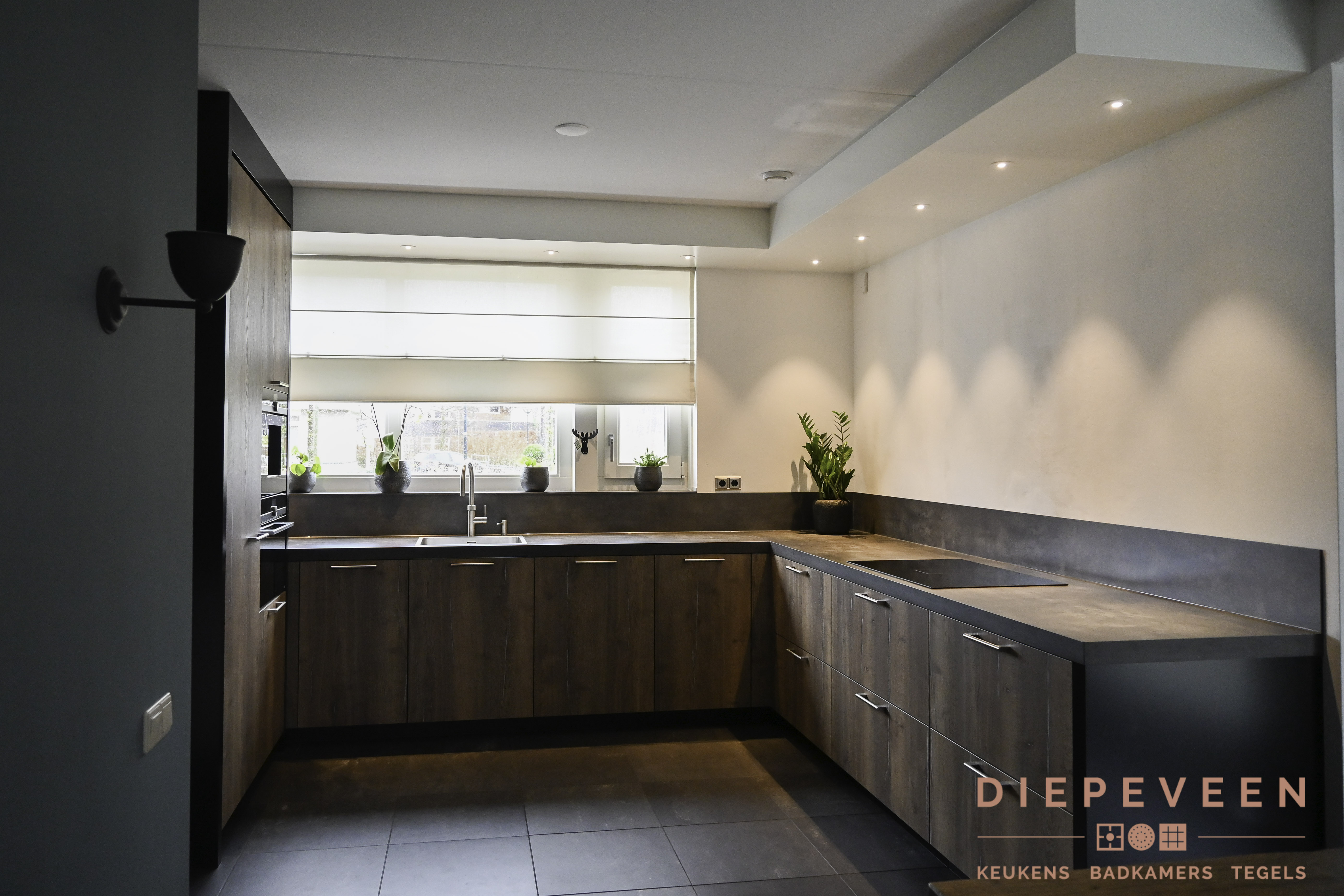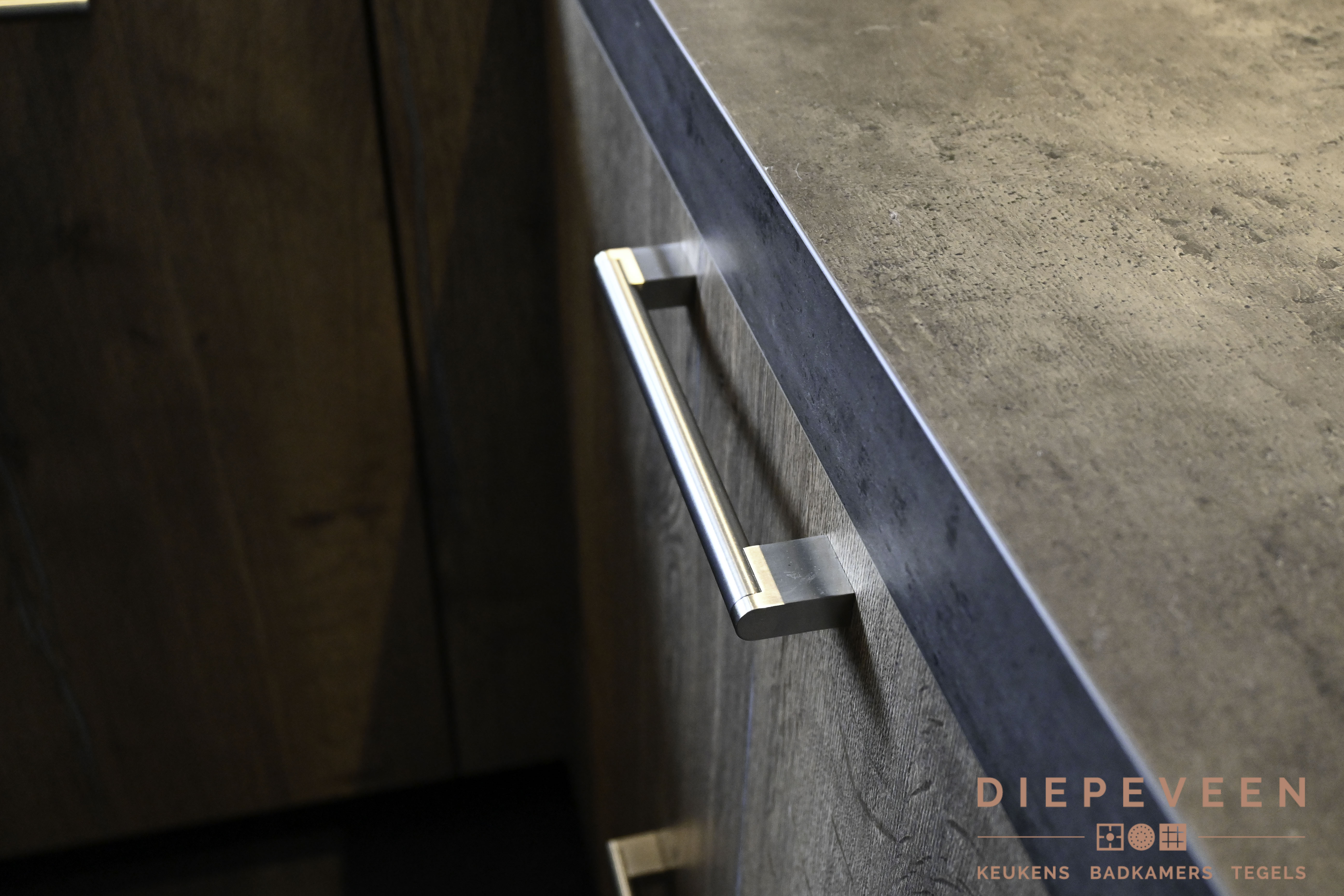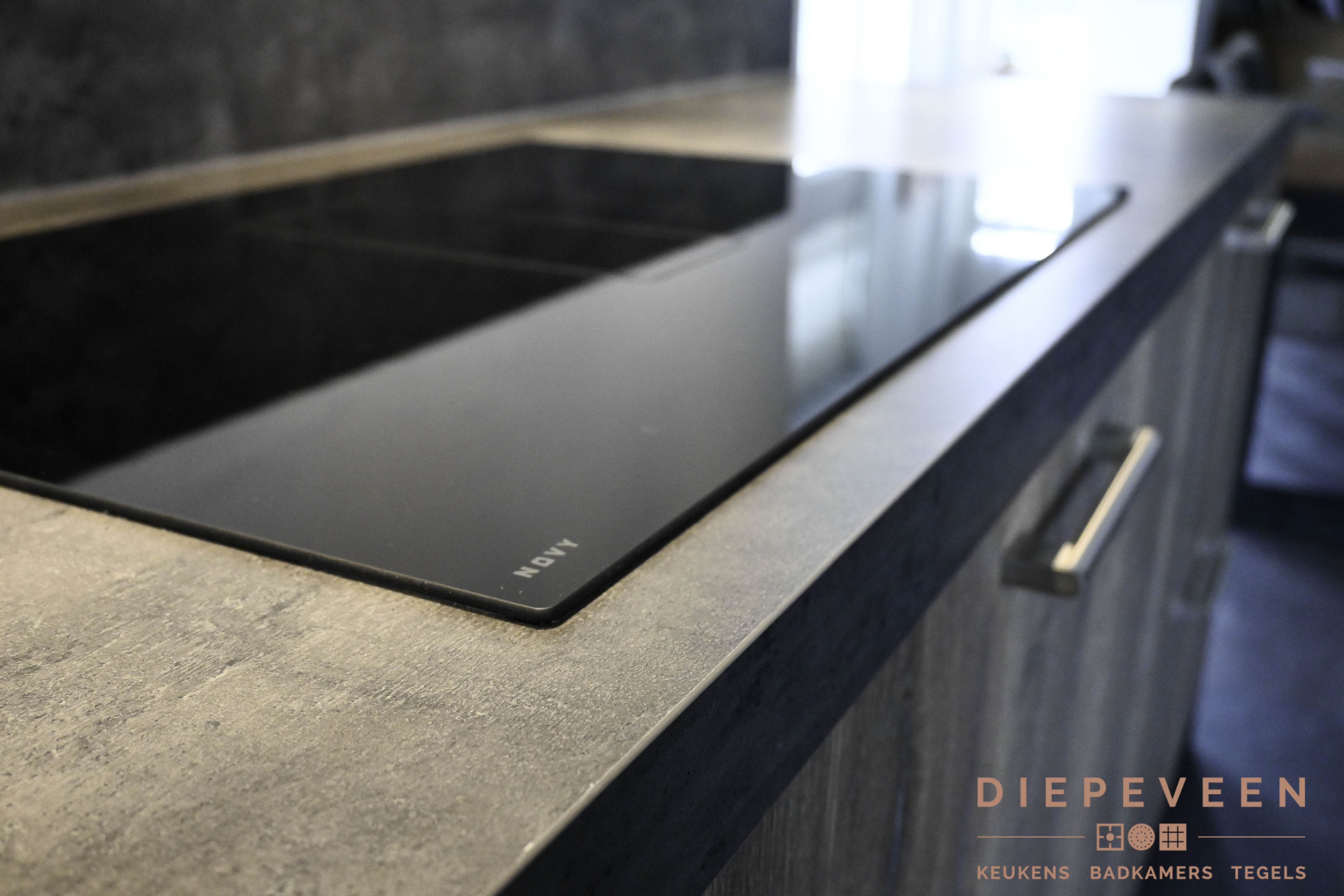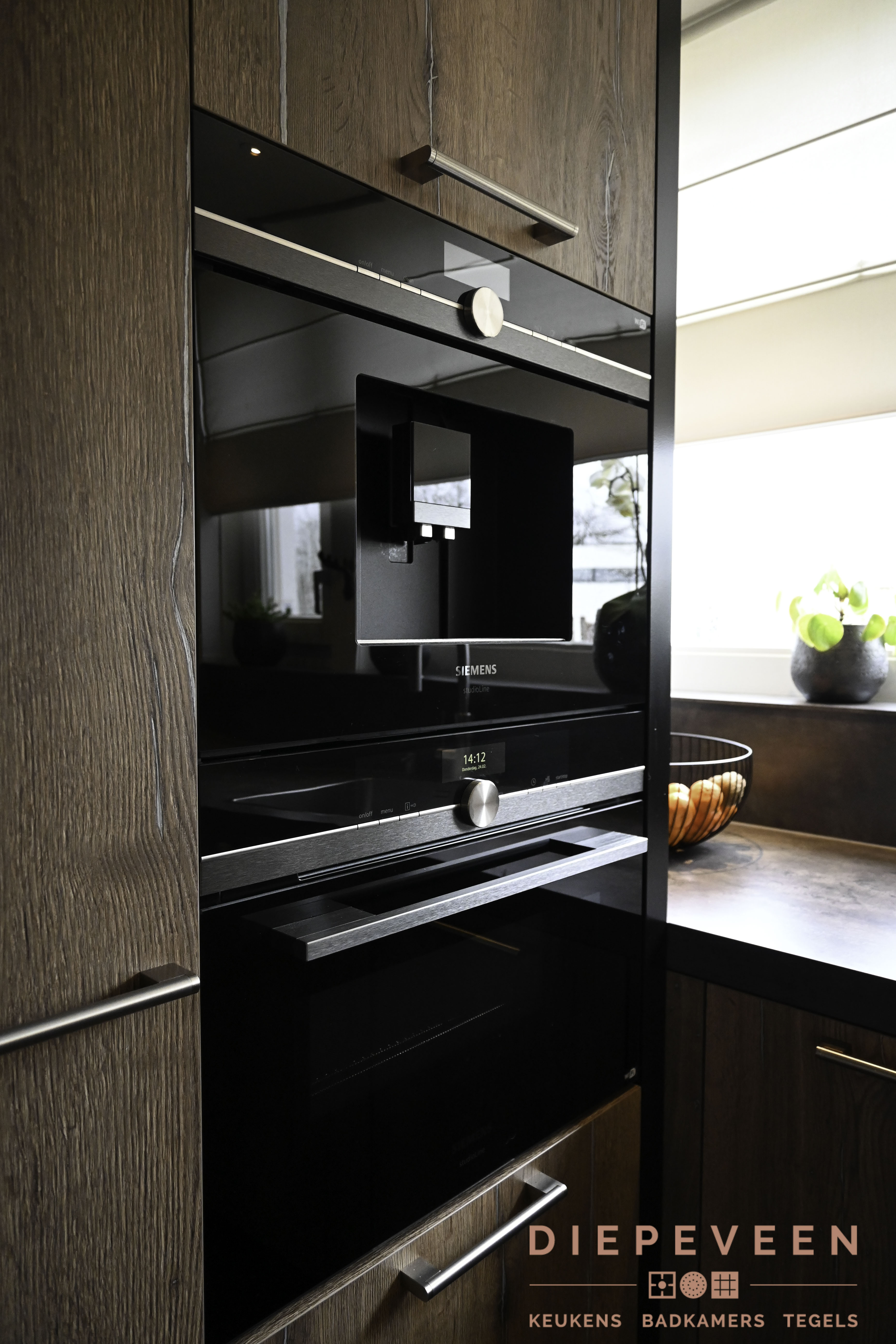 In deze keuken kun je heerlijk genieten van verschillende luxe's. Zo is een kop koffie zetten zo gebeurd met het ingebouwde koffieapparaat. Daarbij beschikt de keuken over een ingebouwde multifunctionele oven met magnetronfunctie. De inductiekookplaat inclusief afzuigsysteem is een prachtige oplossing voor meer ruimte in de keuken. De keuken straalt een warme sfeer uit door het houtlook front in gecombinatie met een grijs greengridz werkblad. De lange chroomlook grepen zorgen voor een landelijke uitstraling.