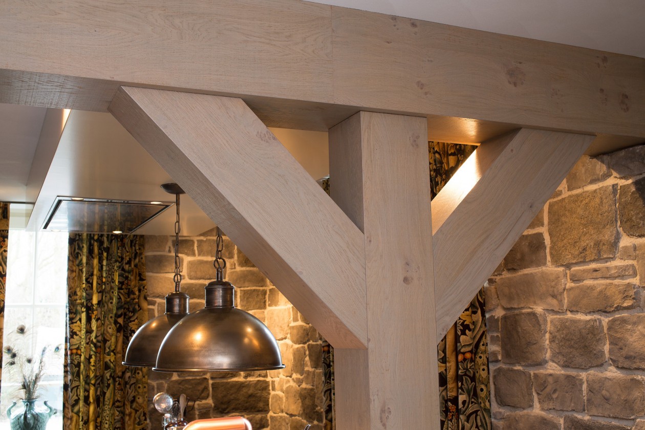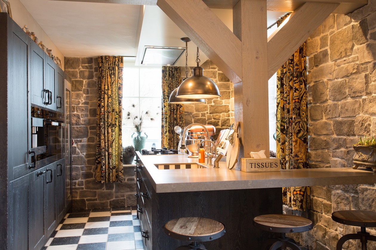 Deze robuuste keuken (model Chelsea) in de kleur smoked oil (eikenhout) wordt gekenmerkt door de natuurlijke look&feel met letterlijk noesten en houtcontouren in de keukendeuren. De keuken wordt helemaal compleet gemaakt door houten balk constructie en granieten aanrechtblad in zandkleur. Een leuke bar, prachtige stenen muur en de zwart-wit geblokte vloer en tegelbak is er een warme en gezellige sfeer gecreeërd. De keuken is geleverd en gemonteerd bij de familie Hoek uit Ouddorp.