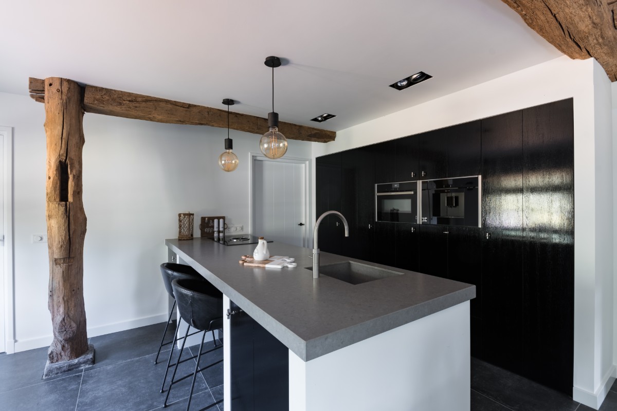 Deze Mereno boomstammen keuken is het hart van deze bijzondere woning. De Manchester fronten zijn bekleed met hoogglans handgeschilderde wildfineer en hebben een lichte groef. Deze prachtige fronten passen bijzonder goed bij de boomstammen in de rest van deze woonboerderij. De keuken zorgt voor veel opberg- en werkruimte in de ruime kastenwand en het centrale kookeiland.