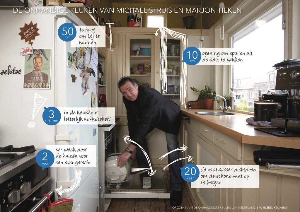 Eind november 2014 riep Bruynzeel Keukens alle Nederlanders op om hun onhandige keuken te delen op Facebook. Honderden reacties en foto's van onhandige keukens werden gedeeld. Louise en Heiny Steevens uit Zaltbommel, Joep en Mirjam Vogels uit Tilburg en Michael Struis & Marjon Tieken uit Haarlem hebben echt de onhandigste keukens van Nederland, zo oordeelde de jury. Afgelopen weken ging het team van Bruynzeel Keukens op bezoek om de onhandige keukens met eigen ogen te bekijken. De winnaars krijgen van Bruynzeel Keukens een keuken die werkt.