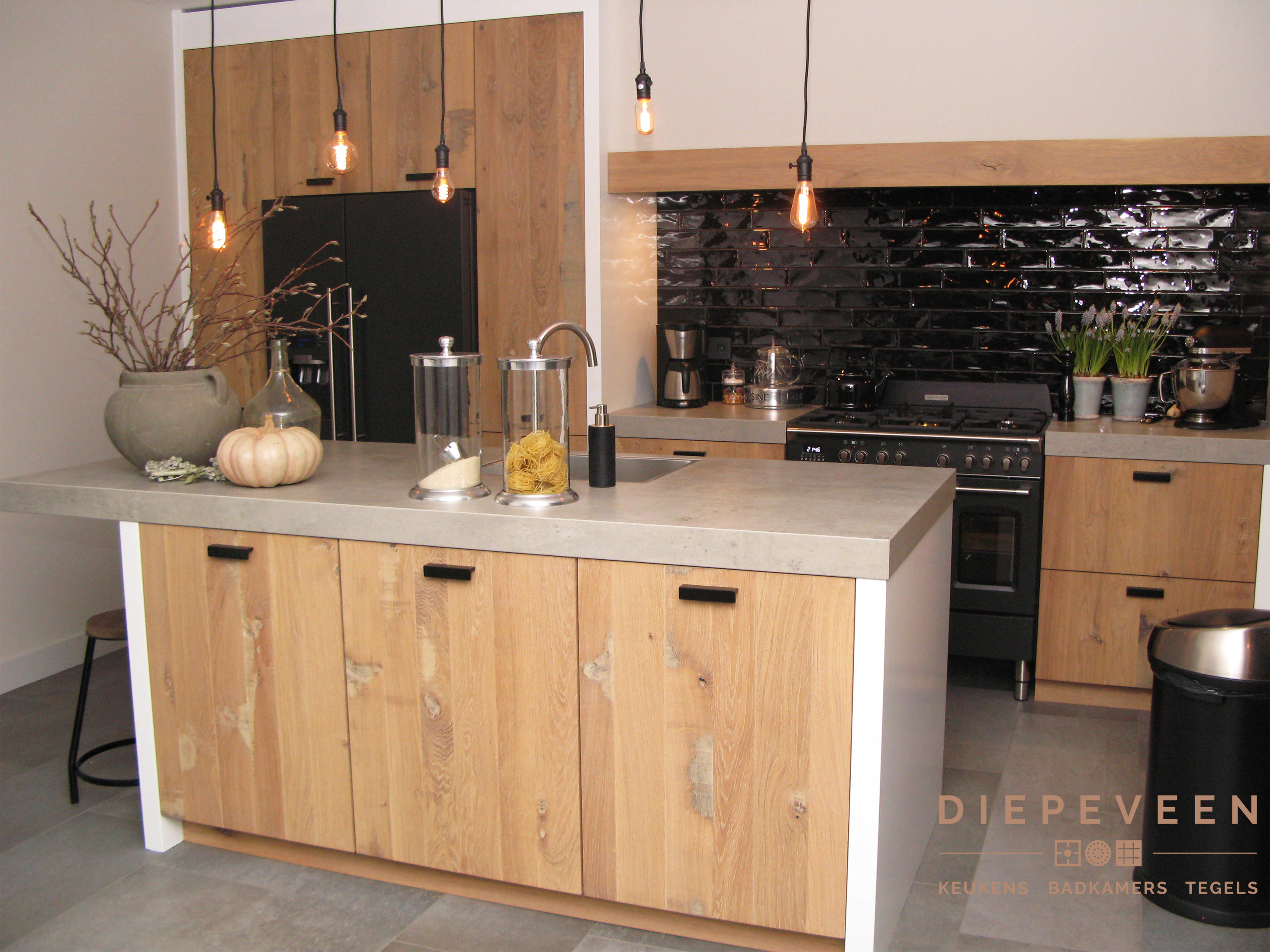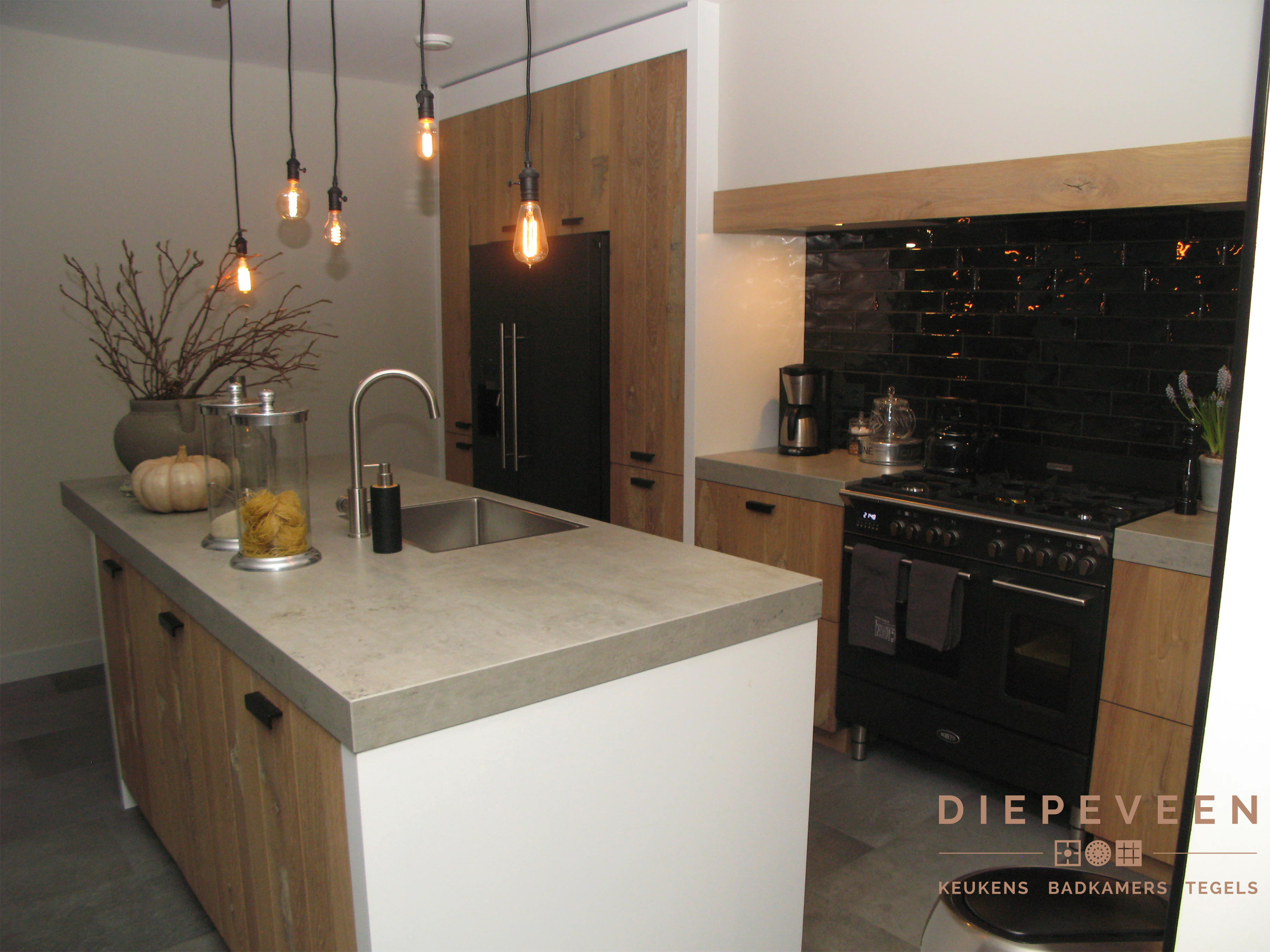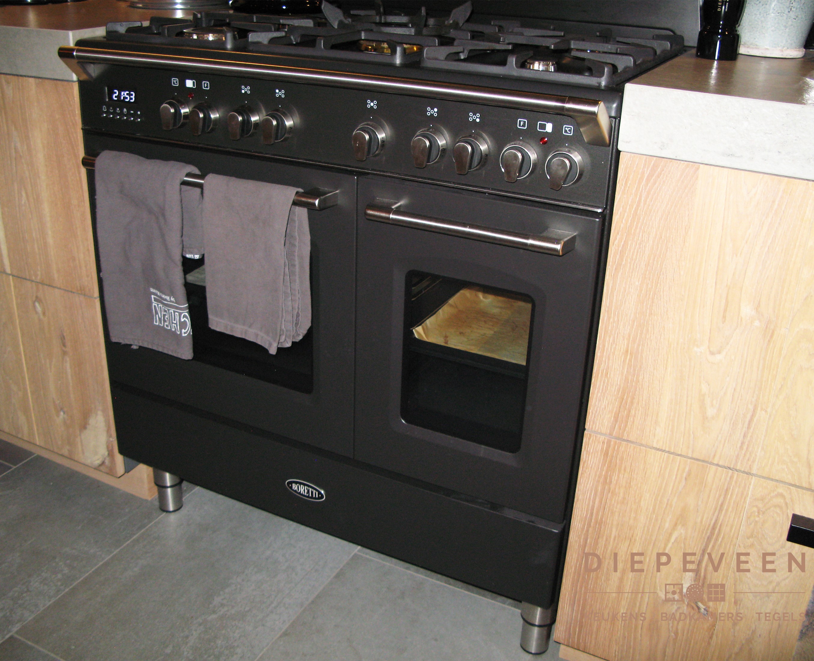 Stijlvolle keuken in zwart en zand tinten met een prachtig fornuis