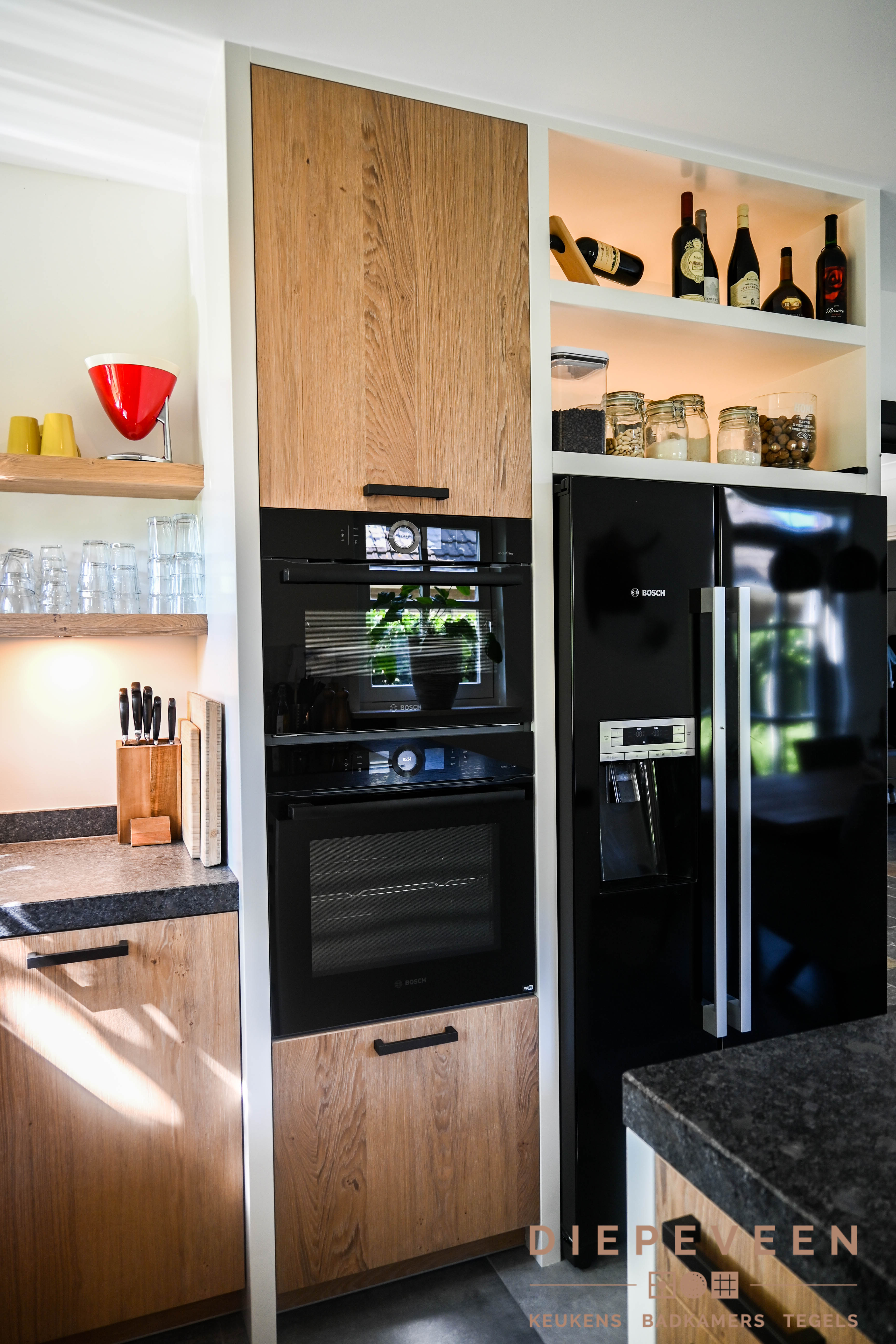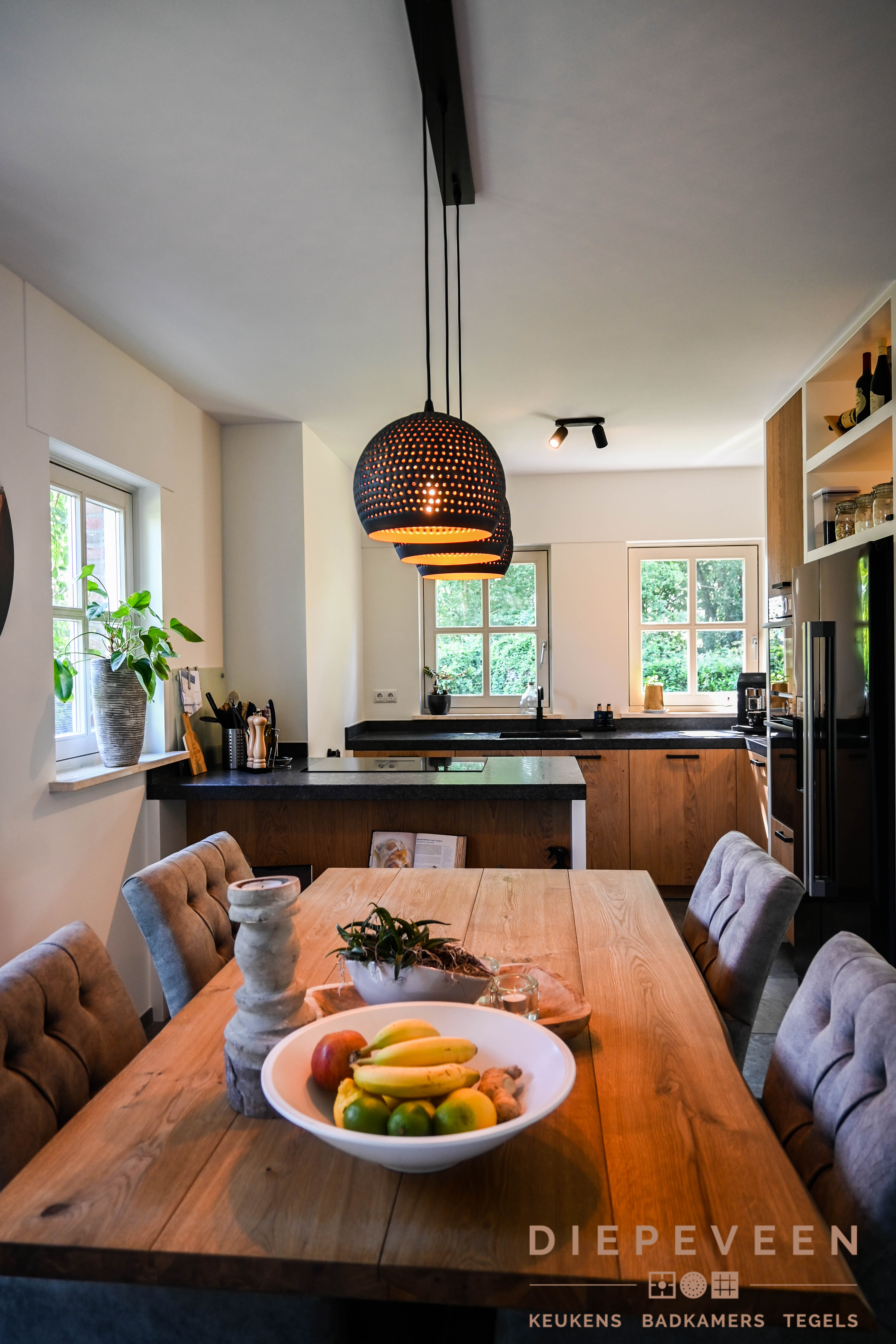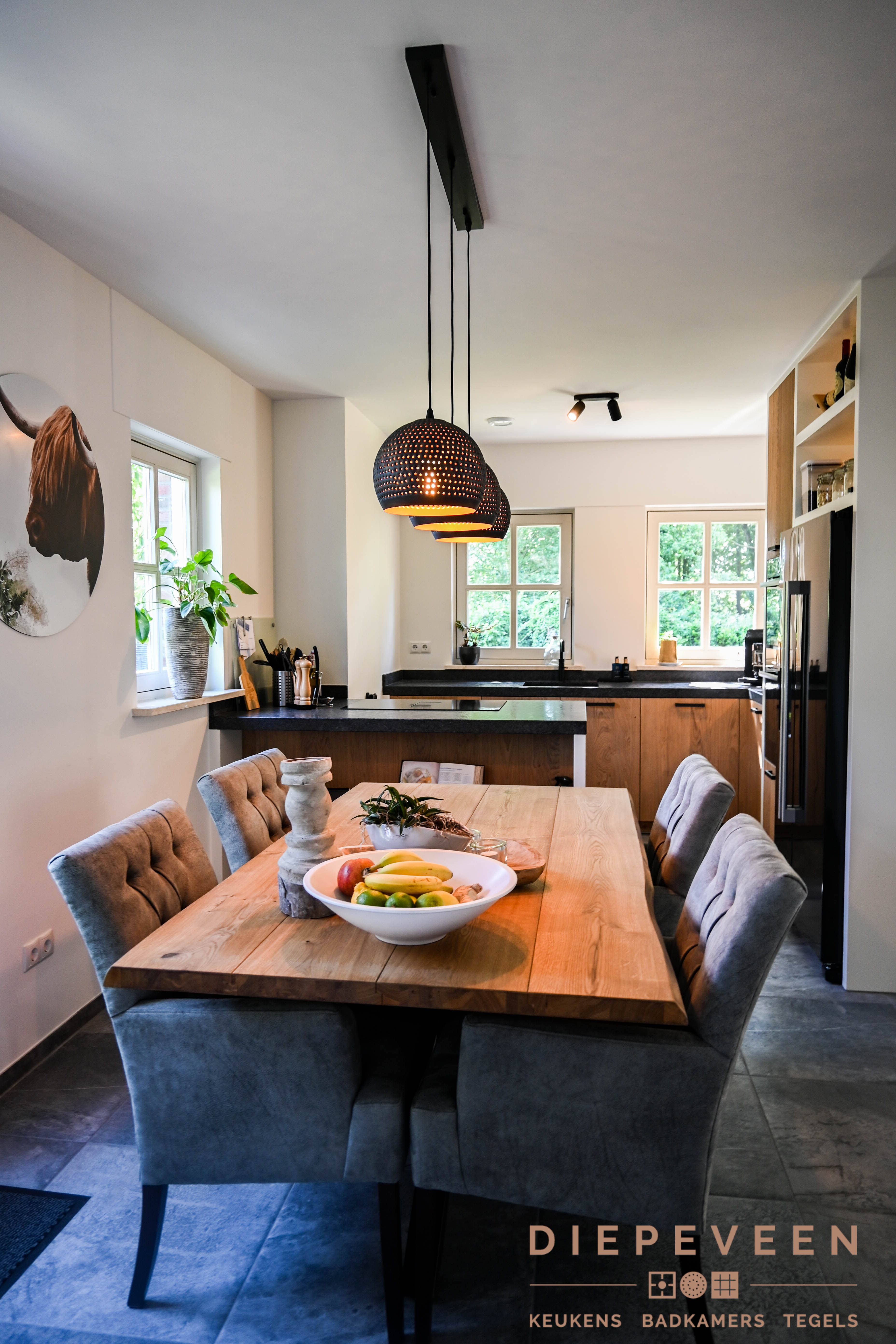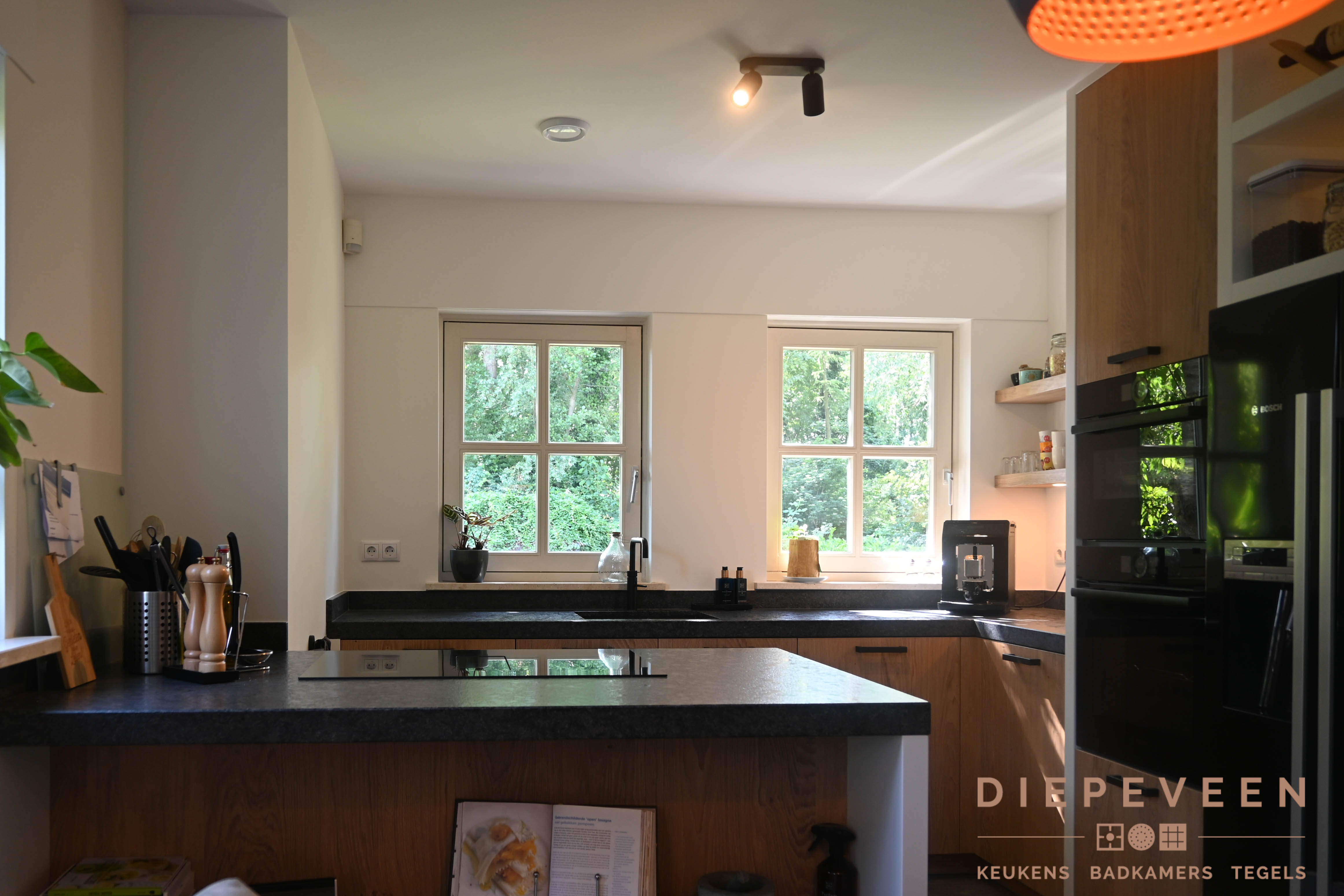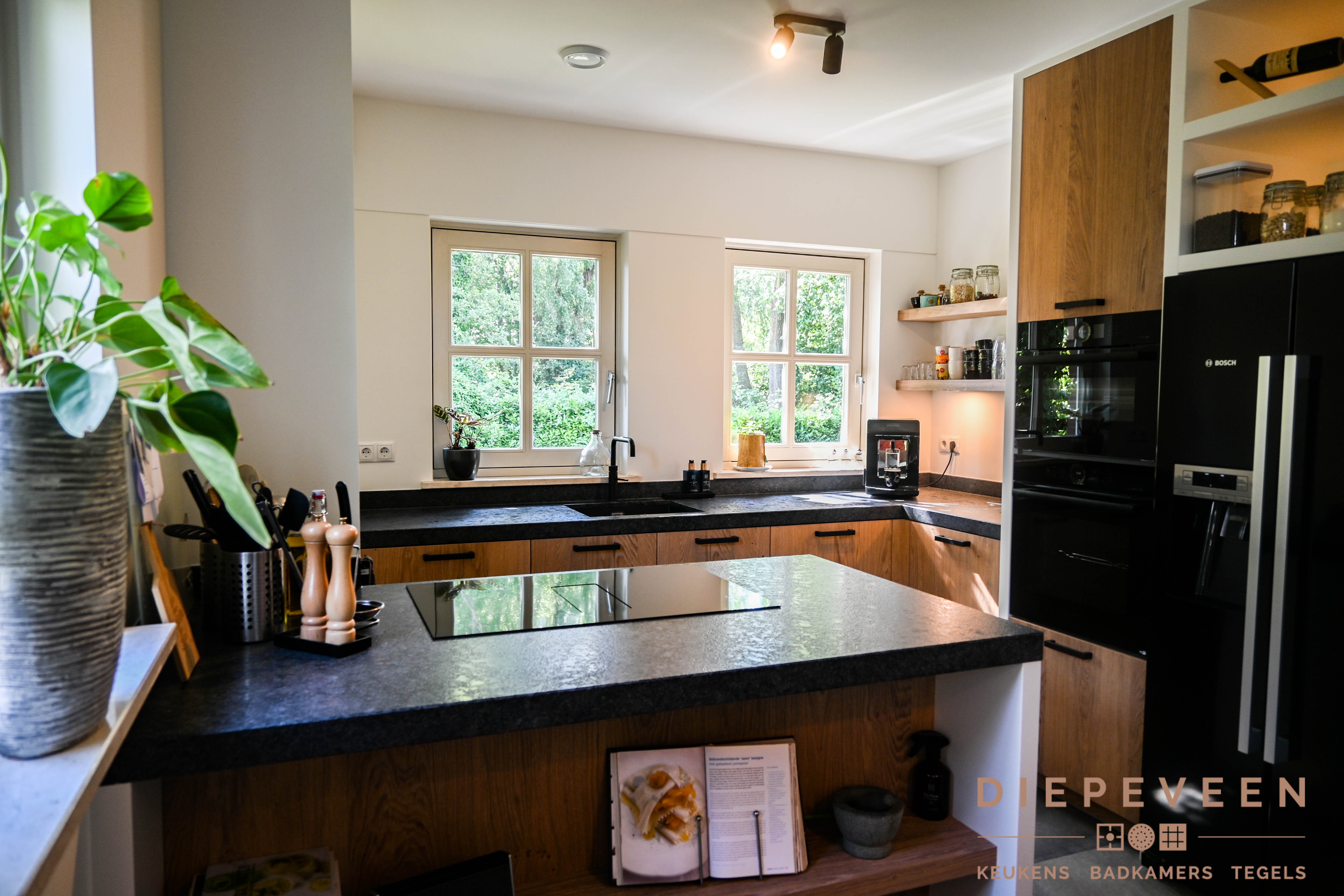 Even lekker genieten in de keuken. Dat kan zeker in deze sfeervolle woonkeuken! De keuken is een hoekkeuken met kleine schiereiland. In de keuken zit Bosch apparatuur en een Novy One inductieplaat met afzuiging.