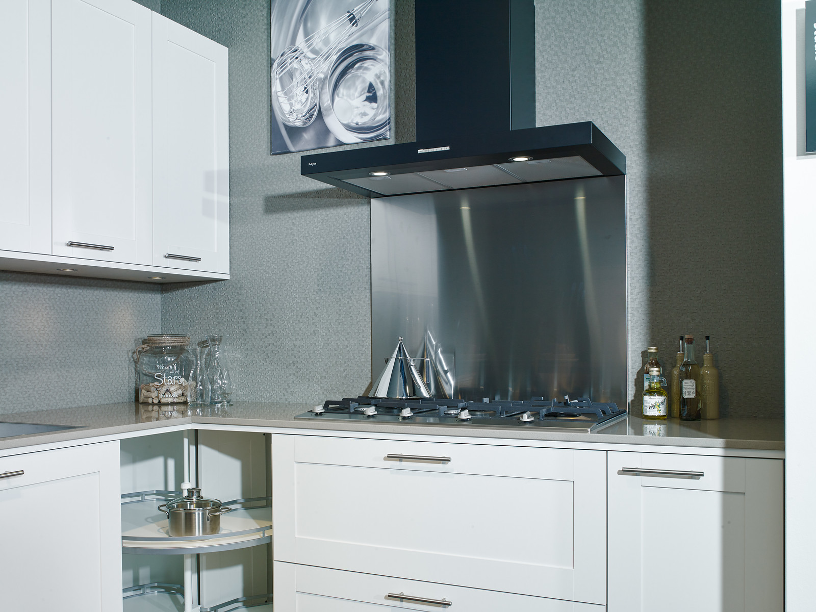 De Keller Cascade is verkrijgbaar in elf verschillende frontkleuren; ijs, wit, schelp, kiezel, bloesem, magnolia, parel, leem, klei, mokka en basalt. Kijk op de website van Keller voor alle kleuren van de Keller Cascade. De keukenfronten van de Keller Cascade in onze showroom zijn in de kleur Magnolia. Het aanrechtblad is een composiet blad in de kleur Belgian Dessert. In de hoek van de keuken is een hoekcarrousel gemaakt, om optimaal gebruik te maken van de ruimte. Verder is de keuken voorzien van een oven, gaskookplaat met afzuigkap, vaatwasser en koelkast met vriesvak van het merk Pelgrim.