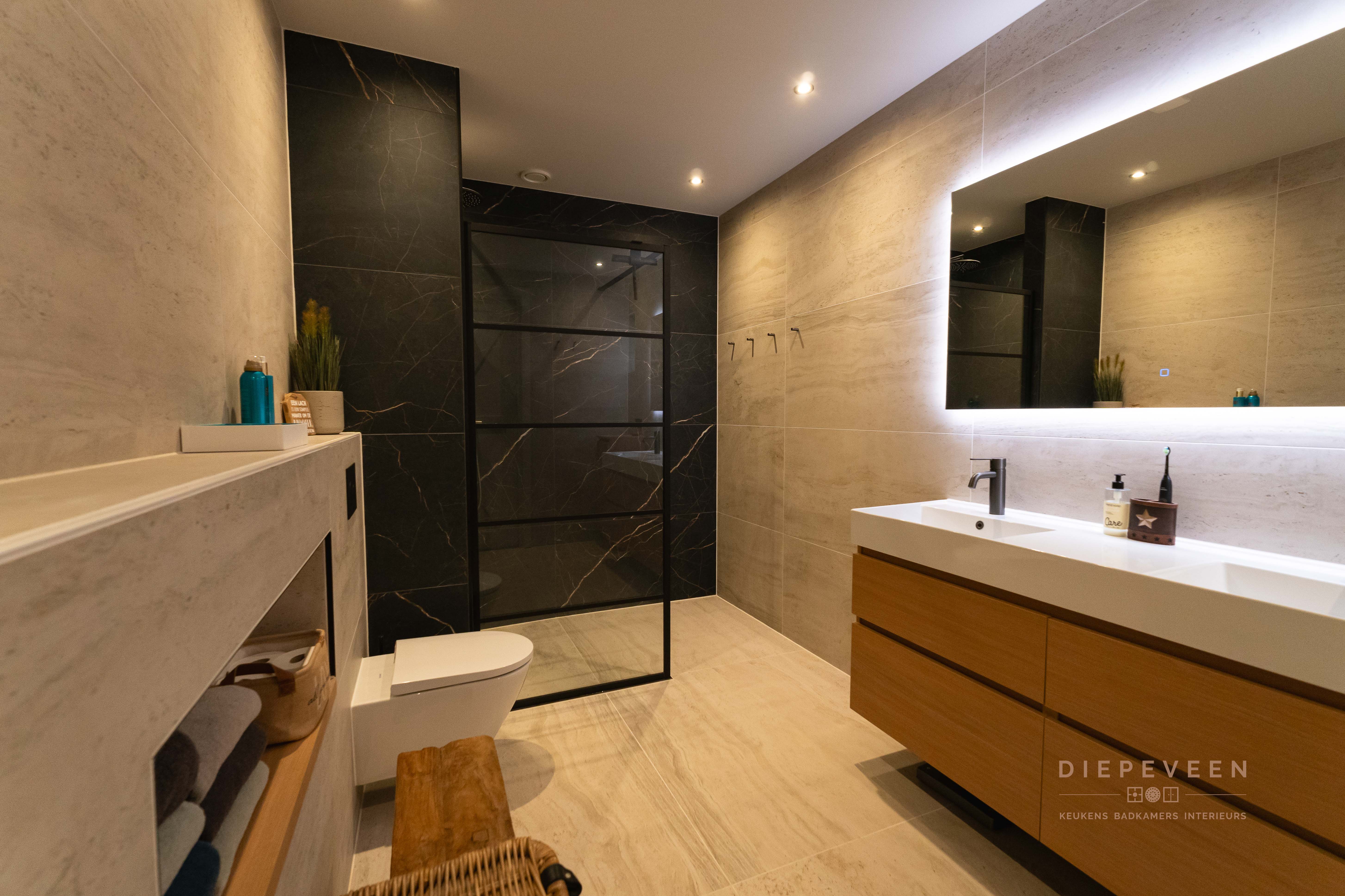 Moderne tijdloze keuken. Hoogglans wit, met een prachtig donker aanrechtblad.