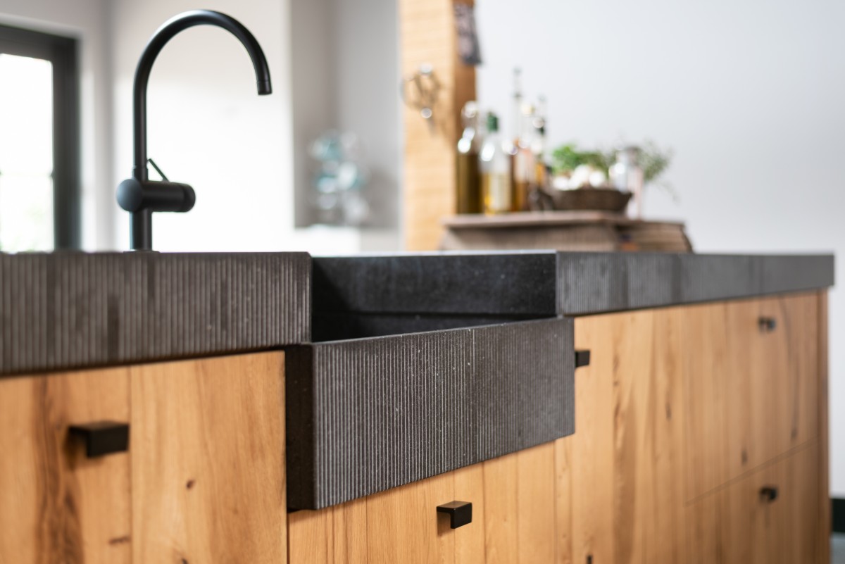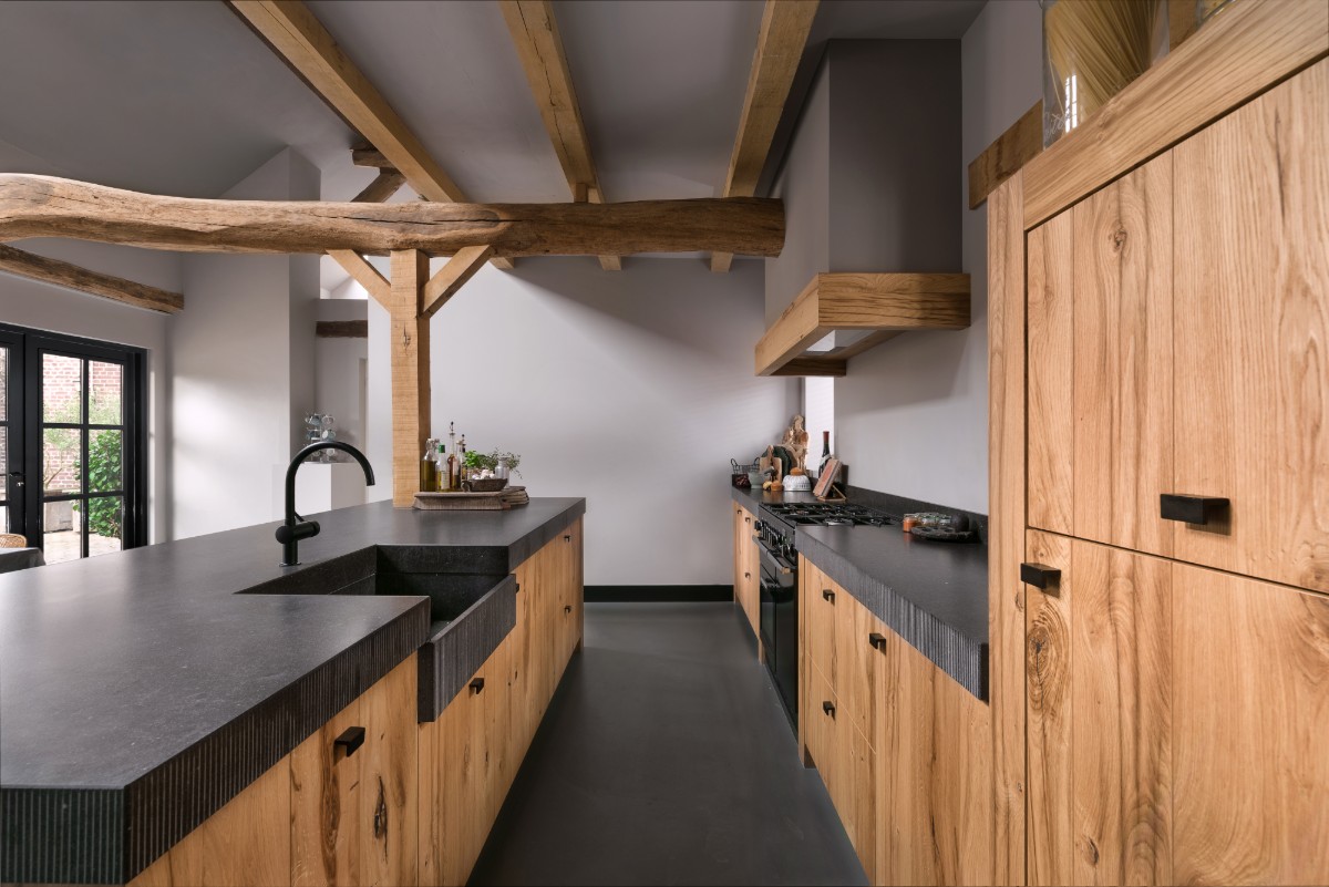 Deze stoere keuken past helemaal bij de stijl van deze prachtige woning. Het geselecteerde houtfineer is afgestemd op de kleur van de houten balken. Daarnaast is de grove groef als randafwerking in het composieten werkblad ook kenmerkend voor het stoere karakter van deze keuken.