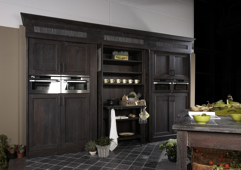 Deze landelijke keuken (Blackburn) is gebeitst in een donkerbruine kleur. Door de details en accessoires oogt de keuken heel stoer.
