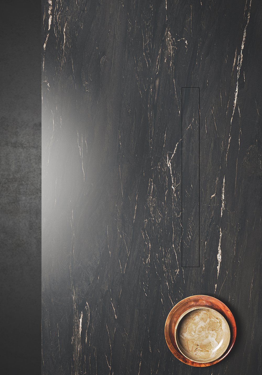 Downdraft model Level Invisible van Falmec verdwijnt volledig uit het zicht, perfect vlak met het keukenblad. Het bijzondere van dit product ligt in het bovenpaneel, dat kan worden gemaakt van hetzelfde materiaal als het aanrechtblad.