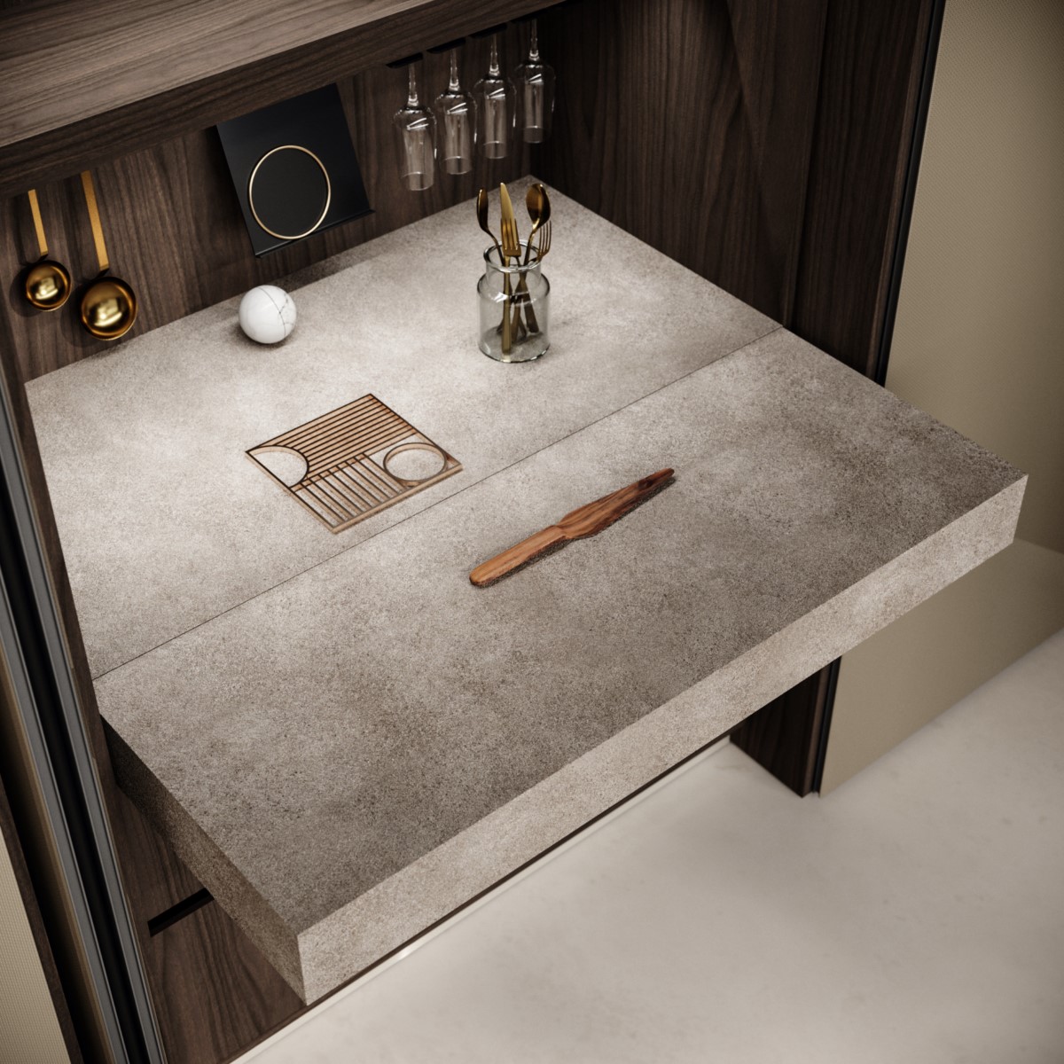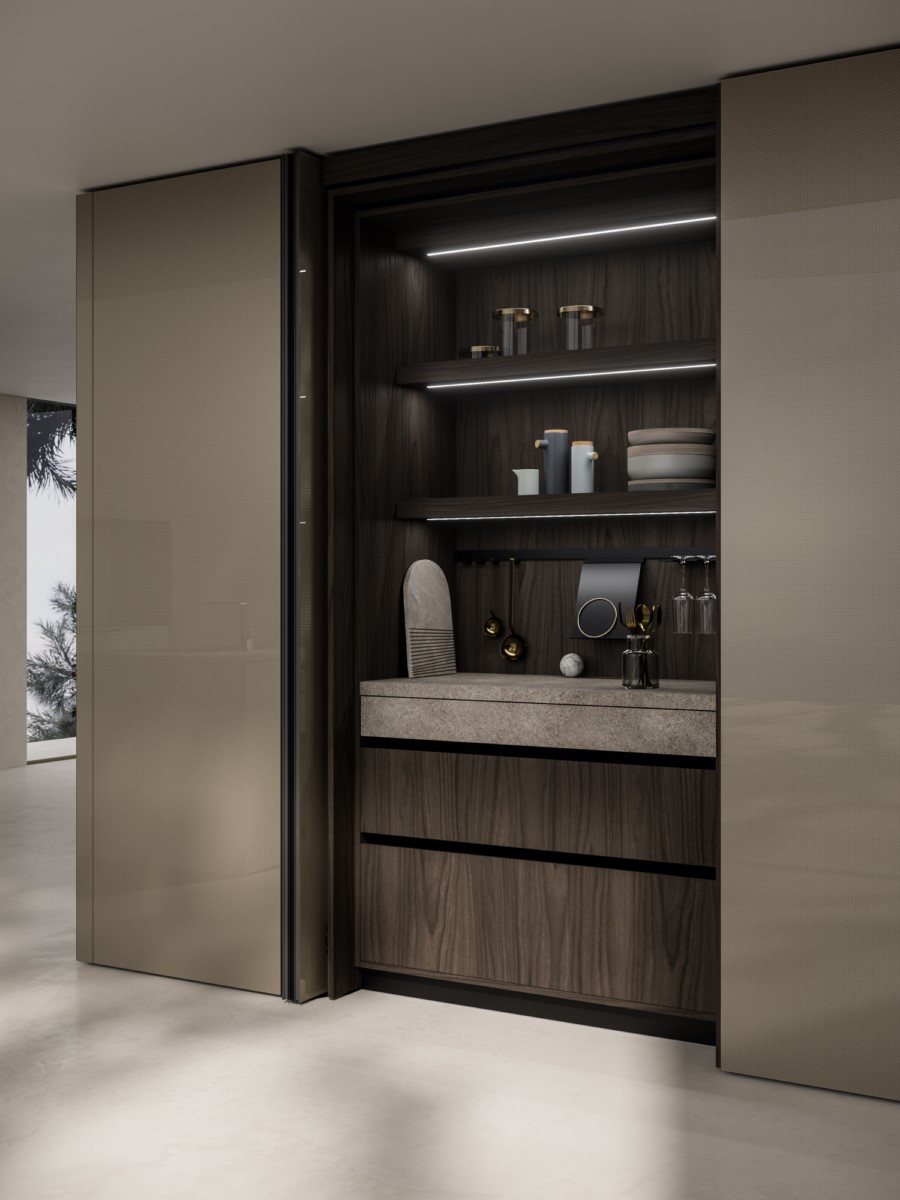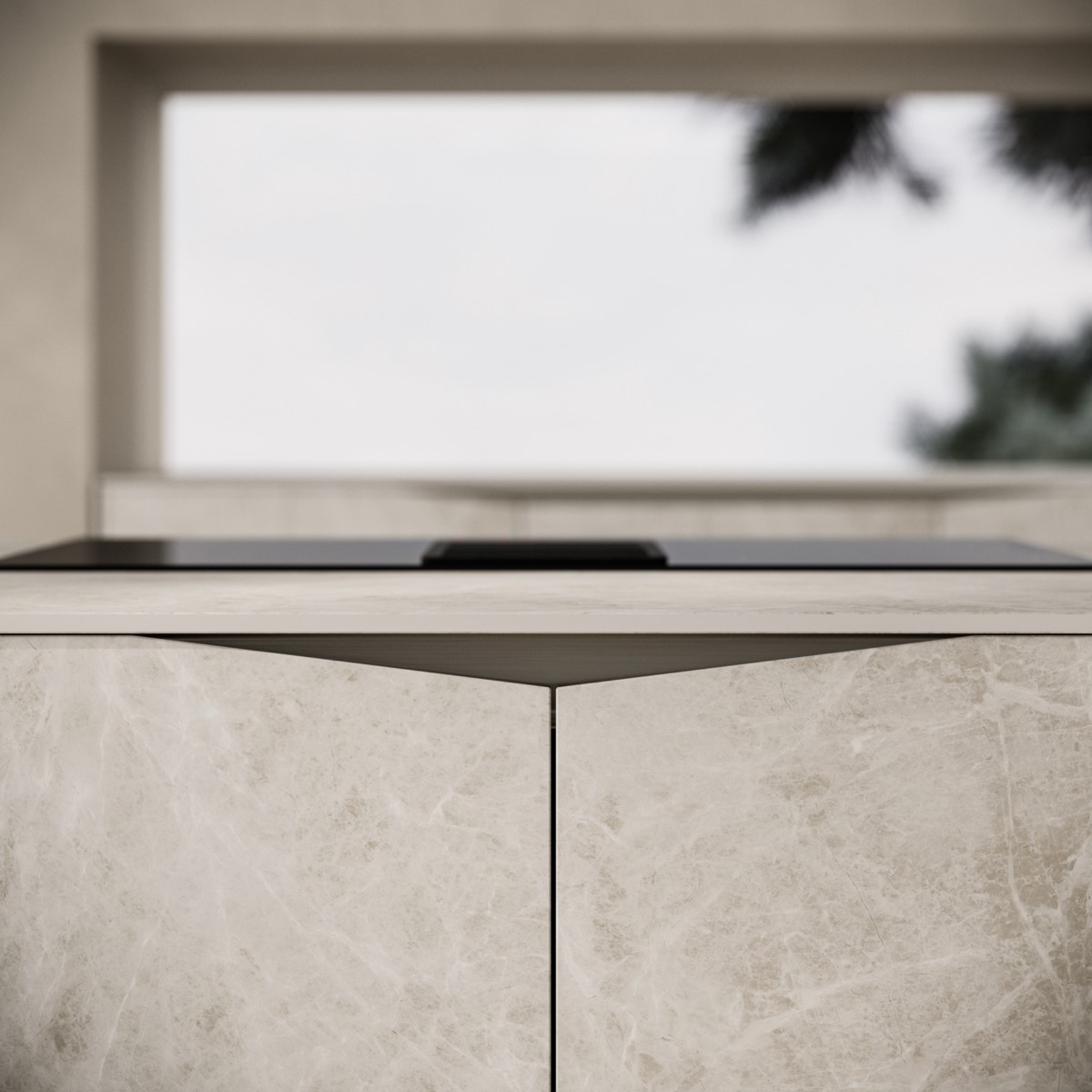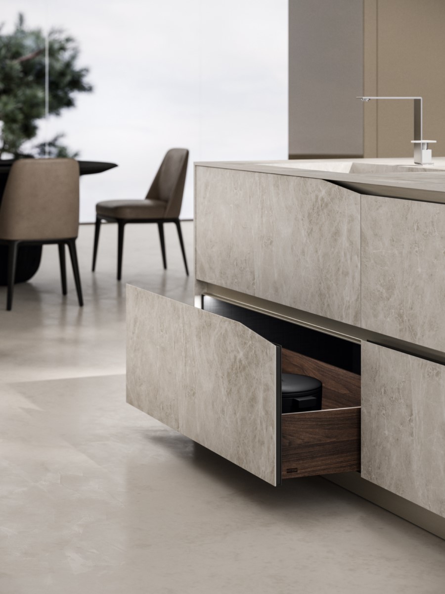 De Elementi valt niet alleen op vanwege de innovatieve materiaalbalans, maar ook door het unieke deurprofiel. De keukendeuren kunnen geopend worden middels een uitgespaarde handgreep. Het detail op het profiel van de deurtjes zijn met de hand gemaakt op een gietijzeren aluminium frame. Hierdoor is een rand met gestreept patroon zichtbaar geworden. Tevens wordt hiermee de kwaliteit van het materiaal verbeterd.