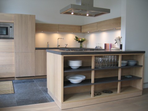 Stoere keuken met massief eiken fronten. De afzuigunit is weggewerkt in een koof waard je zelfs voor het raam kunt koken.