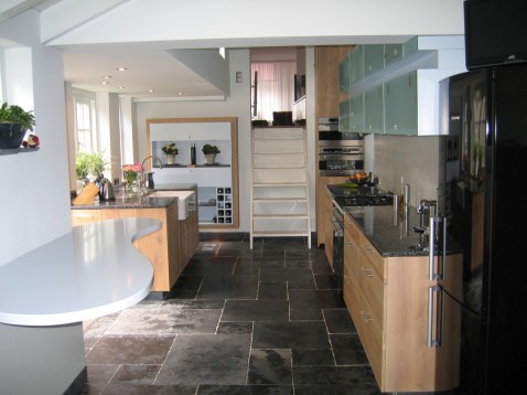 Warme leefkeuken in Altare notenfineer met bijpassende bijkeuken