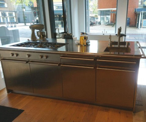 Prachtig rvs kookmeubel met rvs wang, finish richtingloos geborsteld. Voorzien van ingelaste ATAG kookplaat en ingebouwde stopcontacten in de wang. Aan het meubel een houten bar/tafel bevestigd voor een optimale uitstraling en sfeer.