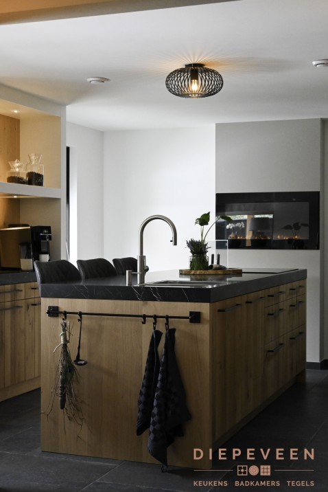 Oud iepenhout, robuust keramiek en zwarte accenten samengebracht in een keuken op maat