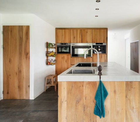 Geschaafd oud eiken, strakke greeplijsten, een betonnen aanrechtblad en apparatuur van oa Novy, Steel en Atag.