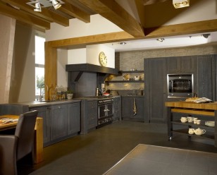 Stoere nostalgische keuken met stoere schouw uitgevoerd in eiken fineer.