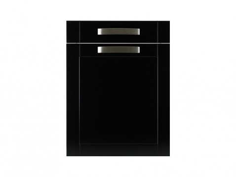 Hoogglans zwarte Manchester keuken met industriële look. Door het betonlook blad met de roestvrijstalen koeler krijgt deze keuken een industriële look.