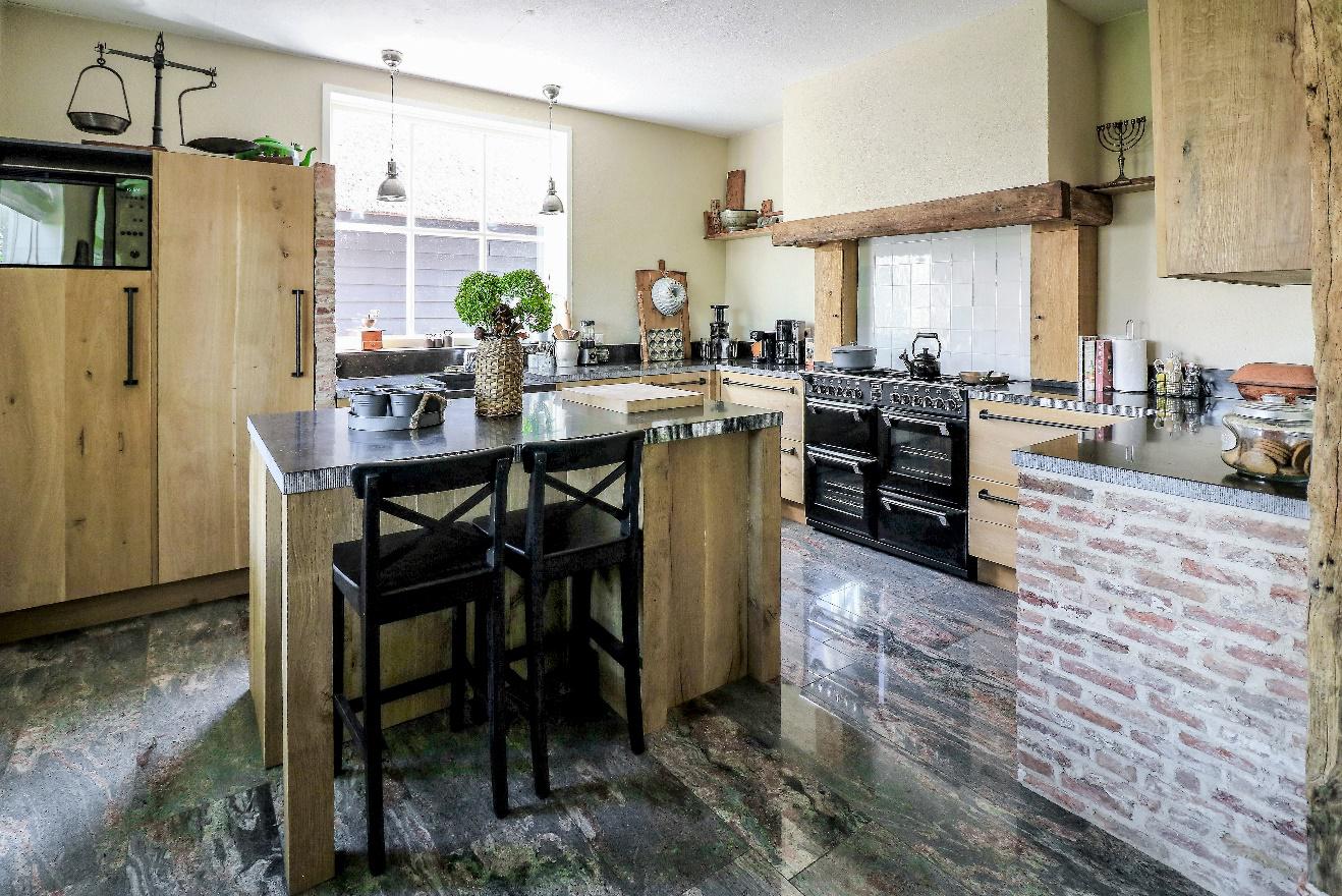 'De klant heeft hierin wel erg meegedacht. We hebben zelf samen panelen geborsteld om het juiste resultaat te behalen. De echt marmeren vloer lag al in het huis en is uniek, deze staat er mooi bij. Let op de oude massieve balk boven het fornuis en de gemetselde muurtjes. Dat is toch wel erg mooi! Qua overig materiaalgebruik is gekozen voor een Belgisch hardsteen blad en stalen grepen. De stalen grepen word ook op maat gemaakt. Voor mij was het de eerst volledig eikenhouten keuken die ik met veel trots afgeleverd heb.'