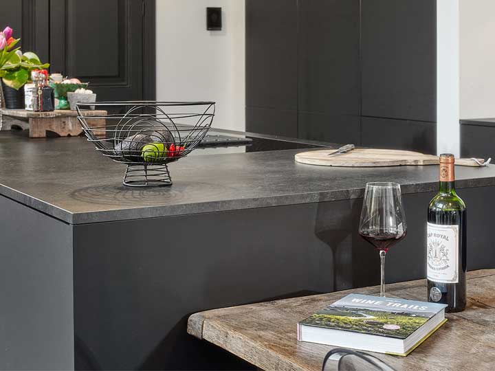 Het werkblad van de luxe keuken is van keramiek, gemêleerd met grijs, zwart en brons. Heel chique in combinatie met matzwart. Keihard als het is kan keramiek goed tegen een stootje.