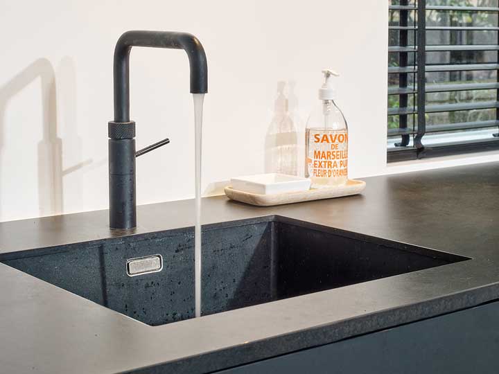 De spoelbak is van matzwarte kunststof. Bijzonder fraai! Met de zwarte Quooker boven de gootsteen is deze keuken compleet in harmonie.