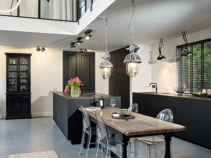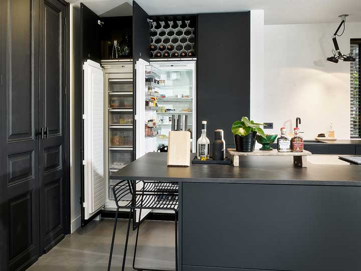 Een matzwarte keuken in een ruimte die in daglicht baadt geeft een bijzondere sfeer. Dat is ook het effect van deze keuken van Adee Keukens uit Rijssen in de verbouwde 19e-eeuwse directeurswoning. Dit huis dient jarenlang als studentenwoning en gaat radicaal op de schop nadat de studenten zijn vertrokken.