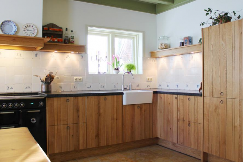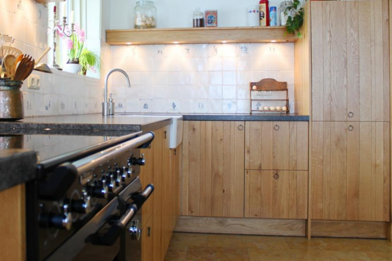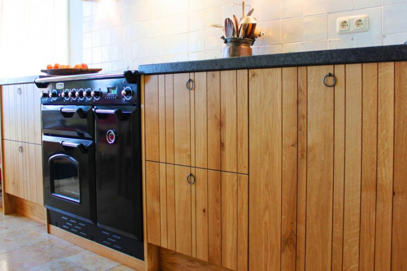 Een persoonlijke keuken doordat deze geheel gemaakt is zoals de familie het wenste. Gemaakt van eikenhout met een ringgreepje voor een tijdloze uitstraling maar wel voorzien van alle moderne gemakken.