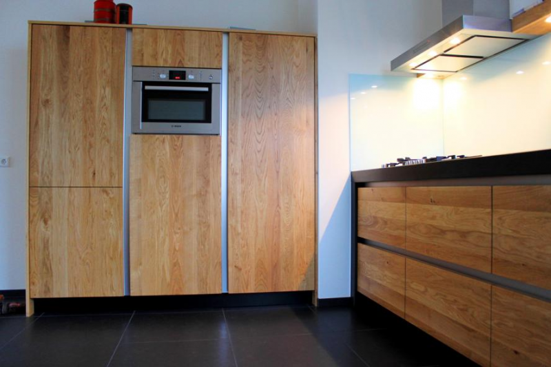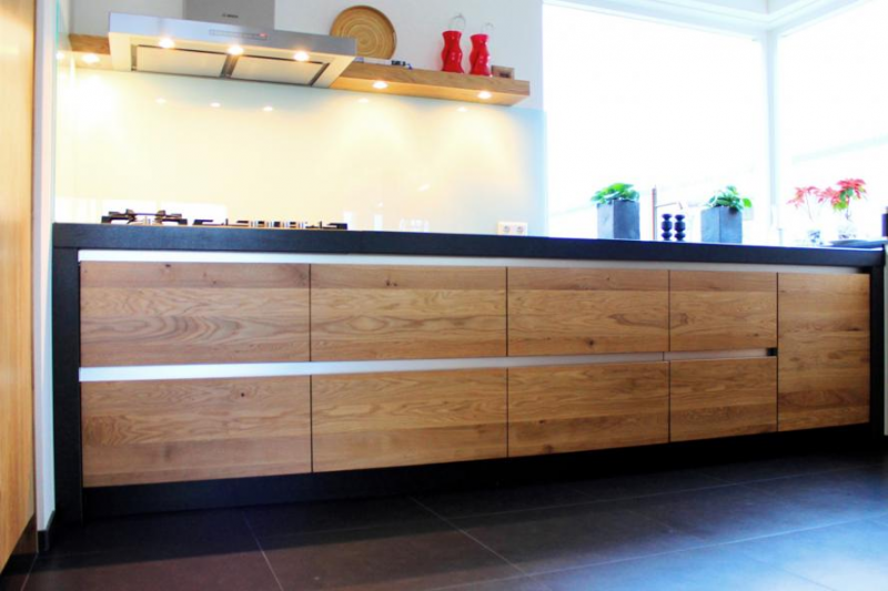 Modern en hout gaat goed samen en dat is in deze Moderne houten keuken goed te zien. Sobere lijnen van fronten en greeplijsten sieren deze keuken.
