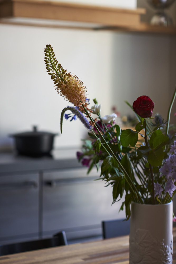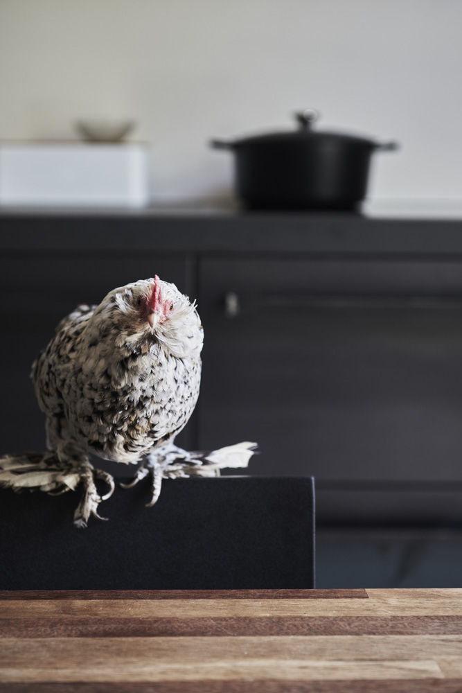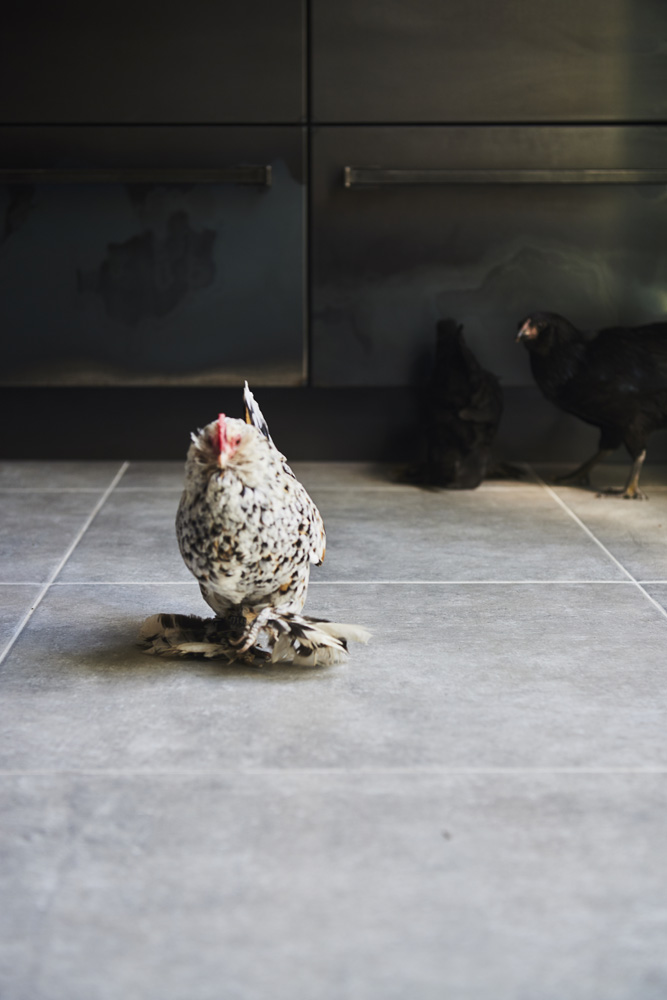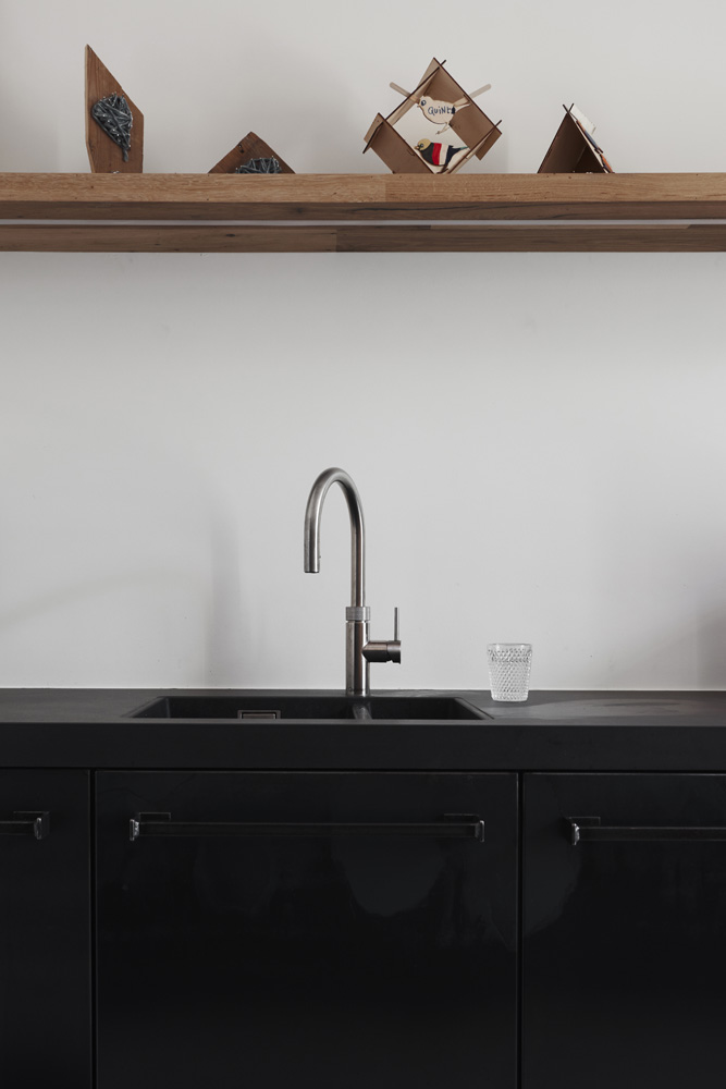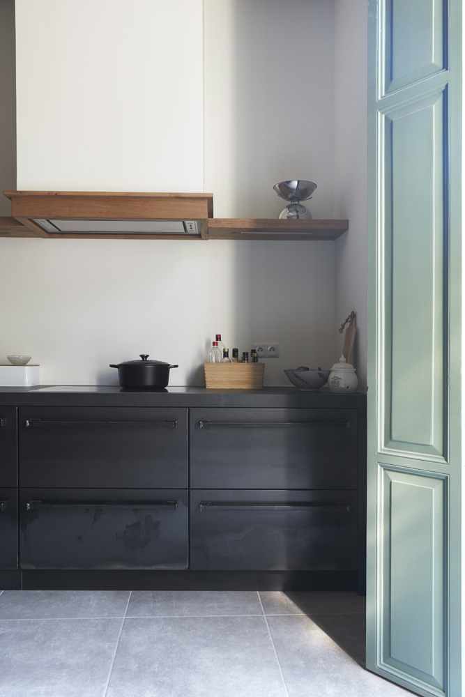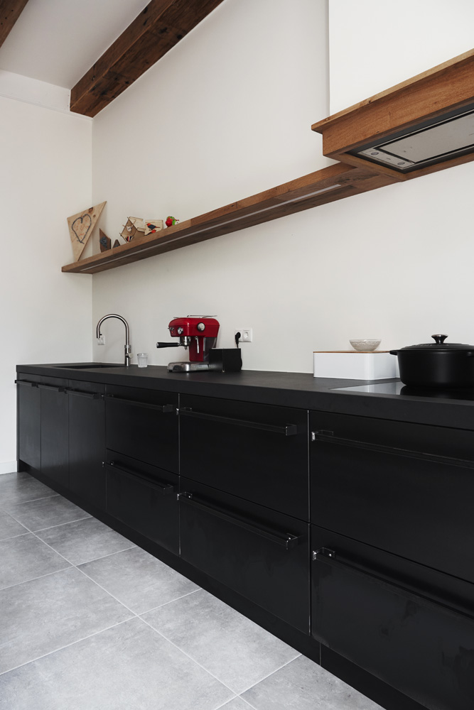 De keuken heeft hardstenen bladen van Belgisch Arduin en heeft oldschool handgrepen.