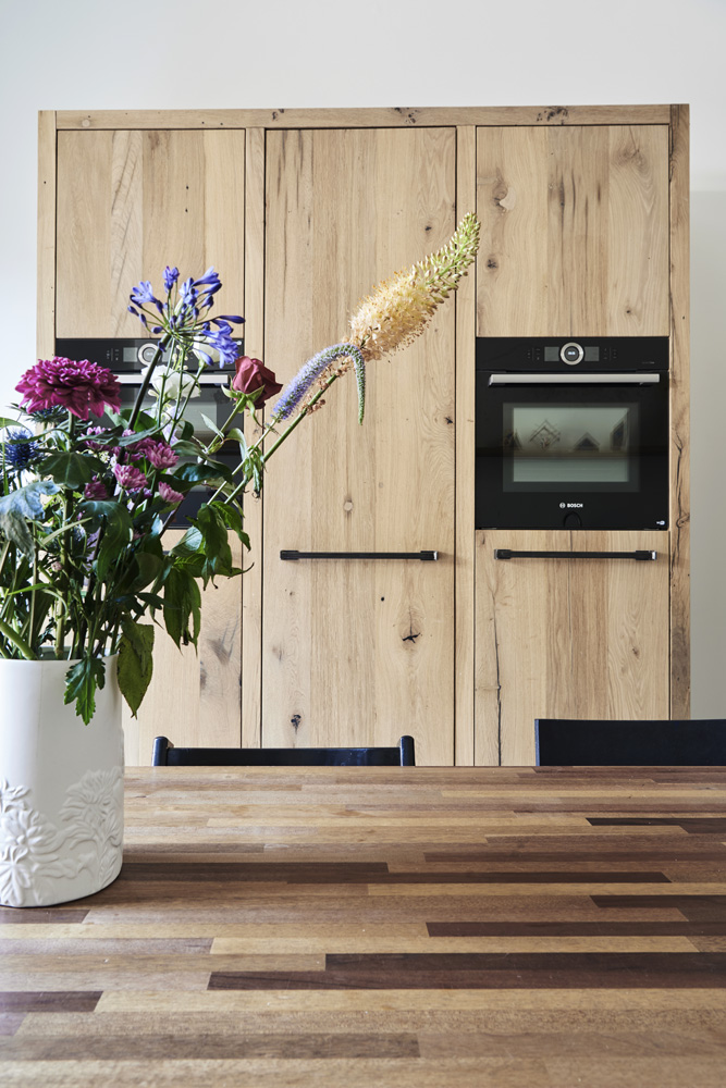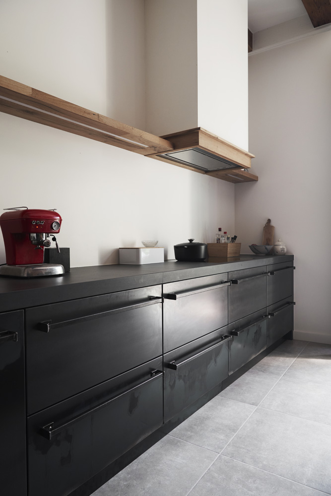 Sfeervolle landelijke keuken met industrieel tintje door blauwstaal en eikenhout.