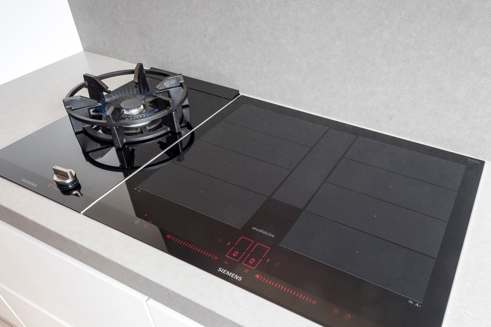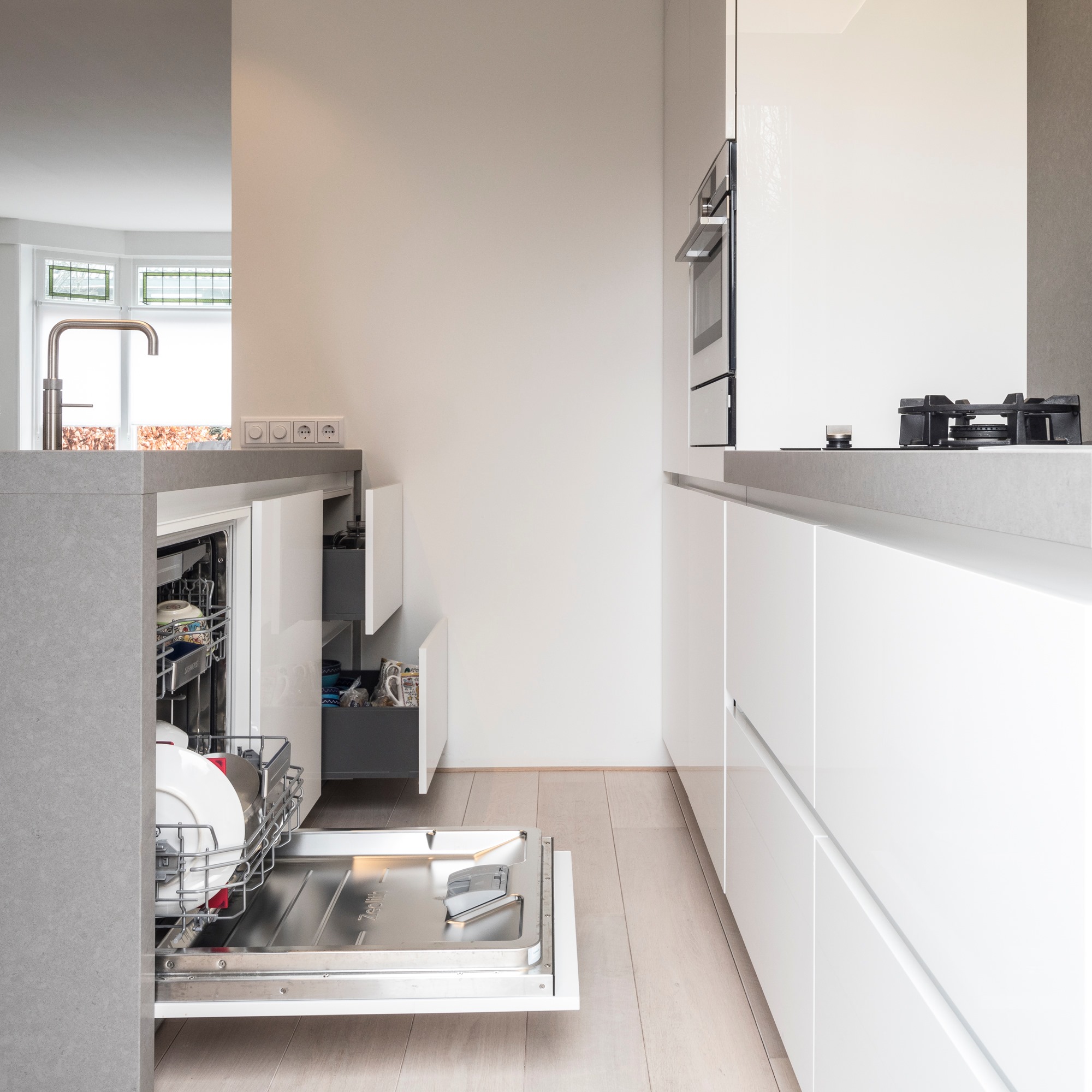 Bij deze keuken was de ruimte zeer beperkt. Door gebruik te maken van het maatwerk van De Keukenvernieuwers lukte het toch om een volwaardige keuken te realiseren die van alle gemakken is voorzien. De opbergkasten en -lades zijn mooi weggewerkt en bieden een hoop ruimte. Het (schier)eiland is multifunctioneel; afwassen, extra werkruimte en je schuift er ook nog eens gezellig aan om een hapje te eten. Het keukenblok aan de muurzijde is ingericht om te koken, met een inductiekookplaat en losse wokbrander.