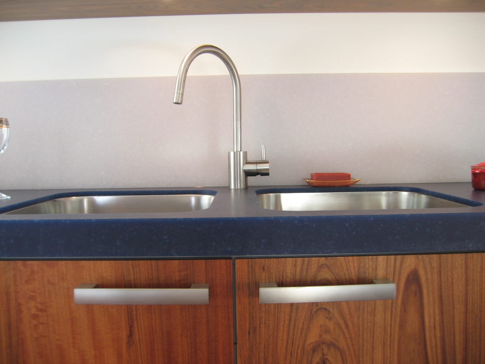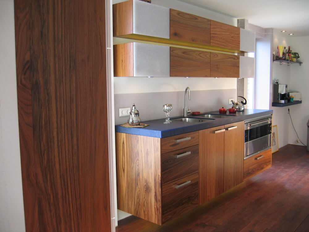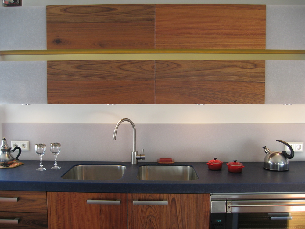 Hiernaast een keuken van massief hout, waarbij voor het blad en een deel van de fronten van de hangkasten gebruik is gemaakt van Avonite (een volkernkunststof). Door de semitransparantie van dit materiaal, ziet het blad er spannend uit en werkt veel zachter en lichter dan in men in eerste instantie verwacht. Het aanrechtblok is in dit geval zwevend opgehangen. Ledverlichting is geïntegreerd in de onderzijde van het aanrechtblok en in de ruimte tussen de twee bovenkasten, die als twee strakke rechte vlakken boven elkaar hangen. Om het doorlopende vlak van het aanrechtblad te accentueren, zijn de beide spoelbakken ondergebouwd. De lades zijn natuurlijk met softclosing en zijn in dit geval uitgevoerd met zijdes van matglas.