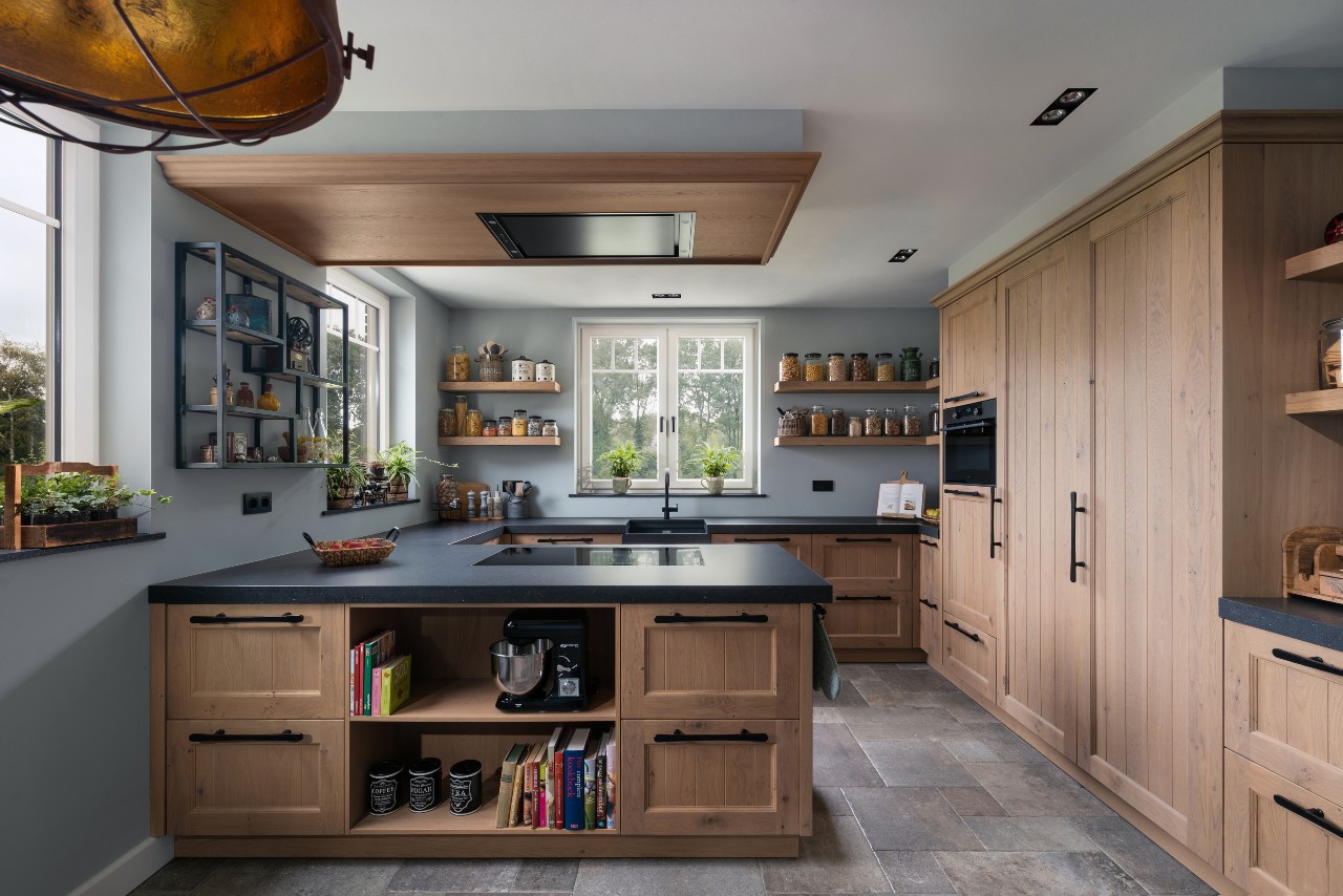 Aan deze keuken is te zien dat alles met zorg en oog voor detail is uitgekozen! Alles is perfect gecombineerd. De klant heeft gekozen voor een wat drukkere structuur in het wildfineer en deze is supermat afgelakt. De schouw met hetzelfde fineer als dat van de fronten maakt deze keuken landelijk. De details maken de keuken een mooi geheel.