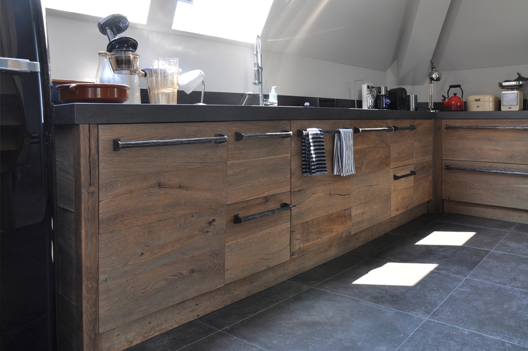 De oud eiken keukens zijn wel heel bijzonder te noemen. Er wordt soms oud eikenhout verwerkt van meer dan 150jaar oud. In combinatie met blauwstaal geperste grepen en een betonnen werkblad geeft dit een wel een heel apart eindresultaat. Steeds wisselende partijen hout geven bovendien garantie op een unieke keuken. Na verloop van tijd is het hout immers niet meer beschikbaar.
