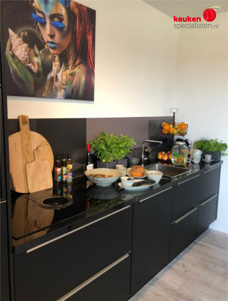 De mooie donkere keukenfronten zijn van ons eigen Keukenspecialisten.nl merk A.I. Küchen (Kleur: 317 touch ) afgewerkt met zwarte plinten.