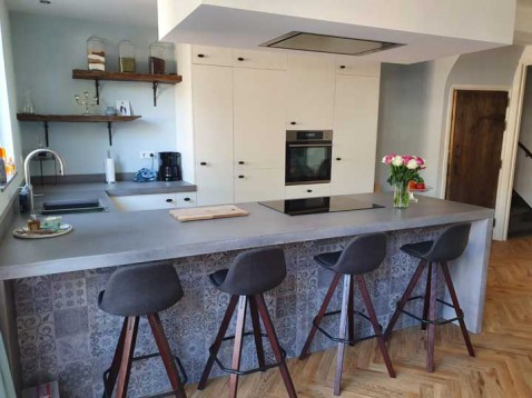 Elise wijst op haar keukenblad. ‘Dat is composiet, op aanraden van de keukendesigner van SieMatic. Volgens hem was de beste keuze omdat het praktisch is met kleine kinderen, goed te onderhouden. En dat klopt helemaal! Het blad is uitgevoerd in hoogglans wit, maar een doekje erover en het is schoon. Ik ben trouwens niet de enige die zo met die keuken wegloopt. Toen ik mijn verbouwingsvlog deelde en dus mijn keuken onthulde, was de hoeveelheid reacties overweldigend.’