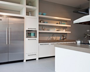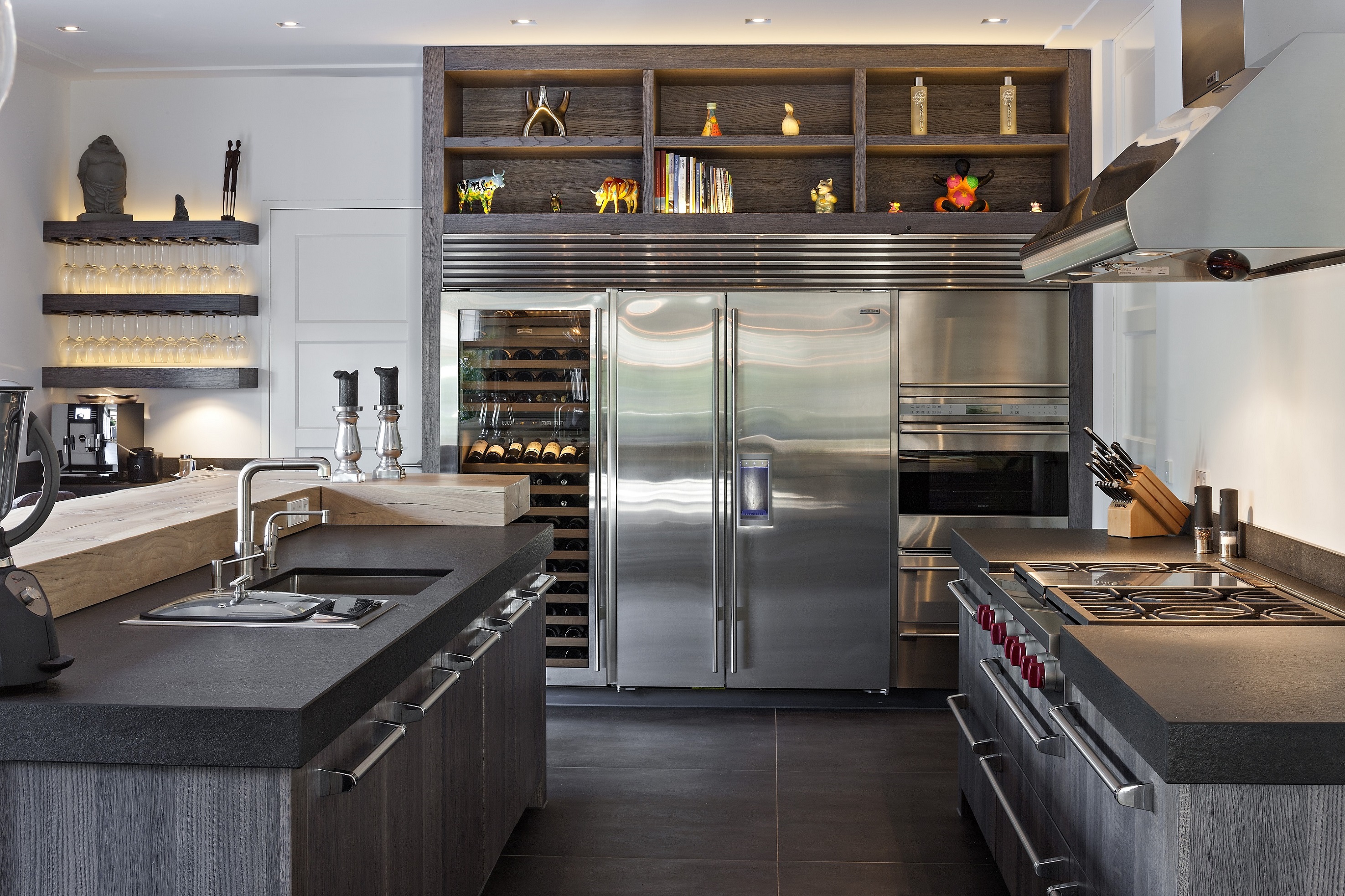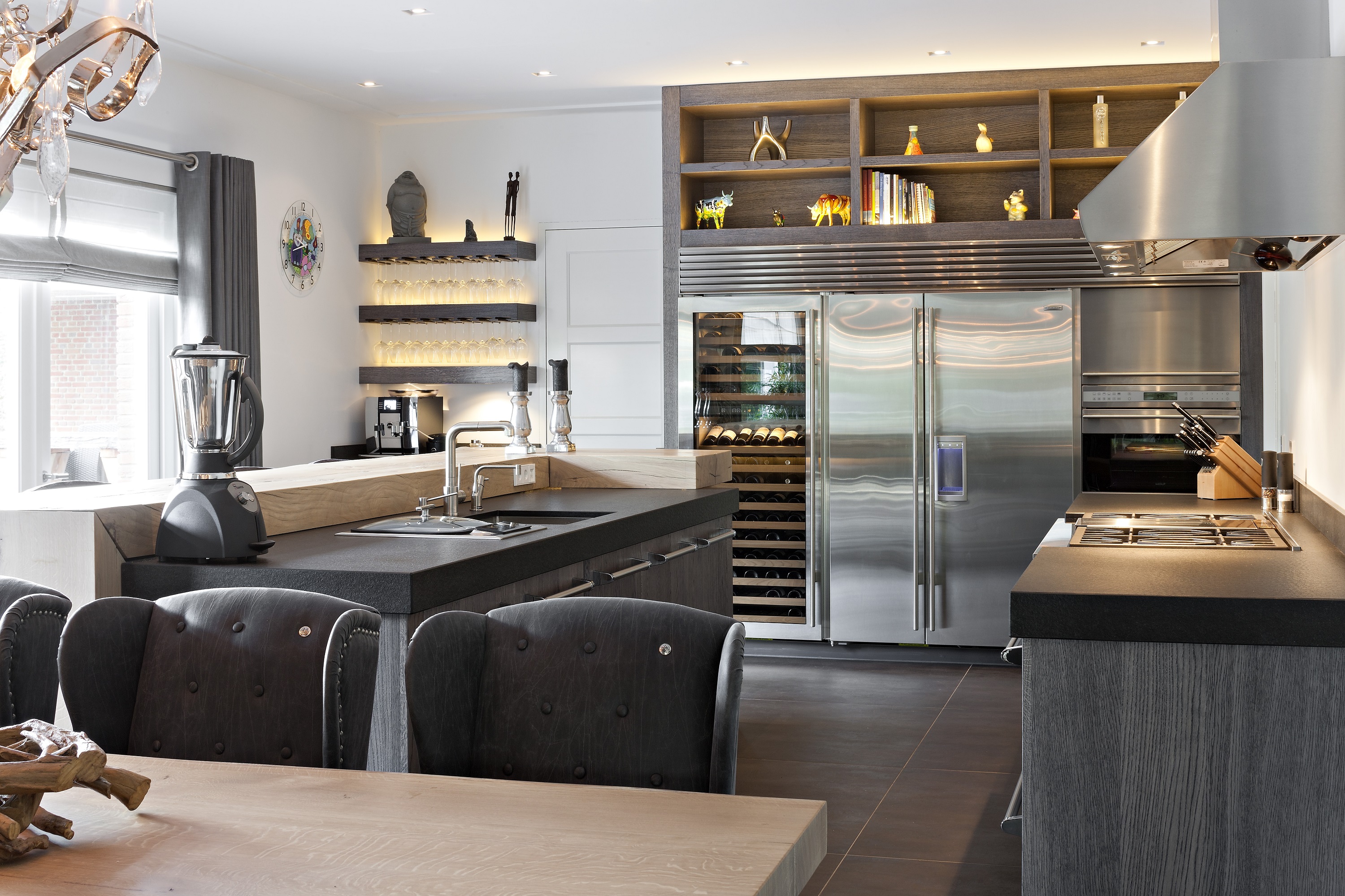 Uitvoering keuken in massief eikenhout in de kleur New York. Binnenkasten watervast verlijmt berken multiplex.
