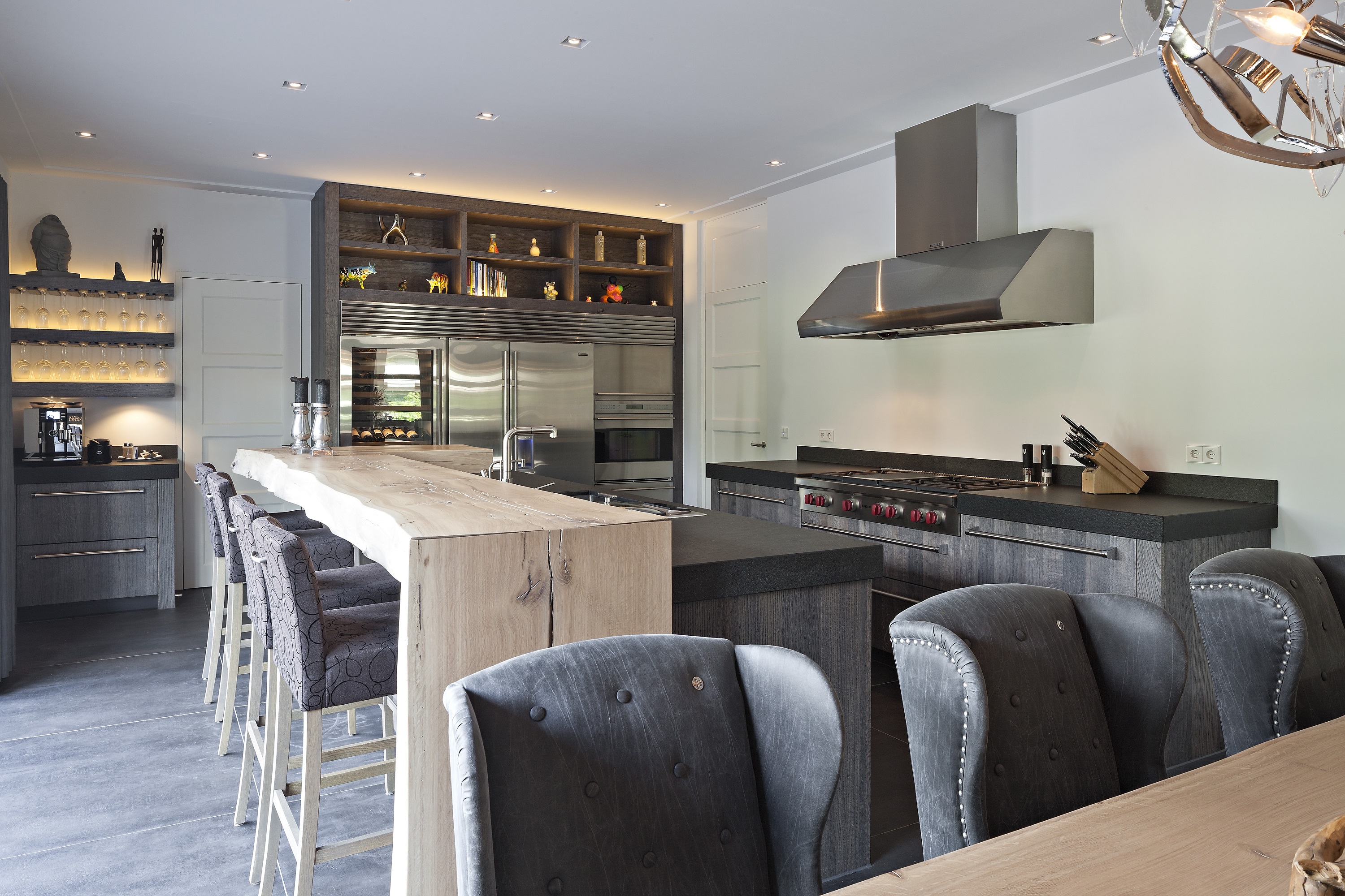Uigebreide maatwerkkeuken met een massieve boomstam als bar.