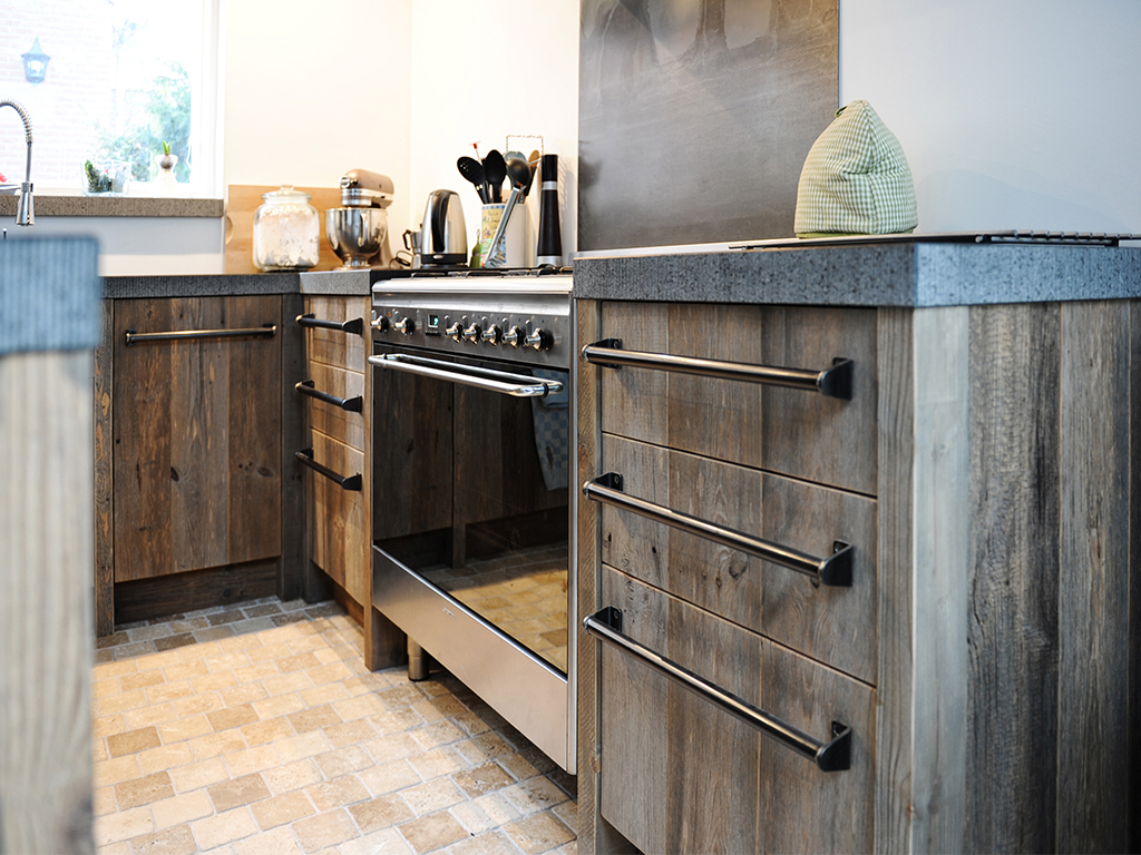 Voorbeelden van onze keukens zijn oud eikenhout, steigerhout, barnwood of bijvoorbeeld sloophout. Een ander gooit het weg, wij zien een uniek soort hout welke uitstekend geschikt is voor het verwerken in keukens. Het oude hout is doorleefd door onder andere de weersinvloeden, waardoor een authentieke sfeer ontstaat.