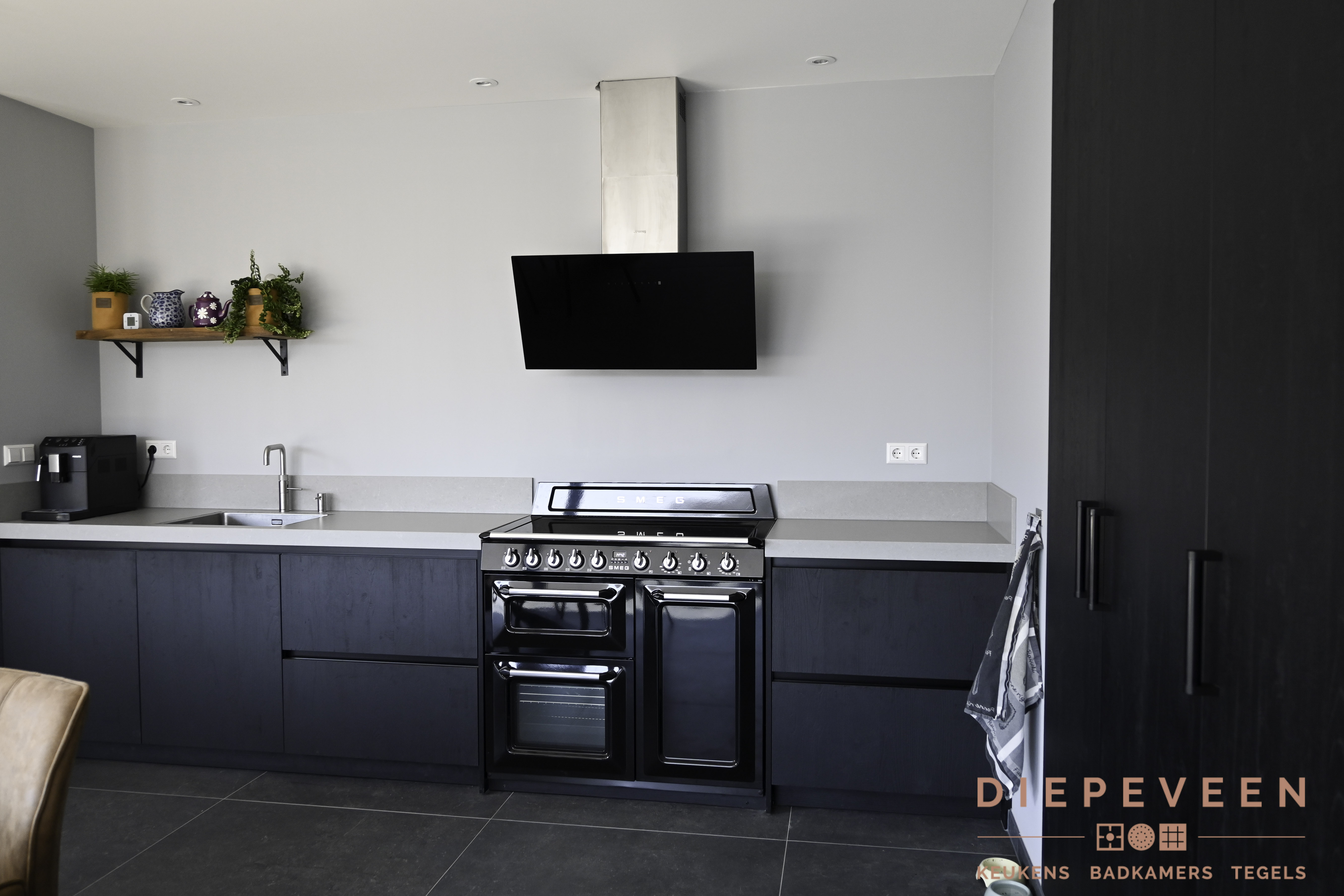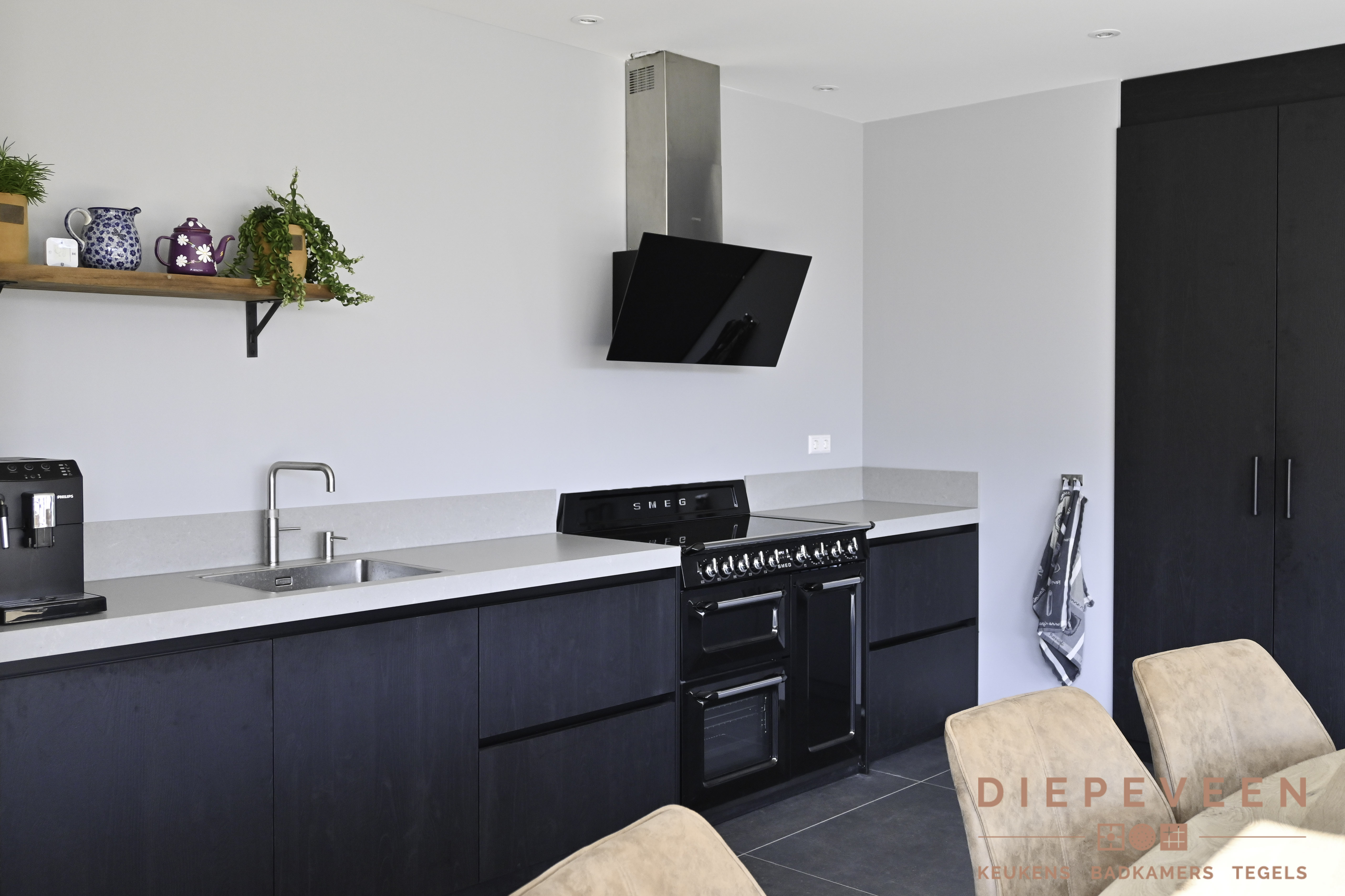 Het eerste wat opvalt in deze keuken is het prachtige zwarte fornuis van Smeg. Dit fornuis heeft in plaats van gas een inductie kookplaat wat tegelijkertijd ook nog eens milieu vriendelijk is. De afzuigkap is in zwart en in moderne stijl dit zet het fornuis extra in de kijk.