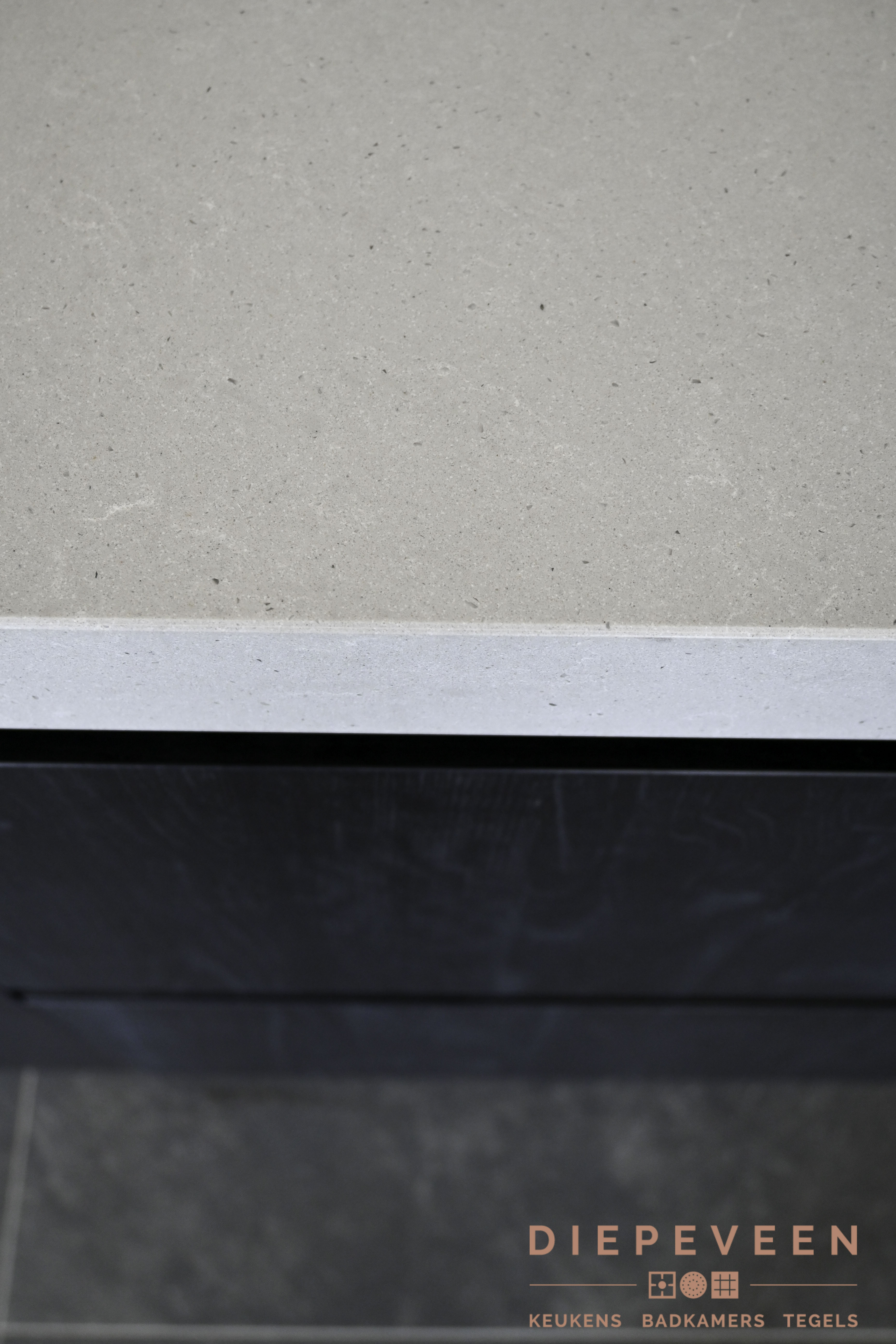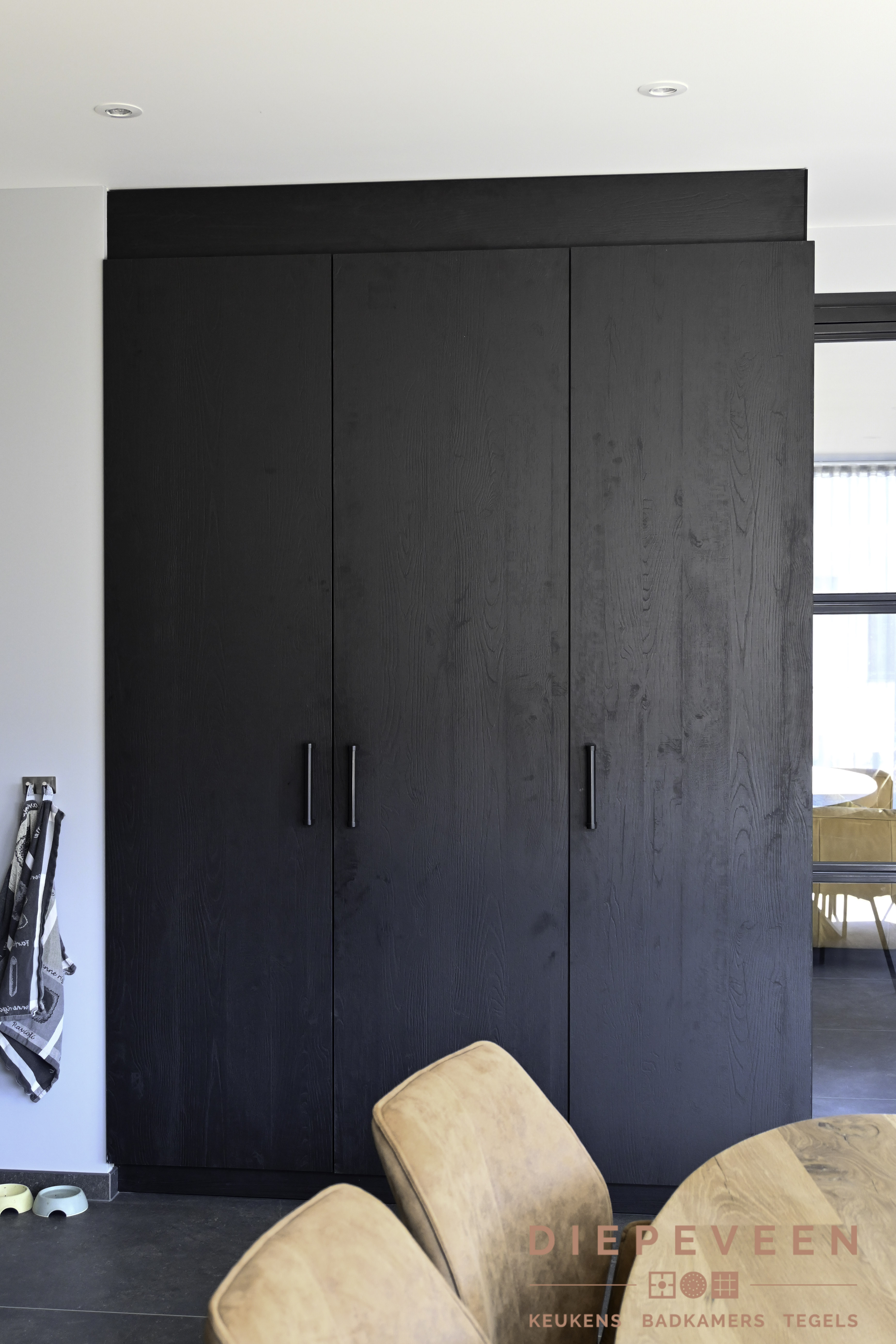 De klanten kozen bij deze keuken voor een houtlook zwart greeploos front in combinatie met een zachte zandkleurig composiet werkblad. De kastenwand heeft grote lange zwarte grepen. De quooker kraan maakt de keuken compleet met de strakke look en de luxe van direct 100graden warm en ijskoud water.