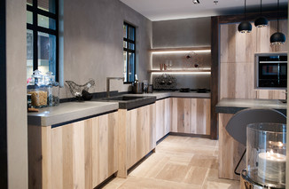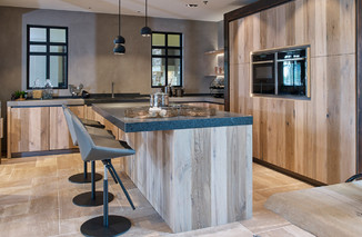 - Kleur: Gebeitst, nagedoekt, verouderd eiken, met beton, graniet & koper