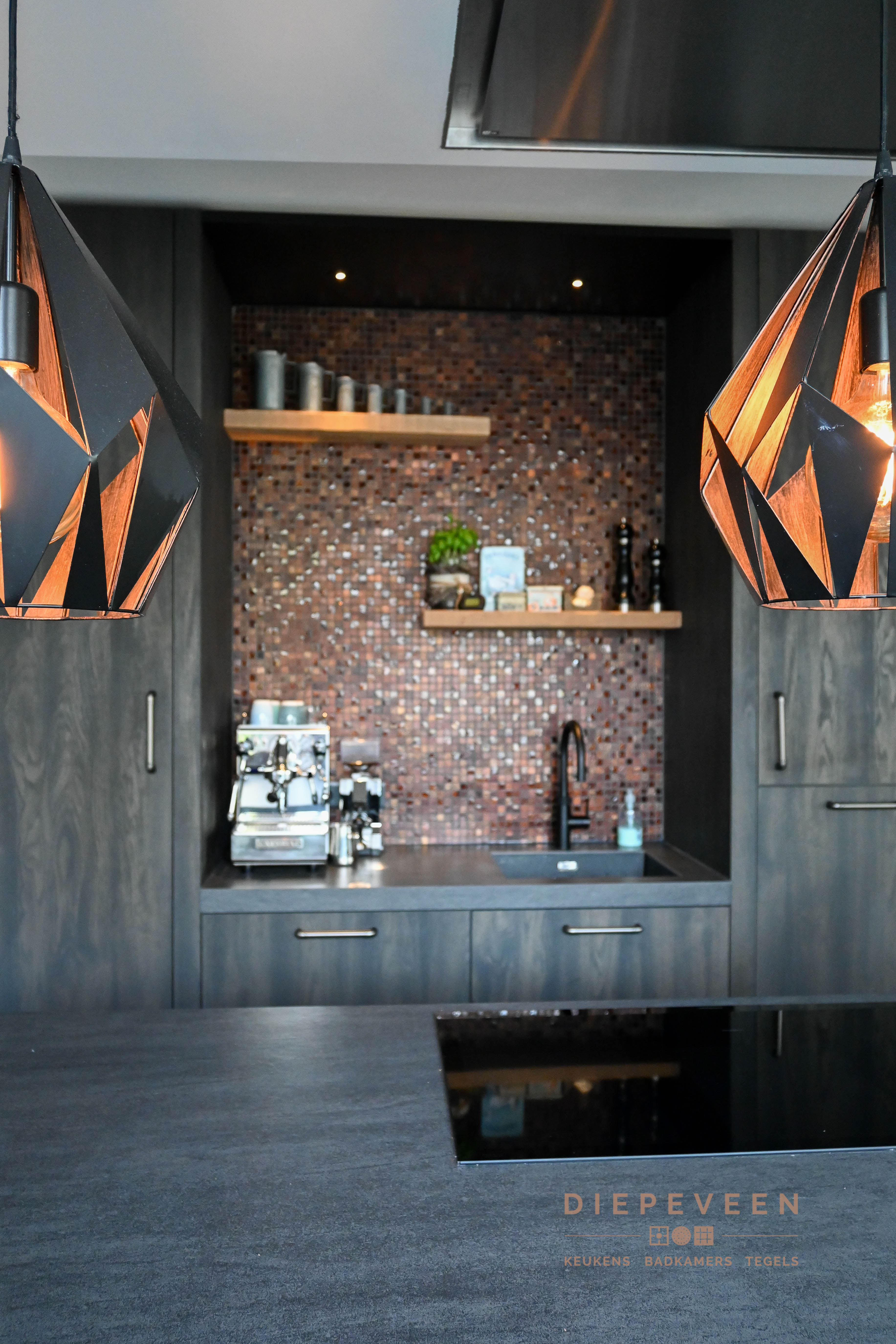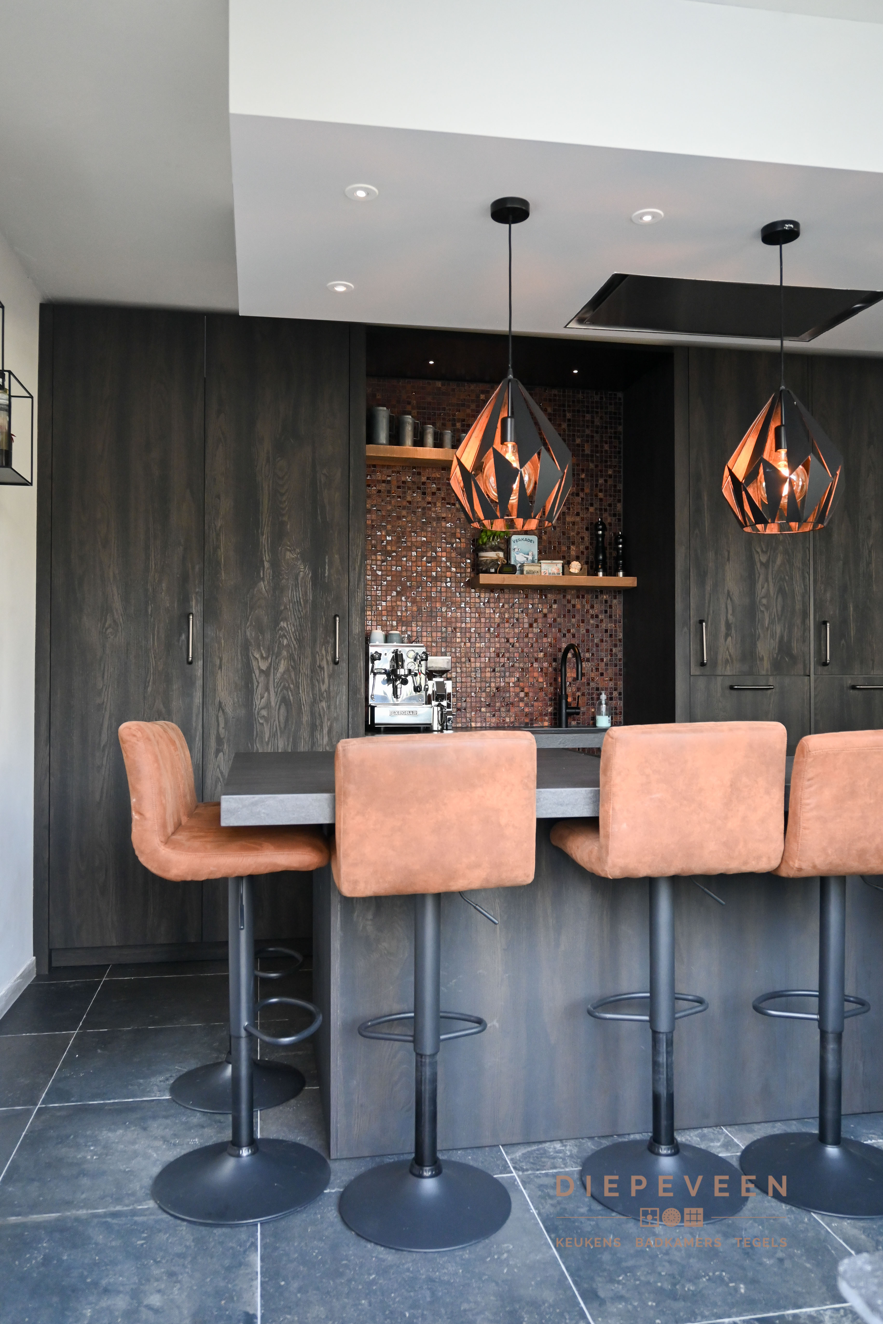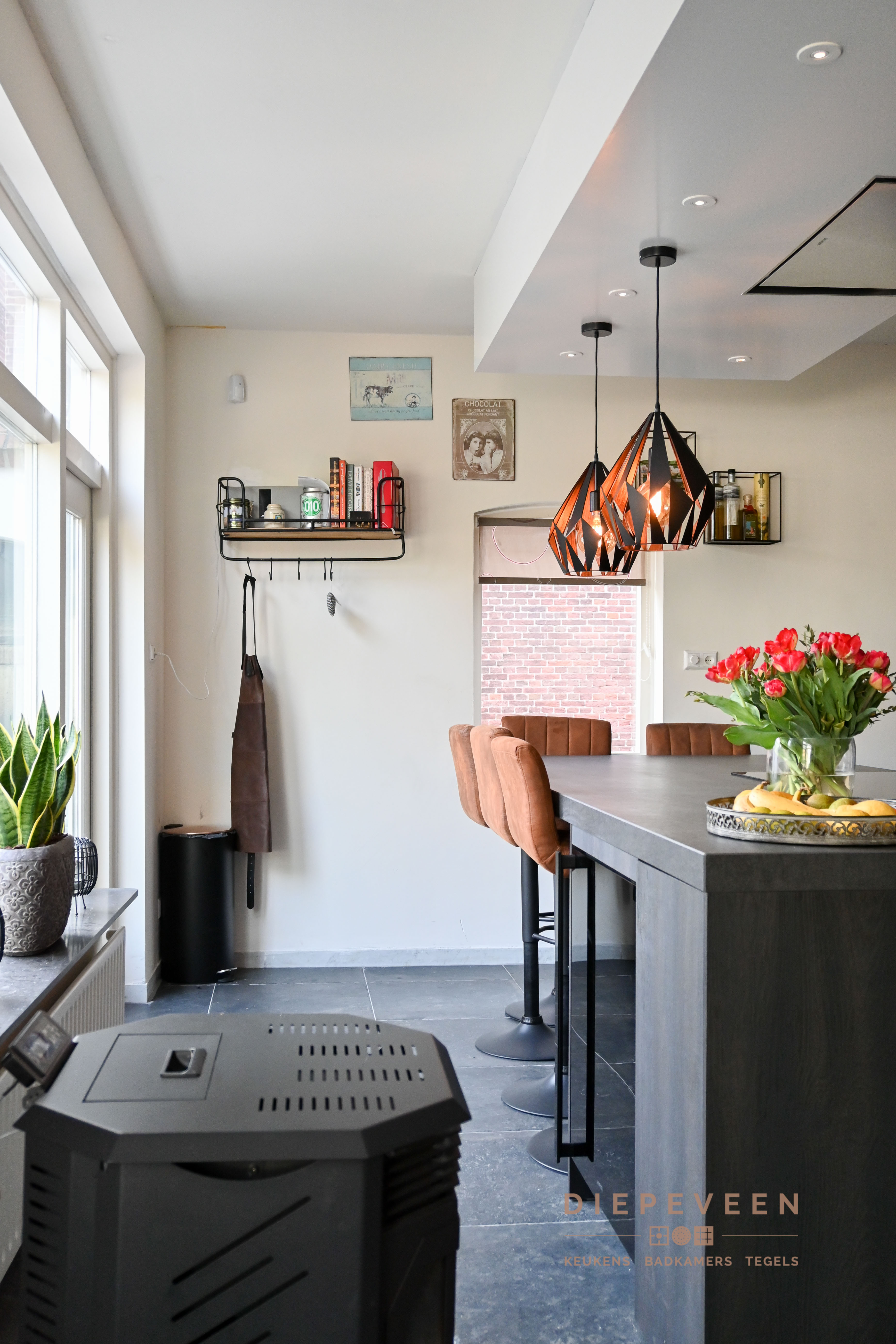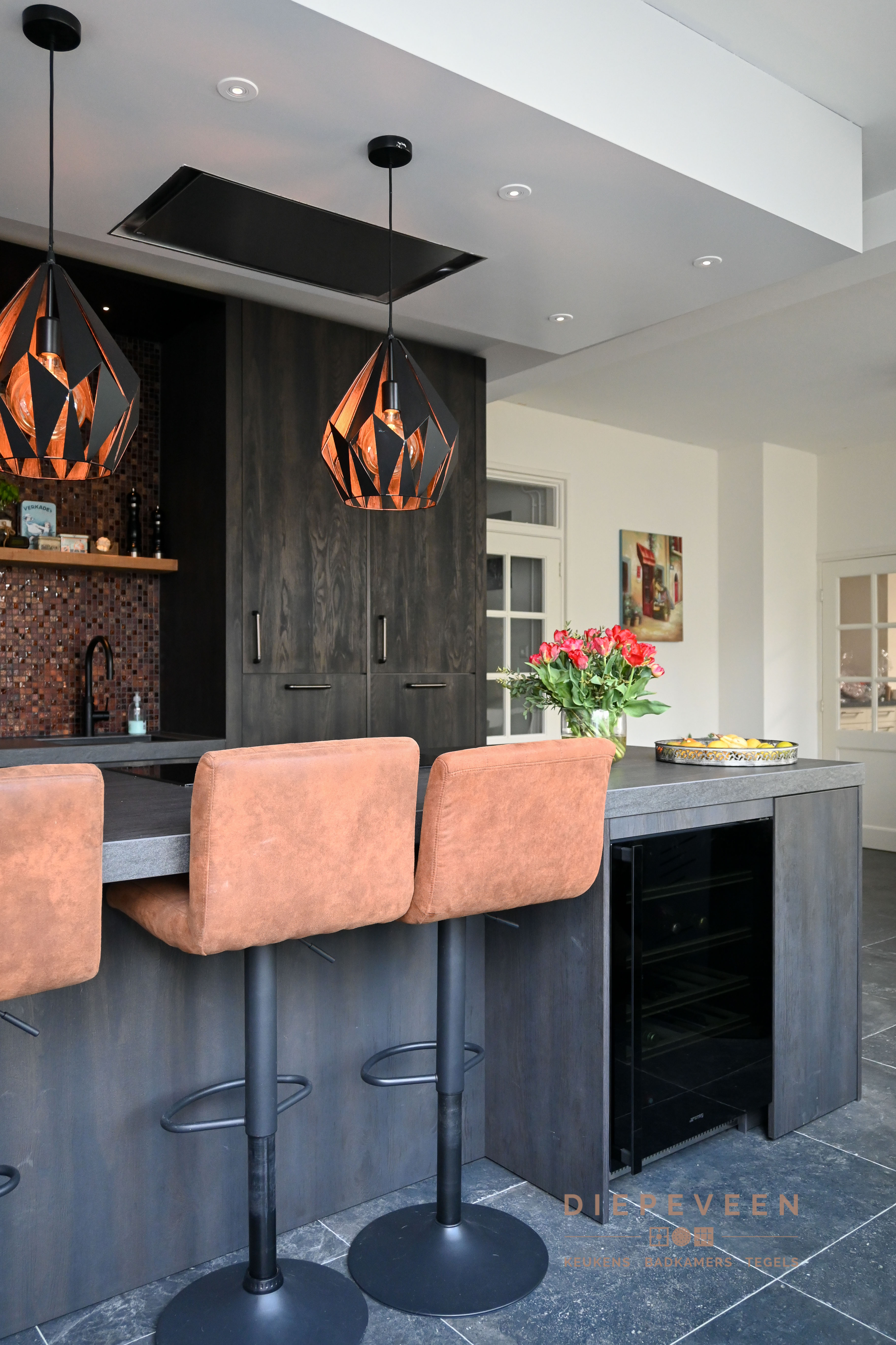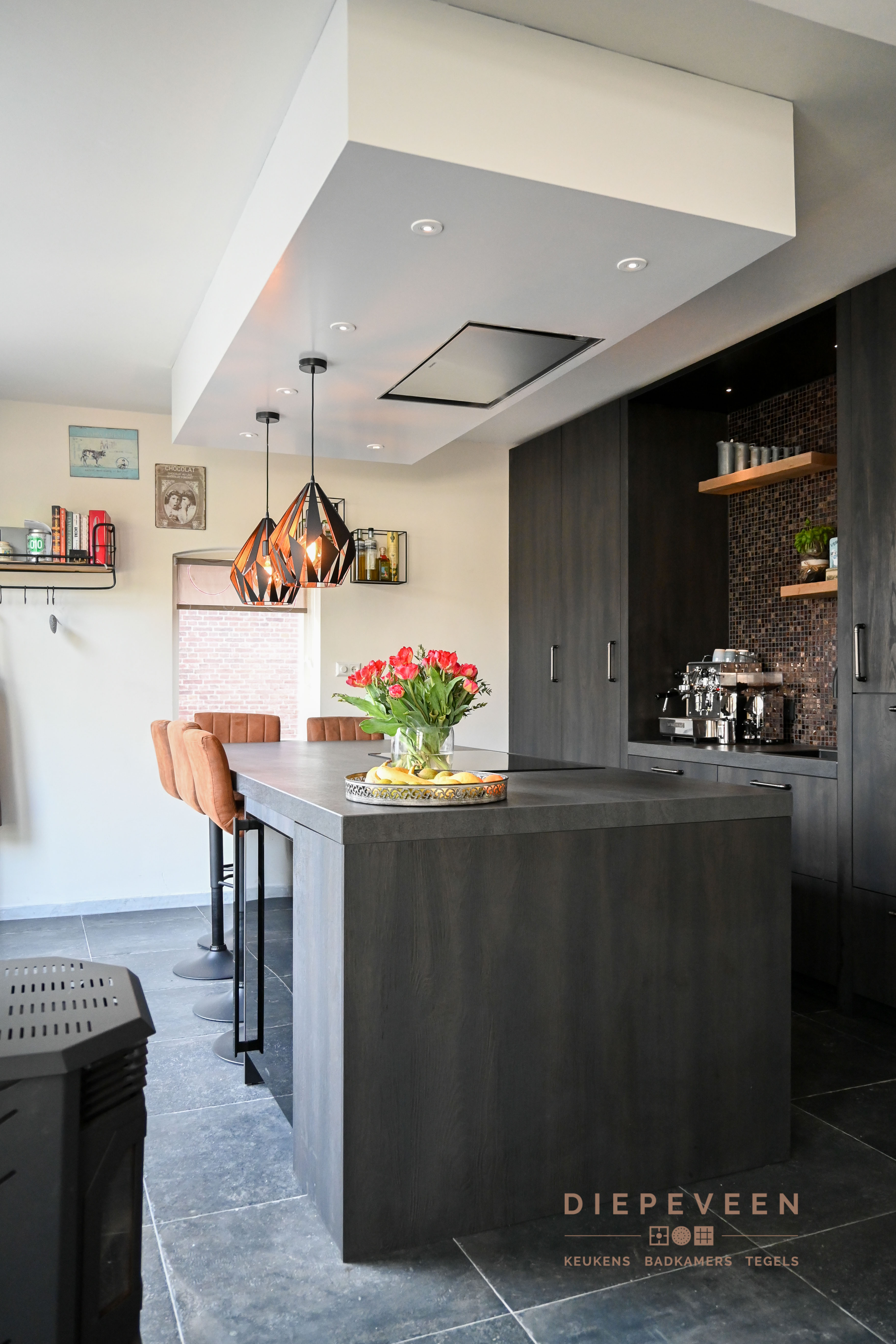 De keuken met een wauw effect. Uniek, landelijk, authentiek en tevens praktisch. Voorzien van een inductiekookplaat met 5 kookzones, multifunctionele oven met wel 10 verwarmingssystemen, intergreerbare koelkast, wijnklimaatkast, volledig intergreerbare vaatwasmachine en een Quooker kraan. Kortom, altijd kookplezier!