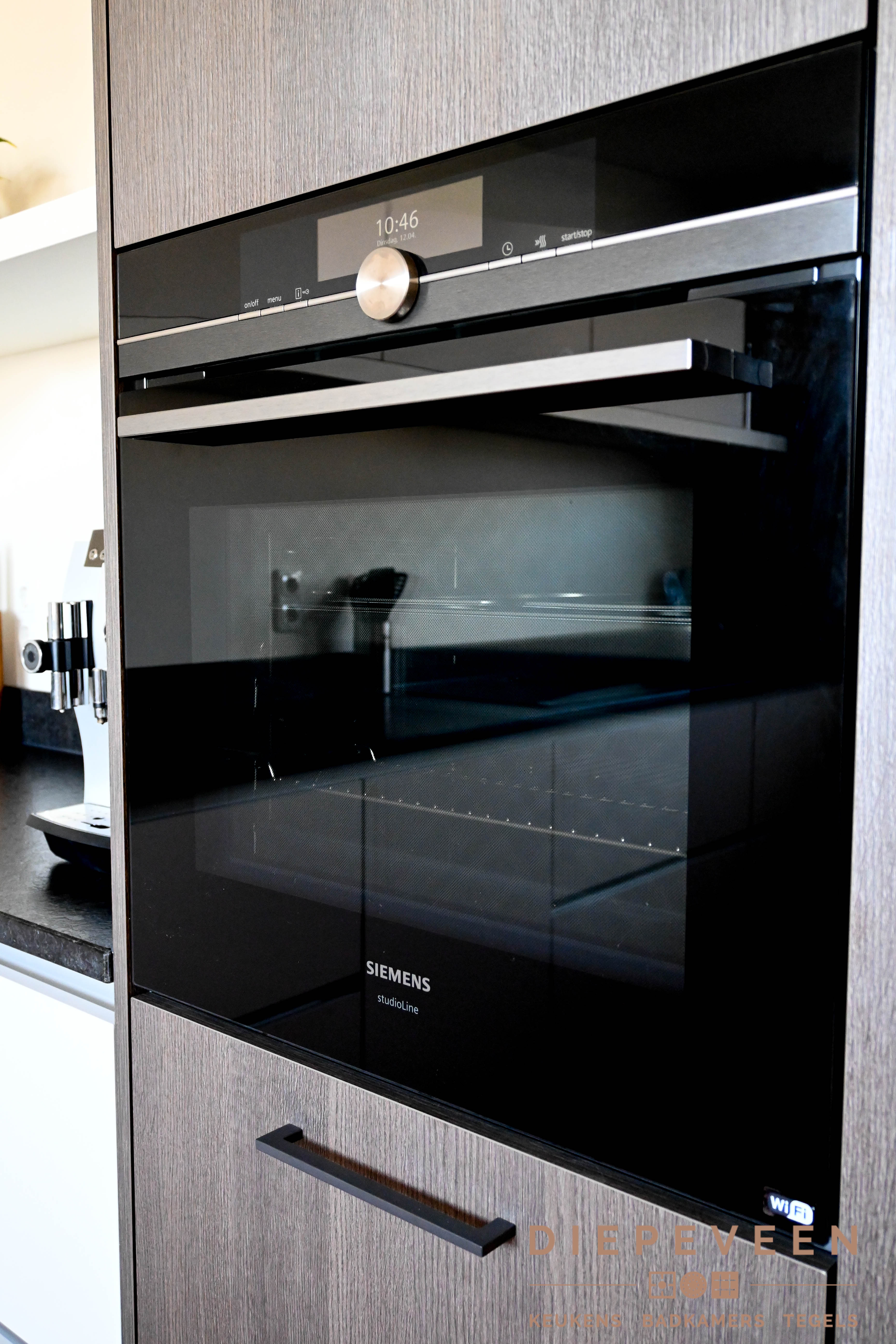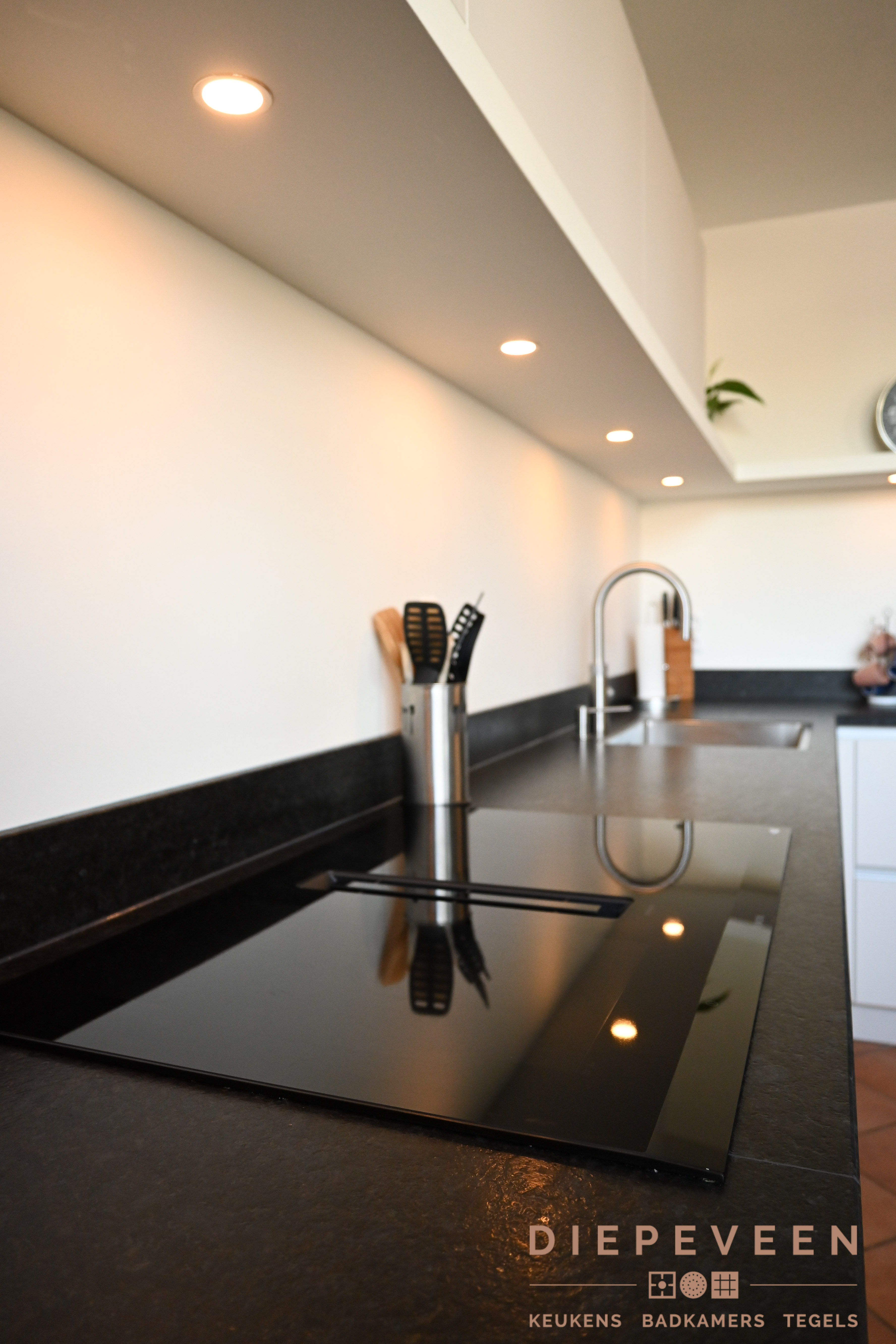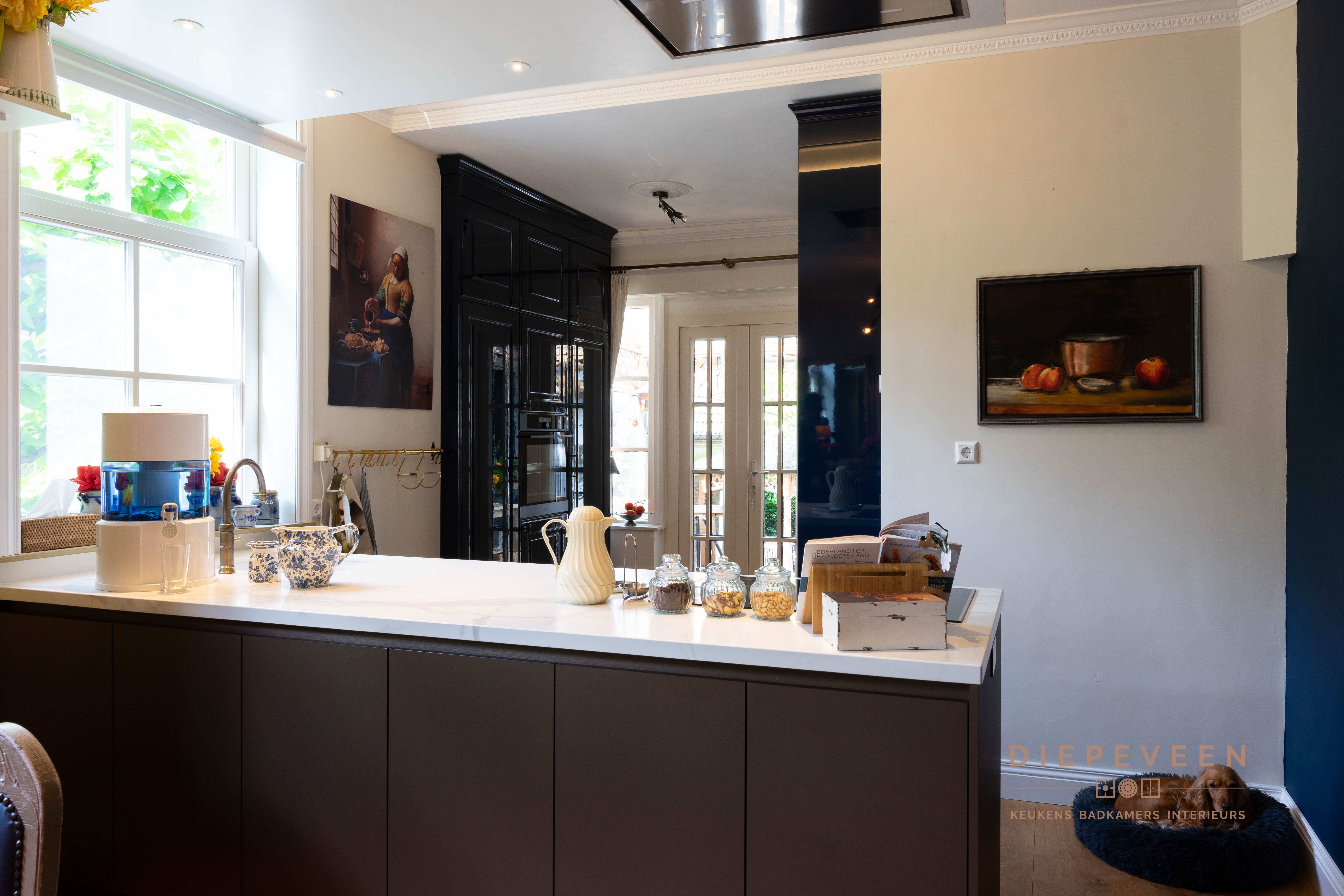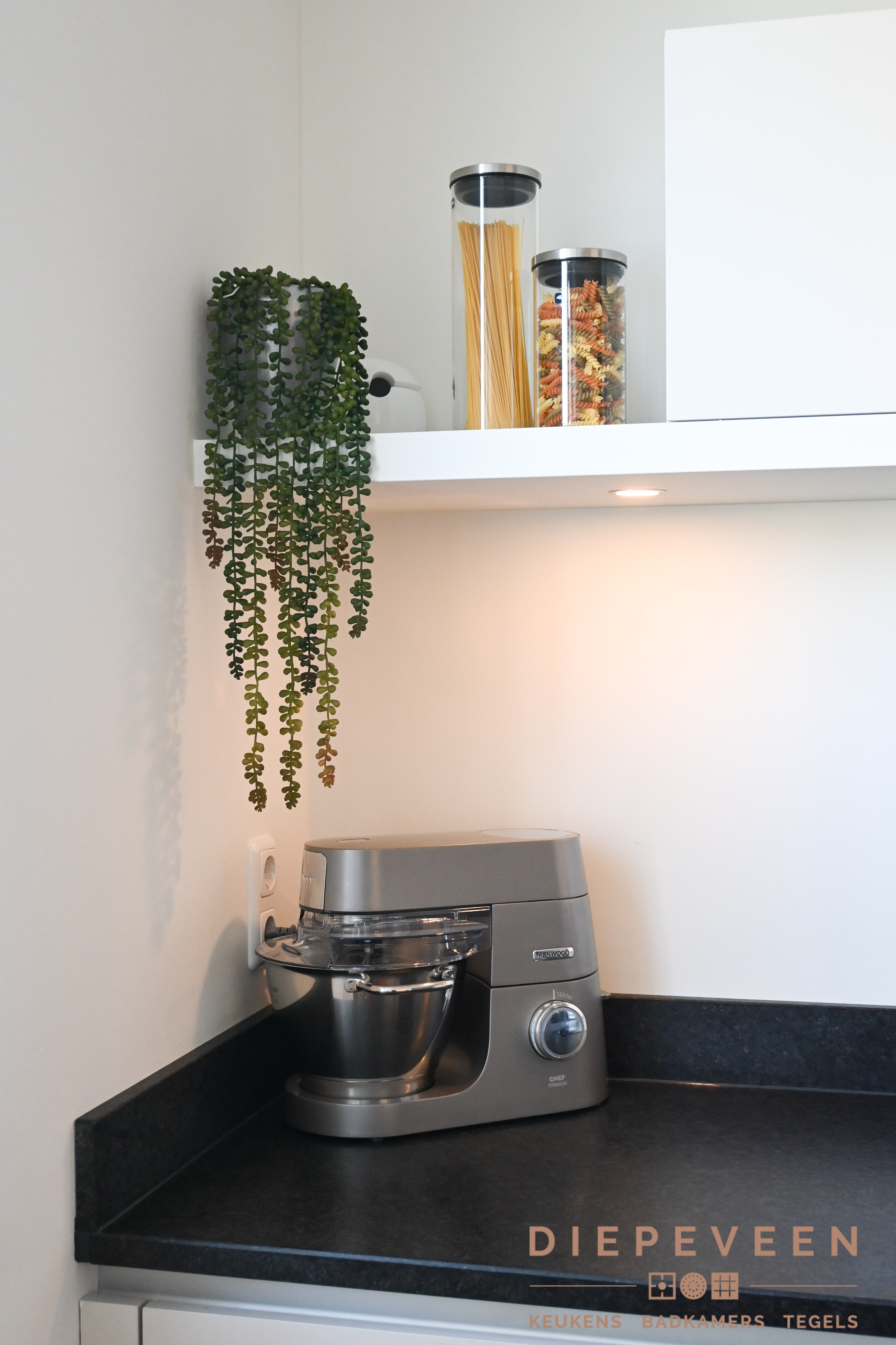 Ruimte in de keuken dat wil iedereen. Maar wat nog belangrijker is, de indeling en hoeveelheid opbergruimte. Aan deze twee elementen en nog veel meer is gedacht. Zo is de keuken is een hoek geplaatst zodat er genoeg doorloopruimte ontstaat, en dit tegelijkertijd praktisch zorgt voor meer dan genoeg opbergruimte. De nis en de witte plank zijn opgevuld met bijpassende accessoires. De sfeerverlichting geeft de keuken een warme uitstraling.