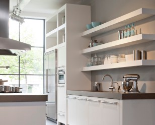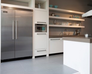 Witte massief eiken keuken. Gemaakt door Paul van de Kooi. De binnenkasten (corpus) van de keukens zijn gemaakt van watervast verlijmt berken multiplex. Laden zijn volledig uittrekbaar en van massief beukenhout. Het werkblad is van keramiek, koel/vries combinatie en fornuis / afzuigkap van Viking. De opstelling straalt een grote mate van rust uit omdat de keuken opgebouwd is uit maatwerk. Geen standaardkasten maar maatwerk waardoor er een bepaalde symmetrie kan ontstaan.